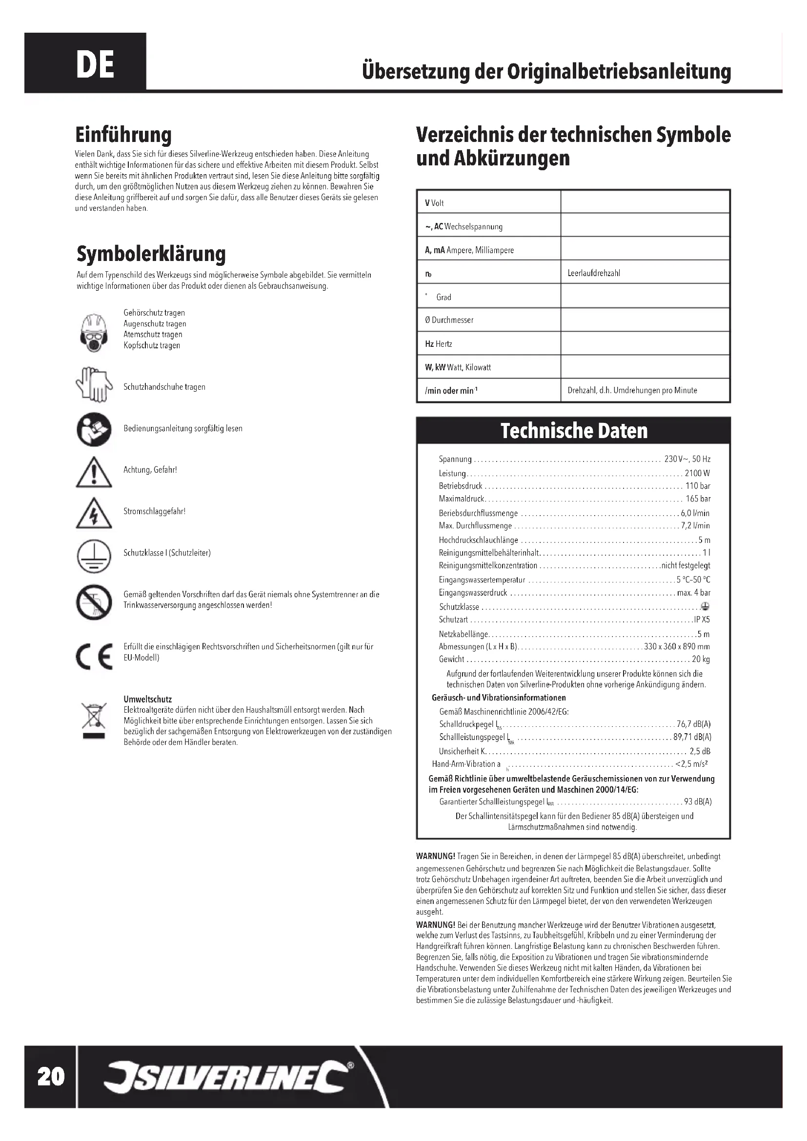 WARNUNG! TragenSieinBereichen,indenenderLärmpegel85dB(A)überschreitet,unbedingtangemessenenGehörschutzundbegrenzenSienachMöglichkeitdieBelastungsdauer.SolltetrotzGehörschutzUnbehagenirgendeinerArtauftreten,beendenSiedieArbeitunverzüglichundüberprüfenSiedenGehörschutzaufkorrektenSitzundFunktionundstellenSiesicher,dassdiesereinenangemessenenSchutzfürdenLärmpegelbietet,dervondenverwendetenWerkzeugenausgeht.WARNUNG! Bei der Benutzung mancher Werkzeuge wird der Benutzer Vibrationen ausgesetzt, welchezumVerlustdesTastsinns,zuTaubheitsgefühl,KribbelnundzueinerVerminderungderHandgreifkraftführenkönnen.LangfristigeBelastungkannzuchronischenBeschwerdenführen.BegrenzenSie,fallsnötig,dieExpositionzuVibrationenundtragenSievibrationsminderndeHandschuhe.VerwendenSiediesesWerkzeugnichtmitkaltenHänden,daVibrationenbeiTemperaturenunterdemindividuellenKomfortbereicheinestärkereWirkungzeigen.BeurteilenSiedie Vibrationsbelastung unter Zuhilfenahme der Technischen Daten des jeweiligen Werkzeuges und bestimmenSiediezulässigeBelastungsdauerund-häugkeit. Übersetzung der Originalbetriebsanleitung Verzeichnis der technischen Symbole und Abkürzungen Symbolerklärung AufdemTypenschilddesWerkzeugssindmöglicherweiseSymboleabgebildet.SievermittelnwichtigeInformationenüberdasProduktoderdienenalsGebrauchsanweisung.Gehörschutz tragen Augenschutz tragenAtemschutz tragenKopfschutz tragenSchutzhandschuhetragenBedienungsanleitungsorgfältiglesenAchtung, Gefahr!Stromschlaggefahr!SchutzklasseI(Schutzleiter)GemäßgeltendenVorschriftendarfdasGerätniemalsohneSystemtrennerandieTrinkwasserversorgung angeschlossen werden!ErfülltdieeinschlägigenRechtsvorschriftenundSicherheitsnormen(giltnurfürEU-Modell)Umweltschutz ElektroaltgerätedürfennichtüberdenHaushaltsmüllentsorgtwerden.NachMöglichkeitbitteüberentsprechendeEinrichtungenentsorgen.LassenSiesichbezüglichdersachgemäßenEntsorgungvonElektrowerkzeugenvonderzuständigenBehördeoderdemHändlerberaten. Einführung VielenDank,dassSiesichfürdiesesSilverline-Werkzeugentschiedenhaben.DieseAnleitungenthältwichtigeInformationenfürdassichereundeffektiveArbeitenmitdiesemProdukt.SelbstwennSiebereitsmitähnlichenProduktenvertrautsind,lesenSiedieseAnleitungbittesorgfältigdurch,umdengrößtmöglichenNutzenausdiesemWerkzeugziehenzukönnen.BewahrenSiedieseAnleitunggriffbereitaufundsorgenSiedafür,dassalleBenutzerdiesesGerätssiegelesenund verstanden haben.