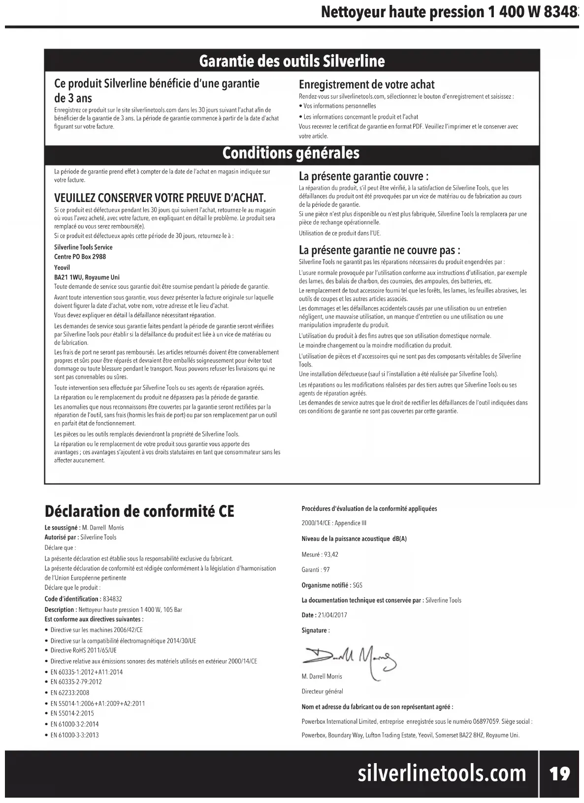 - Ihre persönlichen Angaben• ProduktdetailsundKaunformationenSobalddieserArtikelregistriertwordenist,wirdIhreGarantiebescheinigungimPDF-Formaterzeugt.BittedruckenSiesieausundbewahrenSiesiezusammenmitIhremProduktauf.Der Garantiezeitraum beginnt mit dem Kaufdatum im Einzelhandel, das auf dem Kaufbeleg angegeben ist. BITTE BEWAHREN SIE DEN KAUFBELEG AUF! Falls dieser Artikel innerhalb von 30 Tagen nach dem Kauf einen Defekt aufweisen sollte, bringenSieesbittemitIhremKaufbelegzudemFachhändler,beidemesgekauftwurde,undinformierenSieihnüberdieMängel.DasGerätwirddaraufhinersetztoderderKaufpreiszurückerstattet.Falls dieser Artikel nach Ablauf von 30 Tagen nach dem Kauf einen Mangel aufweist, senden Sieesbittean:Silverline Tools Service CentrePO Box 2988YeovilBA21 1WU, GroßbritannienDerGarantieanspruchmusswährendderGarantiezeitgestelltwerden.SiemüssendenOriginalkaufbelegmitAngabedesKaufdatumseinreichenundIhrenNamenundIhreAdressesowiedenOrtdesKaufsangeben,bevoretwaigeArbeitendurchgeführtwerden können.SiemüssengenaueAngabenüberdenzubehebendenDefektmachen.AlleinnerhalbderGarantiefristgemachtenForderungenwerdenvonSilverlineToolsdaraufhinüberprüftwerden,obessichbeidenMängelnumeinenMaterial-oderFertigungsfehlerhandelt.Versandkostenwerdennichtzurückerstattet.AlleArtikelsolltensichinsauberemundsicheremZustandbendenundsorgfältigverpacktzurReparatureingeschicktwerden,umSchädenoderVerletzungenwährenddesTransportszuvermeiden.DieAnnahmeunangemesseneroderunsicherer Lieferungen kann von uns verweigert werden.AlleArbeitenwerdenvonSilverlineToolsoderseinenautorisiertenReparaturwerkstättendurchgeführt.DieReparaturoderderErsatzdesArtikelsführtnichtzurVerlängerungdesGarantiezeitraums.Mängel,beidenenunserePrüfungergibt,dasssieunterdieGarantiefallen,werdendurchkostenlose Reparatur des Werkzeugs (ohne Versandkosten) oder Ersatz durch ein Werkzeug in einwandfreiemZustandbehoben.EinbehalteneWerkzeugeoderTeile,dieersetztwurden,gehenindenBesitzvonSilverlineToolsüber.DieReparaturbzw.derErsatzIhresArtikelsunterdieserGarantieerfolgtzusätzlichzuIhrengesetzlichen Rechten als Verbraucher und hat keine nachteiligen Folgen auf diese. Durch die Garantie abgedeckt ist: DieReparaturdesArtikels,nachdemzurZufriedenheitvonSilverlineToolsnachgewiesenwurde,dassderDefektdurchfehlerhaftesMaterialodermangelhafteArbeitsausführungbedingtistundindenGarantiezeitraumfällt.WenneinErsatzteilnichtmehrerhältlichistodernichtmehrhergestelltwird,kannSilverlineTools es gegen einen funktionellen Ersatz austauschen.Verwendung des Artikels innerhalb der EU. Durch die Garantie nicht abgedeckt ist: Silverline Tools garantiert keine Reparaturen, die durch Folgendes erforderlich geworden sind:Normale Verschleißerscheinungen, die trotz Verwendung entsprechend der Bedienungsanleitung entstehen, z.B. an Messern, Bürsten, Riemen, Glühbirnen, Batterien usw. Ersatz von mitgeliefertem Zubehör wie etwa Bohrspitzen, Klingen, Schleifblättern, Schneidscheiben und anderen zugehörigen Teilen.Unfallschäden und Fehler, die durch unsachgemäße Verwendung oder Wartung, Missbrauch, Nachlässigkeit oder fahrlässige Bedienung oder Handhabung des Artikels entstanden sind.Verwendung des Artikels für andere als normale Haushaltszwecke.Jegliche Veränderungen oder Modifikationen des Artikels.Die Verwendung von Teilen oder Zubehör, die keine Originalkomponenten von Silverline Tools sind.Fehlerhafte Montage (außer, wenn von Silverline Tools vorgenommen).Reparaturen oder Änderungen, die von anderen als Silverline Tools oder seinen autorisierten Reparaturwerkstätten durchgeführt wurden.Ansprüche, die über die Rechte zur Behebung von Mängeln an dem in diesen Garantiebedingungen genannten Werkzeug hinausgehen.nichtaufnatürlicheAbnutzungoderSchädeninfolgevonUnfällen,unsachgemäßerVerwendungoderZweckentfremdung. EG-Konformitätserklärung Name des Unterzeichners: Mr. Darrell MorrisBevollmächtigt durch: SilverlineTools ErklärthiermitFolgendes:DiealleinigeVerantwortungfürdieAusstellungdieserErklärungträgtderHersteller.DerGegenstandderErklärungerfülltdieeinschlägigenHarmonisierungsrechtsvorschriftenderGemeinschaft.Produktkennung: 834832Produktbezeichnung: Hochdruckreiniger, 1400 WEntspricht den folgenden Richtlinien und Normen:• Maschinenrichtlinie 2006/42/EG• EMV-Richtlinie 2014/30/EU • RoHS-Richtlinie2011/65/EU• Lärmschutzrichtlinie2000/14/EG• EN 60335-1:2012+A11:2014• EN 60335-2-79:2012• EN 62233:2008• EN 55014-1:2006+A1:2009+A2:2011• EN 55014-2:2015• EN 61000-3-2:2014 • EN 61000-3-3:2013Angewandtes Konformitätsbewertungsverfahren2000/14/EG: Anhang IIISchallleistungspegel dB(A)Gemessen: 93,42Garantiert: 97Benannte Stelle: SGSTechn. Unterlagen bei: SilverlineToolsDatum: 21.04.2017Unterzeichnet von:Mr. Darrell Morris,GeschäftsführenderDirektorName und Anschrift des Herstellers:Powerbox International Limited, Handelsregisternummer 06897059. Eingetragene Anschrift: Powerbox,BoundaryWay,LuftonTradingEstate,Yeovil,SomersetBA228HZ,Großbritannien 834832_Manual.indd 25 31/05/2017 10:35ES