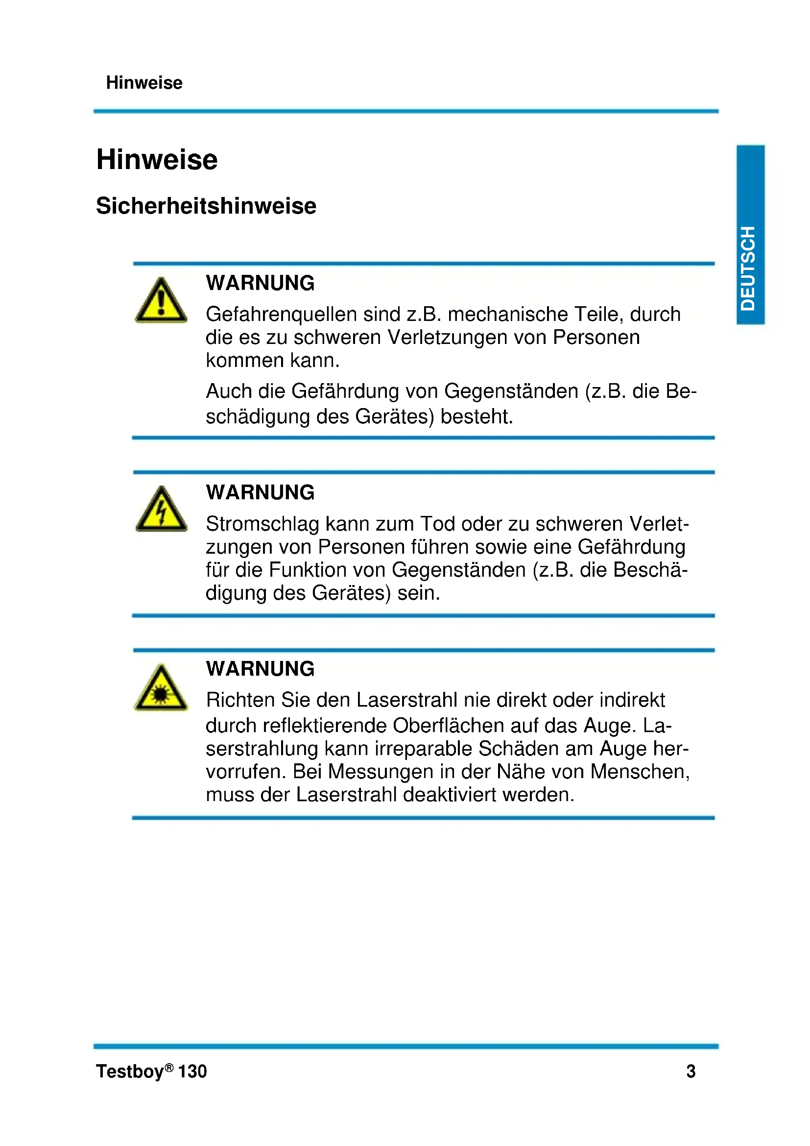 WARNUNG Richten Sie den Laserstrahl nie direkt oder indirekt durch reflektierende Oberflächen auf das Auge. La- serstrahlung kann irreparable Schäden am Auge her- vorrufen. Bei Messungen in der Nähe von Menschen, muss der Laserstrahl deaktiviert werden.Hinweise Testboy