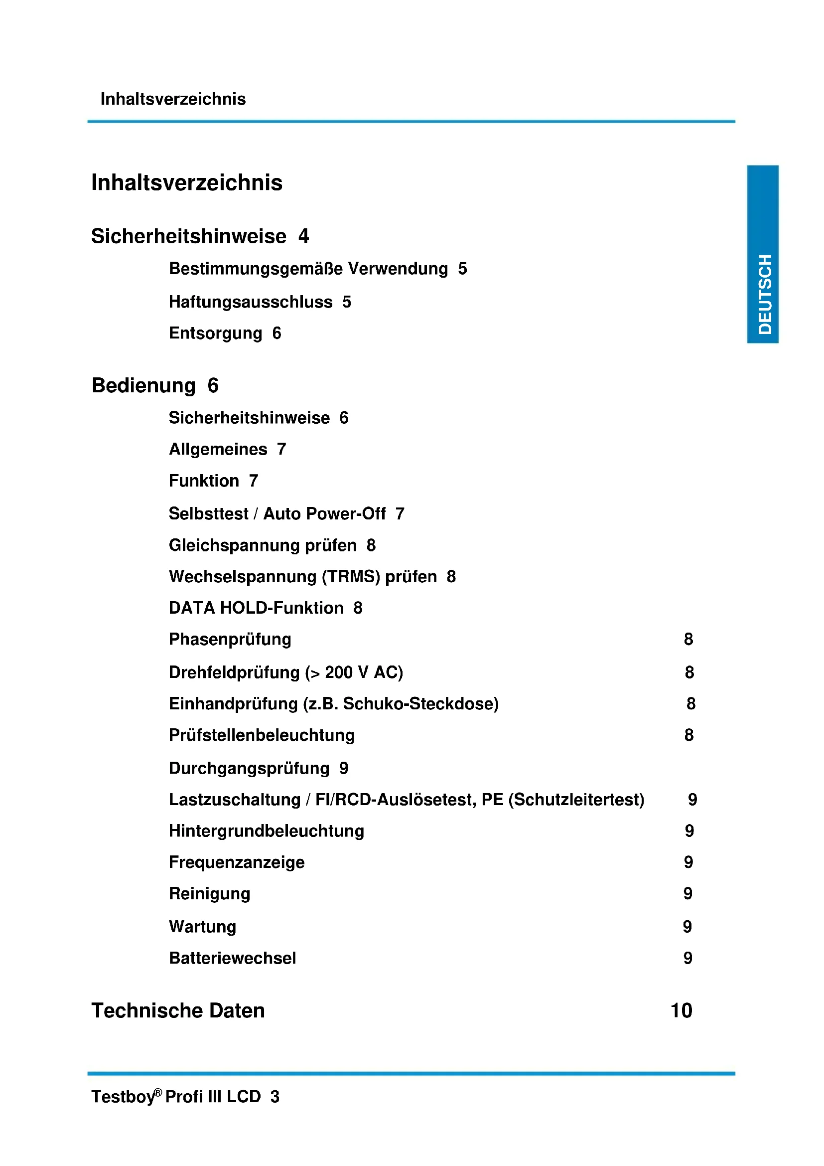 Profi III LCD 3 ENGLISH DEUTSCH Inhaltsverzeichnis Sicherheitshinweise 4 Bestimmungsgemäße Verwendung 5 Haftungsausschluss 5 Entsorgung 6 Bedienung 6 Sicherheitshinweise 6 Allgemeines 7 Funktion 7 Selbsttest / Auto Power-Off 7 Gleichspannung prüfen 8 Wechselspannung (TRMS) prüfen 8 DATA HOLD-Funktion 8 Phasenprüfung 8 Drehfeldprüfung (> 200 V AC) 8 Einhandprüfung (z.B. Schuko-Steckdose) 8 Prüfstellenbeleuchtung 8 Durchgangsprüfung 9 Lastzuschaltung / FI/RCD-Auslösetest, PE (Schutzleitertest) 9 Hintergrundbeleuchtung 9 Frequenzanzeige 9 Reinigung 9 Wartung 9 Batteriewechsel 9 Technische Daten 10Sicherheitshinweise 4 Testboy