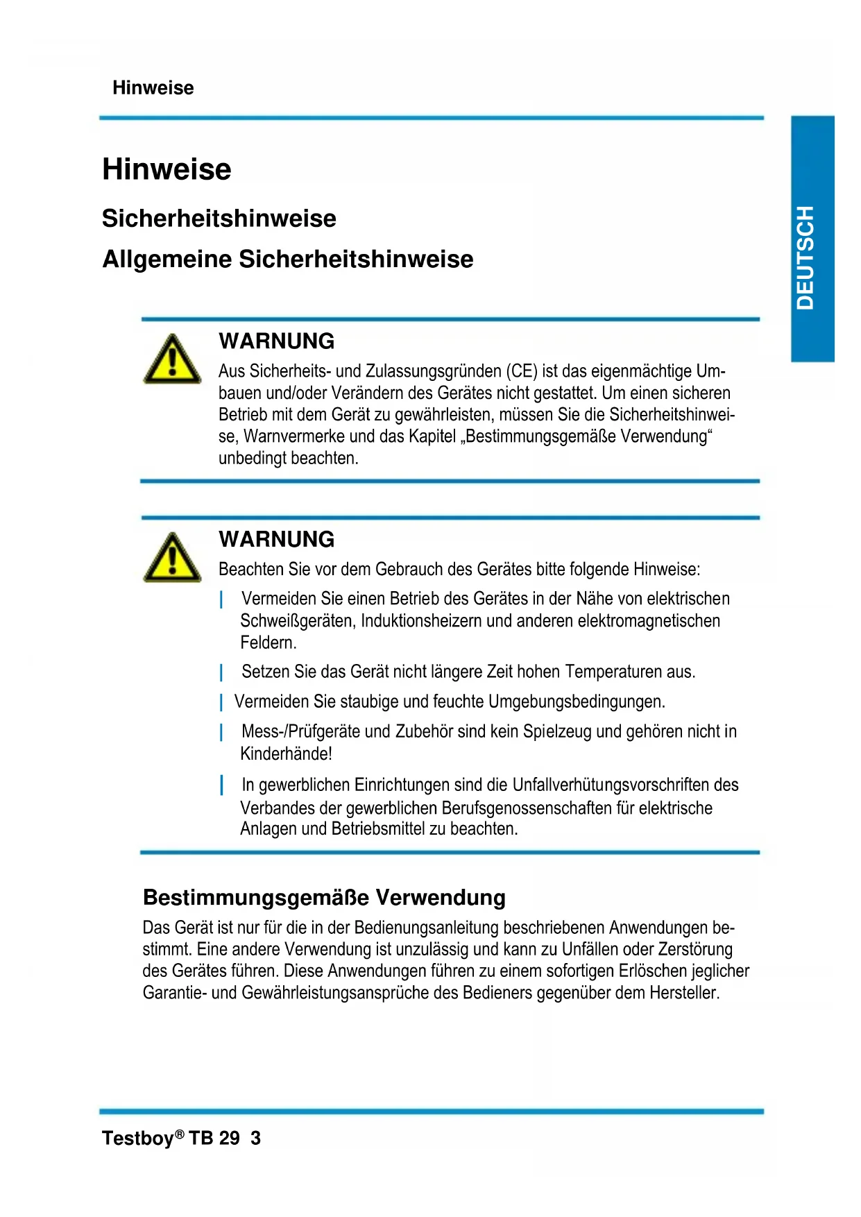 TB 29 3 DEUTSCH DEUTSCH DEUTSCH Hinweise Sicherheitshinweise Allgemeine Sicherheitshinweise