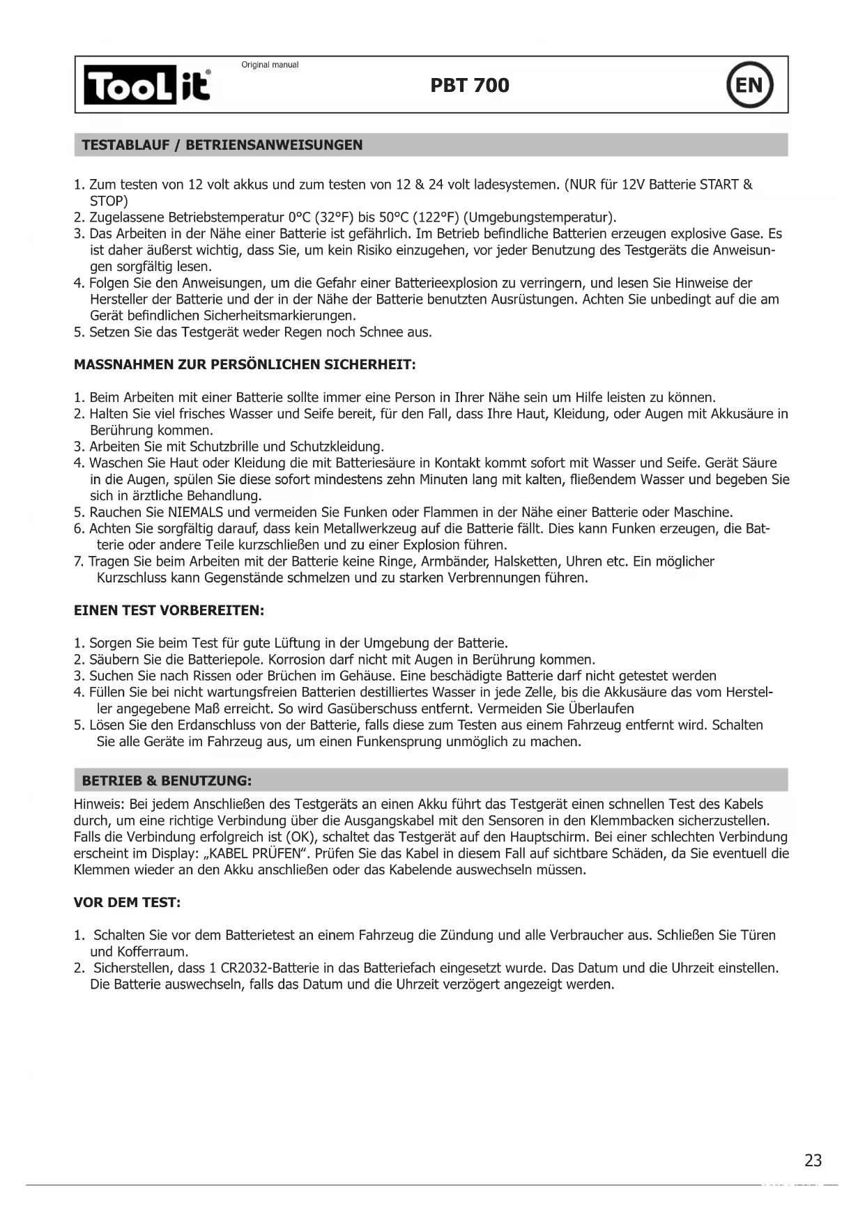 DiesisteinKombinationstestdesAkkutestsunddesSystemtests.BefolgenSiedieobenstehendenTestverfahrenoder die Anleitungen im Display des Testgeräts.33 PBT 700