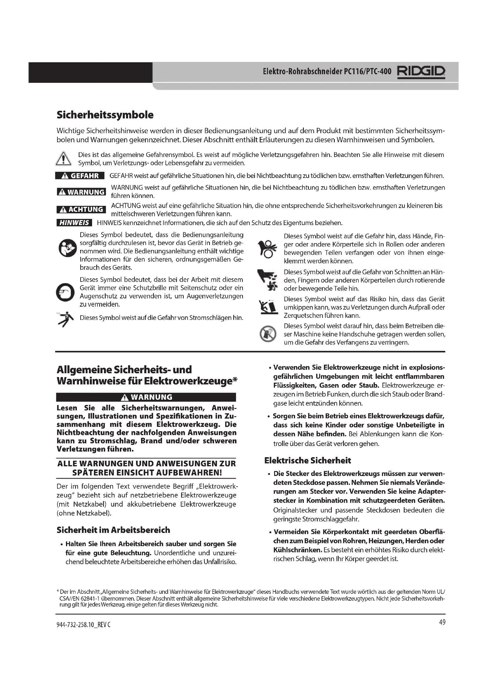- Der im Abschnitt „Allgemeine Sicherheits- und Warnhinweise für Elektrowerkzeuge“ dieses Handbuchs verwendete Text wurde wörtlich aus der geltenden Norm UL/ CSA//EN 62841-1 übernommen. Dieser Abschnitt enthält allgemeine Sicherheitshinweise für viele verschiedene Elektrowerkzeugtypen. Nicht jede Sicherheitsvorkeh- rung gilt für jedes Werkzeug, einige gelten für dieses Werkzeug nicht. Dieses Symbol weist darauf hin, dass beim Betreiben die-ser Maschine keine Handschuhe getragen werden sollen, um die Gefahr des Verfangens zu verringern.Dieses Symbol weist auf die Gefahr von Schnitten an Hän-den, Fingern oder anderen Körperteilen durch rotierende oder bewegende Teile hin. Dieses Symbol weist auf das Risiko hin, dass das Gerät umkippen kann, was zu Verletzungen durch Aufprall oder Zerquetschen führen kann.944-732-258.10_REV C Elektro-Rohrabschneider PC116/PTC-400
