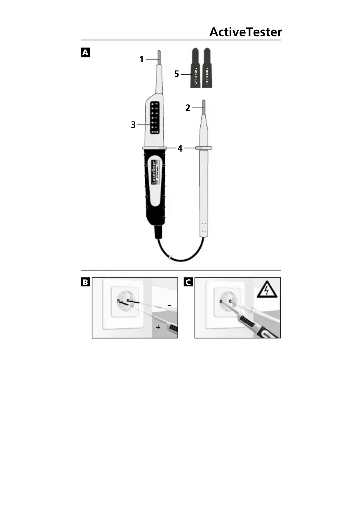 Gerätebeschreibung (siehe Abbildung A) Überspannungskategorie III: Betriebsmittel in festen Installationen und für solche Fälle, in denen beson- dere Anforderungen an die Zuverlässigkeit und die Verfügbarkeit der Betriebsmittel gestellt werden, z.B. Schalter in festen Installationen und Geräte für industriellen Einsatz mit dauerndem Anschluss an die feste Installation. Überspannungskategorie II: Einphasige Verbraucher, welche an normalen Steckdosen angeschlossen werden; z.B.: Haushaltsgeräte, tragbare Werkzeuge. Schutzklasse II: Das Prüfgerät verfügt über eine verstärkte oder doppelte Isolierung. 1 Meßspitze + 2 Meßspitze - 3 LED-Anzeige 4 Griffschutz 5 Schutzkappen DEActiveTester