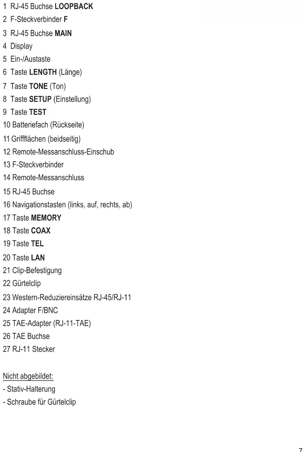 1 RJ-45 Buchse LOOPbACK 2 F-Steckverbinder f 3 RJ-45 Buchse mAIN 4 Display 5 Ein-/Austaste 6 Taste LeNgTH (Länge) 7 Taste TONe (Ton) 8 Taste seTUP (Einstellung) 9 Taste TesT 10 Batteriefach (Rückseite) 11 Griffächen (beidseitig) 12 Remote-Messanschluss-Einschub 13 F-Steckverbinder 14 Remote-Messanschluss 15 RJ-45 Buchse 16 Navigationstasten (links, auf, rechts, ab) 17 Taste memORY 18 Taste COAX 19 Taste TeL 20 Taste LAN 21 Clip-Befestigung 22 Gürtelclip 23 Western-Reduziereinsätze RJ-45/RJ-11 24 Adapter F/BNC 25 TAE-Adapter (RJ-11-TAE) 26 TAE Buchse 27 RJ-11 Stecker Nicht abgebildet: - Stativ-Halterung - Schraube für Gürtelclip8 Lesen Sie sich die Bedienungsanleitung aufmerksam durch und beachten Sie insbesondere die Sicherheitshinweise. Falls Sie die Sicherheitshinweise und die Angaben zur sachgemäßen Handhabung in dieser Bedienungsanleitung nicht befolgen, übernehmen wir für dadurch resultierende Personen-/Sachschäden keine Haftung. Außerdem erlischt in solchen Fällen die Gewährleistung/Garantie. a) Personen / Produkt