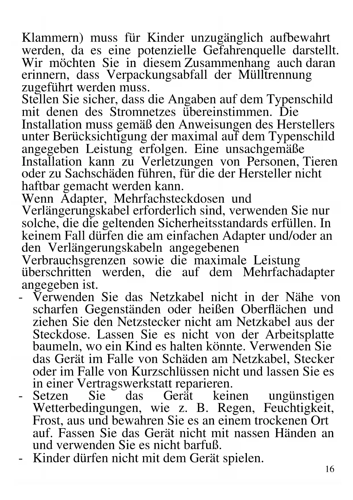 DEUTSCH: HINWEISE: Verwenden Sie das Gerät nur nach den Anweisungen in dieser Bedienungsanleitung. Jede anderweitige Verwendung gilt als unsachgemäß und gefährlich, und der Hersteller kann für Schäden nicht haftbar gemacht werden, die durch eine unsachgemäße, falsche oder unvernünftige Verwendung verursacht werden. Stellen Sie vor der Verwendung sicher, dass das Gerät unversehrt ist. Im Zweifelsfall verwenden Sie es nicht und wenden Sie sich an den Kundendienst. Verpackungsmaterial (Plastiktüten, Styropor, Nägel,16 Klammern) muss für Kinder unzugänglich aufbewahrt werden, da es eine potenzielle Gefahrenquelle darstellt. Wir möchten Sie in diesem Zusammenhang auch daran erinnern, dass Verpackungsabfall der Mülltrennung zugeführt werden muss. Stellen Sie sicher, dass die Angaben auf dem Typenschild mit denen des Stromnetzes übereinstimmen. Die Installation muss gemäß den Anweisungen des Herstellers unter Berücksichtigung der maximal auf dem Typenschild angegeben Leistung erfolgen. Eine unsachgemäße Installation kann zu Verletzungen von Personen, Tieren oder zu Sachschäden führen, für die der Hersteller nicht haftbar gemacht werden kann. Wenn Adapter, Mehrfachsteckdosen und Verlängerungskabel erforderlich sind, verwenden Sie nur solche, die die geltenden Sicherheitsstandards erfüllen. In keinem Fall dürfen die am einfachen Adapter und/oder an den Verlängerungskabeln angegebenen Verbrauchsgrenzen sowie die maximale Leistung überschritten werden, die auf dem Mehrfachadapter angegeben ist. - Verwenden Sie das Netzkabel nicht in der Nähe von scharfen Gegenständen oder heißen Oberflächen und ziehen Sie den Netzstecker nicht am Netzkabel aus der Steckdose. Lassen Sie es nicht von der Arbeitsplatte baumeln, wo ein Kind es halten könnte. Verwenden Sie das Gerät im Falle von Schäden am Netzkabel, Stecker oder im Falle von Kurzschlüssen nicht und lassen Sie es in einer Vertragswerkstatt reparieren. - Setzen Sie das Gerät keinen ungünstigen Wetterbedingungen, wie z. B. Regen, Feuchtigkeit, Frost, aus und bewahren Sie es an einem trockenen Ort auf. Fassen Sie das Gerät nicht mit nassen Händen an und verwenden Sie es nicht barfuß. - Kinder dürfen nicht mit dem Gerät spielen.17 - Dieses Gerät kann von Kindern ab 8 Jahren und von Personen mit eingeschränkten körperlichen, sensorischen oder geistigen Fähigkeiten oder mangelnder Erfahrung und Kenntnissen verwendet werden, wenn sie beaufsichtigt oder instruiert wurden, um das Gerät sicher zu verwenden und die damit verbundenen Gefahren zu verstehen. Kinder dürfen nicht mit dem Gerät spielen. Reinigung und Benutzerwartung dürfen nicht von Kindern ohne Aufsicht durchgeführt werden. - Bewahren Sie das Gerät und sein Netzanschluss außerhalb der Reichweite von Kinder unter 8 Jahren. - Nicht für den gewerblichen Gebrauch bestimmt. Nur für den Hausgebrauch bestimmt. Im Falle eines Defekts und/oder von Fehlfunktionen das Gerät nicht öffnen. Für Reparaturen wenden Sie sich an eine vom Hersteller autorisierte Werkstatt (Vertragswerkstatt) und fordern Sie den Einsatz von Original-Ersatzteilen. Die Nichtbeachtung der obigen Vorschriften kann die Sicherheit beeinträchtigen und zur Folge haben, dass die Garantie erlischt. Dieses Gerät ist nur für den Hausgebrauch oder gleichwertiges bestimmt, in Situationen wie bspw.: Kantinen in kleinen Firmen oder ähnliche Arbeitsumgebungen, von Kunden in Hotels, Motels oder andere Art von touristische Unterkunft, wie ländlicher oder Wohn –Tourismus. Das Gerät darf nicht mit einer Zeitschaltuhr oder mit einem separaten Fernwirksystem betrieben werden Führen Sie vor jedem Gebrauch das Netzkabel aus. Setzen Sie das Produkt keinen Stößen aus, es könnte beschädigt werden. Verwenden Sie nur originale und kompatible Teile und Zubehör. Halten Sie das Gerät fern von brennbaren Materialien, Wärmequellen, Dampf-und kalte Zonen.18 ALLGEMEINE HINWEISE WARNUNG: Verwenden Sie den Haartrockner nicht in der Badewanne, unter der Dusche und in der Duschkabine. Falls der Haartrockner ins Wasser fällt, nicht anfassen und ziehen Sie sofort der Netzstecker. Verhindern Sie Wasserspritzen. Verwenden Sie den Haartrockner nicht in der Nähe von Waschbecken oder sonstige Behälter mit Wasser und verstauen Sie den Trockner in ein stabiles und trockenes Regal, so dass es nicht auf den Boden oder in Behälter mit Flüssigkeit fällt. Stellen Sie den Trockner nur auf hitzebeständigen Oberflächen und weg von Kleidung, Papier oder brennbaren Flüssigkeiten. Die Lüftungsöffnungen nicht verhindern, da diese die Motoreinheit beschädigen können. Achten Sie darauf, lassen Sie Ihre Haare nicht zu nahe an diesen Öffnungen, weil der Trockner sie saugen und verbrennen kann. Lassen Sie das Gerät nie unbewacht, während es läuft. Im Falle von Überhitzung, durch übermäßigen Gebrauch oder durch zufällige Blockierung der Entlüftungsöffnungen, sperrt der Sicherheitsthermostat den Motoranlauf. Warten Sie bis die vollständige Abkühlung des Motors bis Sie es neu in Betrieb setzen können Wenn der Trockner in Betrieb ist, wird die Lüftungsöffnung sehr warm. Berühren Sie sie nicht, da diese schwere Verbrennungen verursachen kann. Benutzen Sie das Gerät nie als Heizer. Das Netzkabel nicht einwickeln, wenn das Gerät in Betrieb ist. Nach jedem Gebrauch, lassen Sie das Gerät abkühlen, bevor Sie es wegräumen. Wenn das Gerät im Badezimmern genutzt wird, ist nach dem Gebrauch der Netzstecker zuziehen, weil die Nähe19 von Wasser eine Gefahr darstellt, auch wenn das Gerät ausgeschaltet ist. Um einen besseren Schutz zu gewährleisten wird die Installation einer Fehlerstromschutzeinrichtung mit einem nominalen Auslösestrom von maximal 30 mA, im Badezimmer Stromkries empfohlen. Fragen Sie Ihren Installateur. G30051