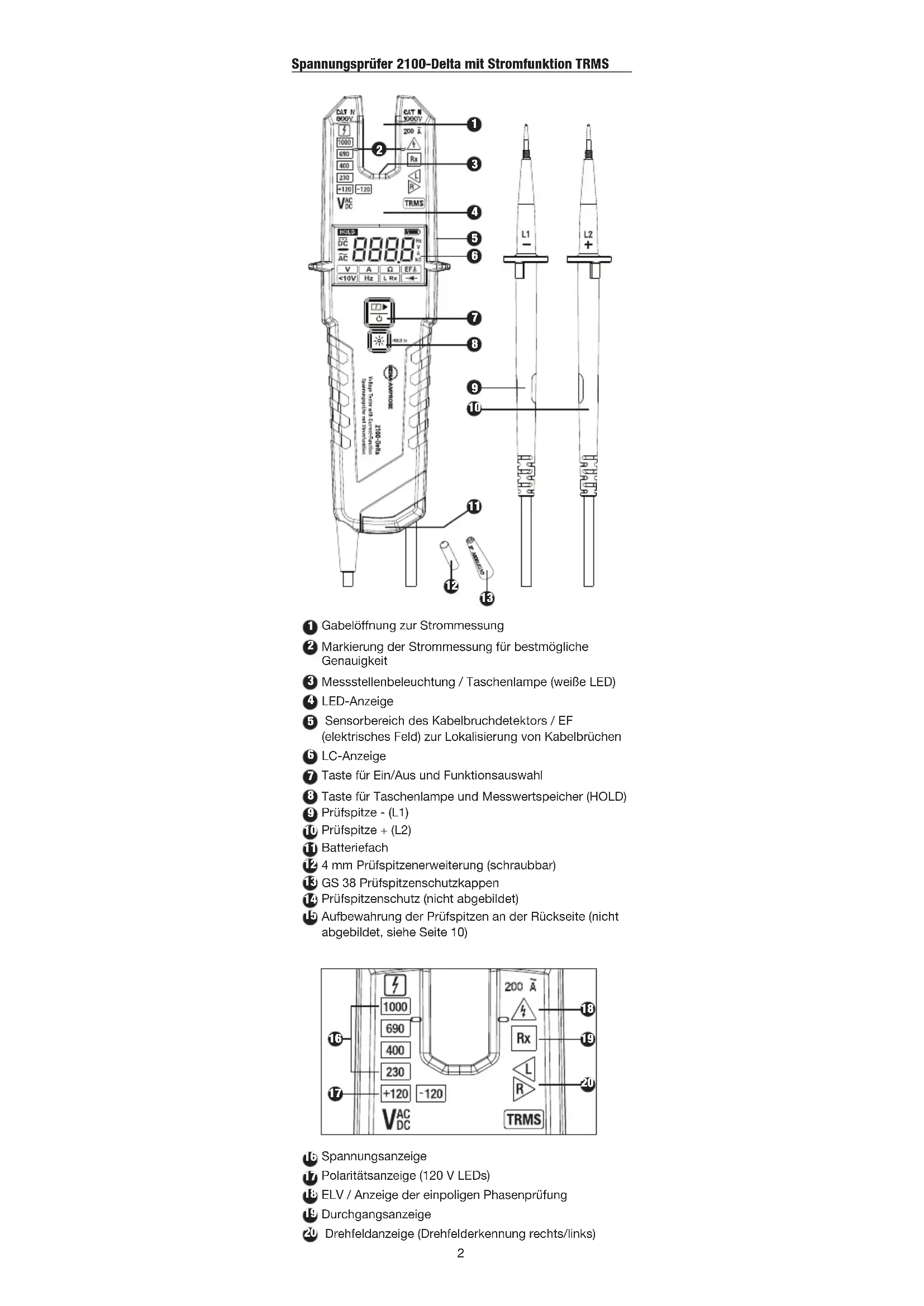 - Verwenden Sie die von örtlichen oder landesweiten Behörden vorgegebene Schutzausrüstung. Auspacken und prüfen Folgendes sollte im Lieferumfang enthalten sein: 1 2100-Delta Spannungsprüfer mit Stromfunktion 1 Holster 2 GS 38 Prüfspitzenschutzkappen 2 4 mm Prüfspitzenerweiterung (schraubbar) 2 1,5 V Alkalibatterien, IEC LR03 (installiert) 1 Bedienungsanleitung Falls etwas fehlen oder beschädigt sein sollte, lassen Sie bitte das komplette Paket von Ihrem Händler gegen ein einwandfreies Produkt austauschen. Merkmale Der Beha-Amprobe 2100-Delta ist ein robuster und leicht bedienbarer zweipolige Spannungsprüfer zur Spannungs-, Durchgangs- und Stromprüfung. Der 2100-Delta ist für Elektriker im Wohnbereich, in der Industrie und in gewerblichen Anwendungen in vielfältigen Spannungsbereichen und Sicherheitseinstufungen vorgesehen. Er ist nach der neuesten Spannungsprüfernorm EN 61243-3:2014 gebaut und ist GS-geprüft.