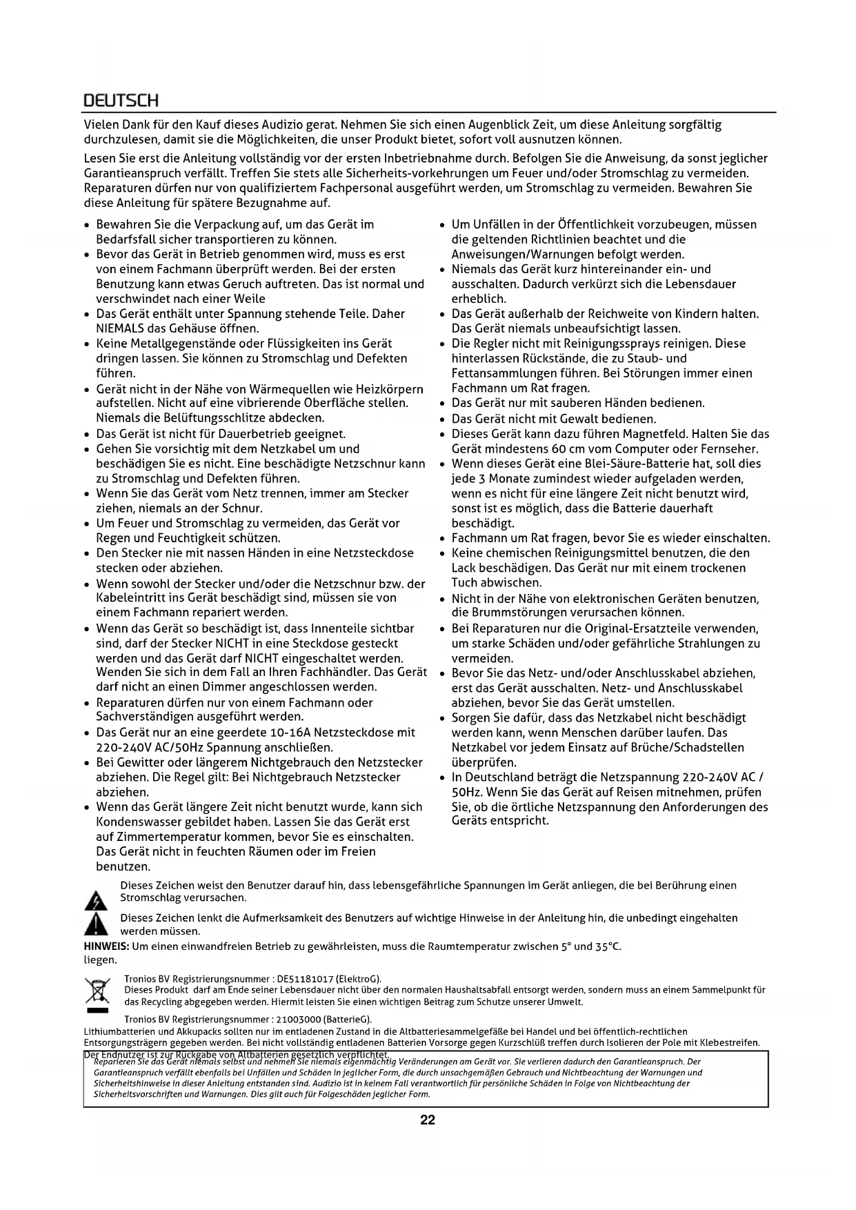 - In Deutschland beträgt die Netzspannung 220-240V AC / 50Hz. Wenn Sie das Gerät auf Reisen mitnehmen, prüfen Sie, ob die örtliche Netzspannung den Anforderungen des Geräts entspricht. Dieses Zeichen weist den Benutzer darauf hin, dass lebensgefährliche Spannungen im Gerät anliegen, die bei Berührung einen Stromschlag verursachen. Dieses Zeichen lenkt die Aufmerksamkeit des Benutzers auf wichtige Hinweise in der Anleitung hin, die unbedingt eingehalten werden müssen. HINWEIS: Um einen einwandfreien Betrieb zu gewährleisten, muss die Raumtemperatur zwischen 5° und 35°C. liegen. Tronios BV Registrierungsnummer : DE51181017 (ElektroG). Dieses Produkt darf am Ende seiner Lebensdauer nicht über den normalen Haushaltsabfall entsorgt werden, sondern muss an einem Sammelpunkt für das Recycling abgegeben werden. Hiermit leisten Sie einen wichtigen Beitrag zum Schutze unserer Umwelt. Tronios BV Registrierungsnummer : 21003000 (BatterieG). Lithiumbatterien und Akkupacks sollten nur im entladenen Zustand in die Altbatteriesammelgefäße bei Handel und bei öffentlich-rechtlichen Entsorgungsträgern gegeben werden. Bei nicht vollständig entladenen Batterien Vorsorge gegen Kurzschlüß treffen durch Isolieren der Pole mit Klebestreifen. Der Endnutzer ist zur Rückgabe von Altbatterien gesetzlich verpflichtet.