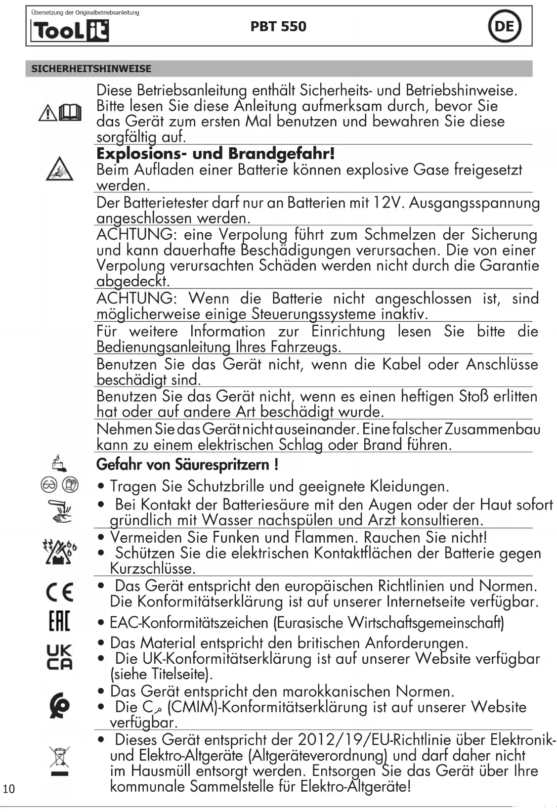 Translation of the original instructionsSICHERHEITSHINWEISE Diese Betriebsanleitung enthält Sicherheits- und Betriebshinweise. Bitte lesen Sie diese Anleitung aufmerksam durch, bevor Sie das Gerät zum ersten Mal benutzen und bewahren Sie diese sorgfältig auf. Explosions- und Brandgefahr! Beim Auaden einer Batterie können explosive Gase freigesetzt werden. Der Batterietester darf nur an Batterien mit 12V. Ausgangsspannung angeschlossen werden. ACHTUNG: eine Verpolung führt zum Schmelzen der Sicherung und kann dauerhafte Beschädigungen verursachen. Die von einer Verpolung verursachten Schäden werden nicht durch die Garantie abgedeckt. ACHTUNG: Wenn die Batterie nicht angeschlossen ist, sind möglicherweise einige Steuerungssysteme inaktiv. Für weitere Information zur Einrichtung lesen Sie bitte die Bedienungsanleitung Ihres Fahrzeugs. Benutzen Sie das Gerät nicht, wenn die Kabel oder Anschlüsse beschädigt sind. Benutzen Sie das Gerät nicht, wenn es einen heftigen Stoß erlitten hat oder auf andere Art beschädigt wurde. Nehmen Sie das Gerät nicht auseinander. Eine falscher Zusammenbau kann zu einem elektrischen Schlag oder Brand führen. Gefahr von Säurespritzern !