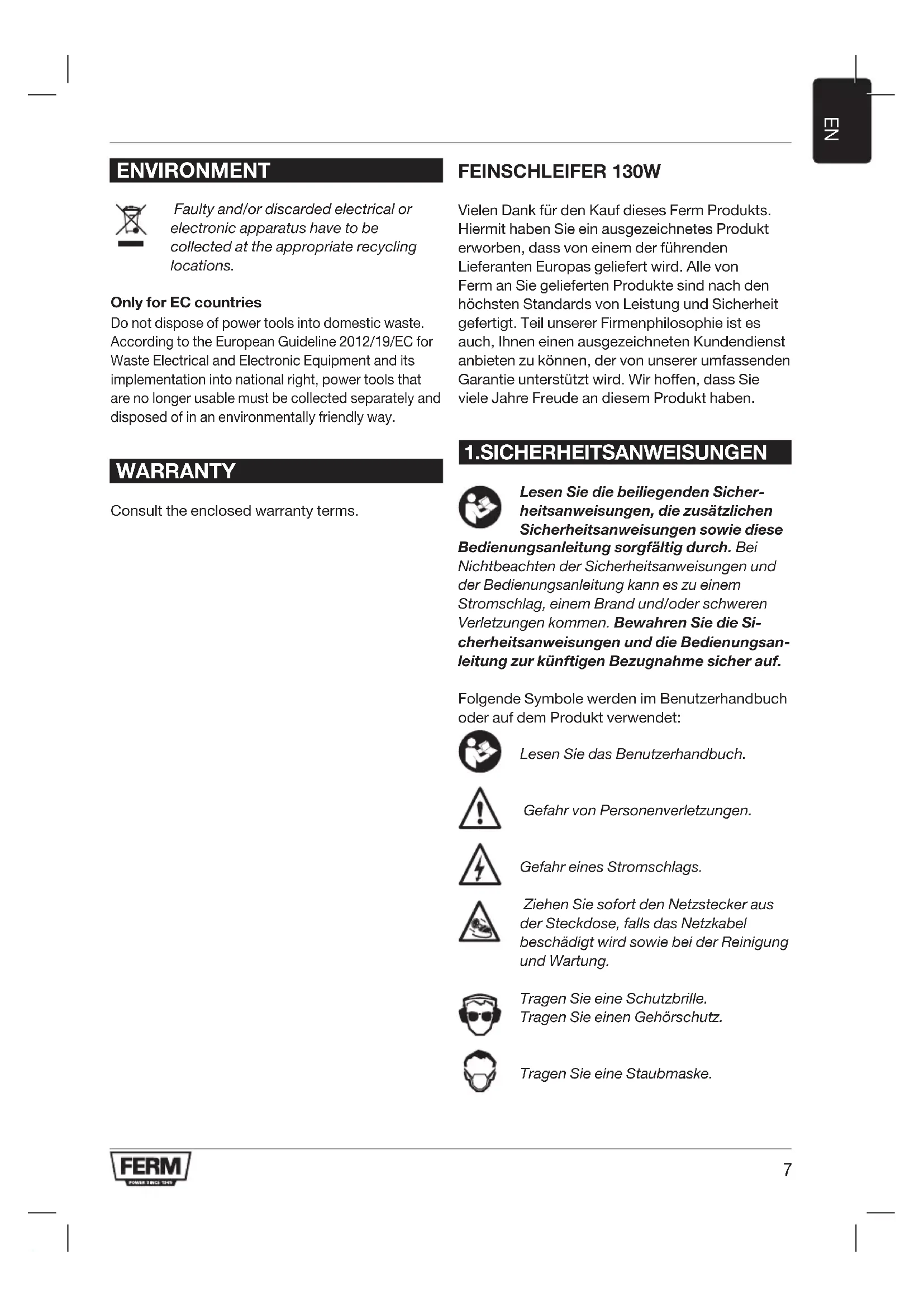 ENVIRONMENT Faulty and/or discarded electrical or electronic apparatus have to be collected at the appropriate recycling locations. Only for EC countries Do not dispose of power tools into domestic waste. According to the European Guideline 2012/19/EC for Waste Electrical and Electronic Equipment and its implementation into national right, power tools that are no longer usable must be collected separately and disposed of in an environmentally friendly way. WARRANTY Consult the enclosed warranty terms. FEINSCHLEIFER 130W Vielen Dank für den Kauf dieses Ferm Produkts. Hiermit haben Sie ein ausgezeichnetes Produkt erworben, dass von einem der führenden Lieferanten Europas geliefert wird. Alle von Ferm an Sie gelieferten Produkte sind nach den höchsten Standards von Leistung und Sicherheit gefertigt. Teil unserer Firmenphilosophie ist es auch, Ihnen einen ausgezeichneten Kundendienst anbieten zu können, der von unserer umfassenden Garantie unterstützt wird. Wir hoffen, dass Sie viele Jahre Freude an diesem Produkt haben.