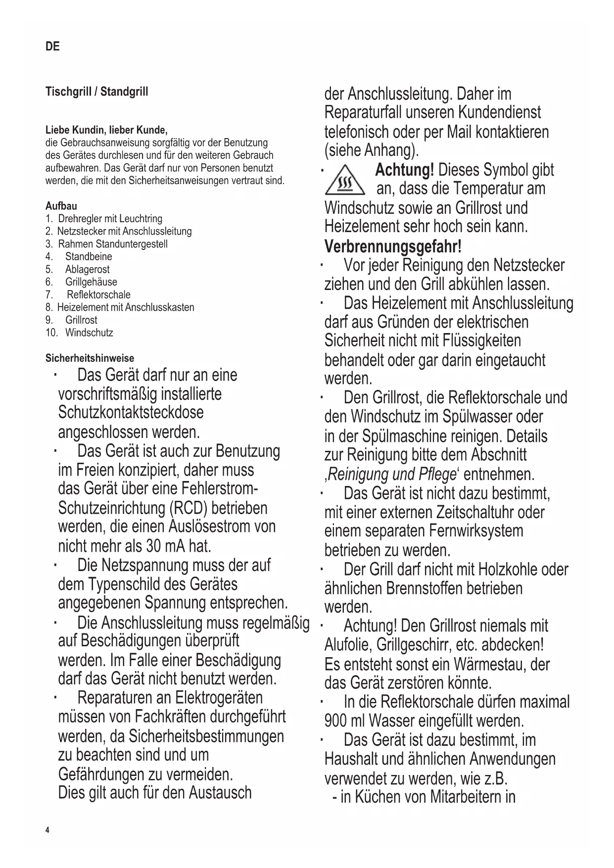 Achtung! Dieses Symbol gibt an, dass die Temperatur am Windschutz sowie an Grillrost und Heizelement sehr hoch sein kann. Verbrennungsgefahr! ∙ Vor jeder Reinigung den Netzstecker ziehen und den Grill abkühlen lassen. ∙ Das Heizelement mit Anschlussleitung darf aus Gründen der elektrischen Sicherheit nicht mit Flüssigkeiten behandelt oder gar darin eingetaucht werden. ∙ DenGrillrost,dieReektorschaleund den Windschutz im Spülwasser oder in der Spülmaschine reinigen. Details zur Reinigung bitte dem Abschnitt ‚Reinigung und Pege‘ entnehmen. ∙ Das Gerät ist nicht dazu bestimmt, mit einer externen Zeitschaltuhr oder einem separaten Fernwirksystem betrieben zu werden. ∙ Der Grill darf nicht mit Holzkohle oder ähnlichen Brennstoffen betrieben werden. ∙ Achtung! Den Grillrost niemals mit Alufolie, Grillgeschirr, etc. abdecken! Es entsteht sonst ein Wärmestau, der das Gerät zerstören könnte. ∙ IndieReektorschaledürfenmaximal 900 ml Wasser eingefüllt werden. ∙ Das Gerät ist dazu bestimmt, im Haushalt und ähnlichen Anwendungen verwendet zu werden, wie z.B. - in Küchen von Mitarbeitern in DE5 142 x 208 mm Läden, Büros und ähnlichen Arbeitsumgebungen, - in landwirtschaftlichen Betrieben, - von Kunden in Hotels, Motels und weiteren typischen Wohnumgebungen, - in Frühstückspensionen. ∙ Das Gerät kann von Kindern ab 8 Jahren sowie von Personen mit reduzierten physischen, sensorischen oder mentalen Fähigkeiten oder Mangel an Erfahrung und/oder Wissen benutzt werden, wenn sie beaufsichtigt oder bezüglich des sicheren Gebrauchs des Gerätes unterwiesen wurden und die daraus resultierenden Gefahren verstanden haben. ∙ Kinder dürfen nicht mit dem Gerät spielen. ∙ Reinigung und Benutzer-Wartung dürfen nicht durch Kinder durchgeführt werden, es sei denn sie sind 8 Jahre und älter und werden beaufsichtigt. ∙ Kinder jünger als 8 Jahre müssen vom Gerät und der Anschlussleitung ferngehalten werden. ∙ Verpackungsmaterial von Kindern fernhalten. Es besteht u.a. Erstickungsgefahr! ∙ Vor Inbetriebnahme das komplette Gerät inkl. eventueller Zubehörteile auf Mängel überprüfen, die die Funktionssicherheit des Gerätes beeinträchtigen könnten. Falls das Gerät z.B. zu Boden gefallen ist, können von außen nicht erkennbare Schäden vorliegen. Auch in diesem Fall das Gerät nicht in Betrieb nehmen. ∙ Den Grill auf eine ebene, wärmebeständige und spritzunempndlicheUnterlagestellen,daSpritzerbei fetthaltigem Grillgut unvermeidlich sind. ∙ Den Grill nicht direkt an eine Wand oder Ecke stellen undleichtentammbareGegenständeausderNähe entfernen. ∙ Fetthaltiges Grillgut kann sich entzünden, daher vor jeder Inbetriebnahme Wasser in die Reektorschale einfüllen! Erst danach den Netzstecker einstecken. HierdurchwirddieReektorschalegekühlt, die Rauchentwicklung vermindert und die Reinigung erleichtert. Den Wasserstand beobachten und rechtzeitig Wasser nachfüllen. Vorher den Netzstecker ziehen und kein Wasser direkt auf das Heizelement gießen. ∙ Vor der Inbetriebnahme kontrollieren, dass das Heizelement ordnungsgemäß im Gehäuse und in der Reektorschale eingesetzt ist. ∙ Den Grill nur unter Aufsicht betreiben. ∙ Das Heizelement und das Grillrost sind im Betrieb sehr heiß. Auch nach dem Abschalten das Heizelement nicht berühren, solange es noch heiß ist. Es besteht Verbrennungsgefahr! ∙ Die Anschlussleitung darf nicht mit heißen Teilen in Berührung kommen. ∙ Den Netzstecker ziehen: - vor jedem Wassereinfüllen - nach jedem Gebrauch, - bei Störung während des Betriebes, - vor jeder Reinigung. ∙ Wird eine Kabeltrommel / ein Verlängerungskabel verwendet, entsteht hierdurch ein Leistungsverlust. Das Kabel muss vollständig abgewickelt sein, da sich dieses sonst unzulässig erwärmen kann. Das Kabel muss für die auf dem Typenschild angegebenen Leistung und den Gebrauch im Freien geeignet sein. ∙ Den Grill niemals bewegen, während er in Betrieb ist und ihn erst abkühlen lassen, bevor er bewegt oder gereinigt wird. Das Wasser nach Gebrauch entfernen. ∙ Der Grill darf nicht im Freien oder an offenen Stellen aufbewahrtwerden,woerdurchWitterungseinüsse beeinträchtigt werden könnte. ∙ Wird der Grill falsch bedient, kann keine Haftung für evtl. auftretende Schäden übernommen werden. ∙ Das Gerät entspricht den Richtlinien, die für die CE- Kennzeichnung verbindlich sind. Erste Inbetriebnahme ∙ Sämtliches Verpackungsmaterial und eventuelle Werbeaufkleber vom Gerät entfernen. ∙ Grillrost,ReektorschaleundWindschutzinheißem Spülwasser reinigen und gründlich abtrocknen. ∙ Das Gerät montieren und Wasser einfüllen wie unter ‚Gerät vorbereiten‘ beschrieben. ∙ Das Gerät ohne Grillgut ca. 10 Minuten auf höchster Stufe (siehe ‚Grillen‘) aufheizen, damit der Eigengeruch des Grills abklingt. Eine leichte Rauchentwicklung ist möglich. Daher bei Benutzung in geschlossenen Räumen für ausreichende Lüftung durch geöffnete Fenster oder Balkontüren sorgen oder das Gerät unter eine Dunstabzugshaube stellen.6 142 x 208 mm Grill montieren ∙ Den Grill wie in der Abbildung gezeigt montieren: ∙ DieReektorschaleindasGrillgehäusesetzen. ∙ Den Heizkörper mit Anschlusskasten in die Reektorschalesetzen.DasGerätistmit einem Sicherheitsschalter ausgestattet. Ist der Anschlusskasten nicht richtig montiert, lässt sich das Gerät nicht in Betrieb nehmen. ∙ Den Grillrost so aufsetzen, dass die Stifte am Grillrost indieLöcheranderReektorschalegreifen. ∙ Die Elemente des Windschutzes zuerst hinten in die Aussparungen am Grillrost einsetzen und dann seitlich an den Stäben des Grillrostes einrasten lassen. Standuntergestell montieren ∙ Bei Geräten mit Standuntergestell dieses wie in der Abbildung gezeigt montieren: ∙ Die vier Standbeine von unten in den Rahmen einsetzen und einrasten lassen. ∙ Den Ablagerost in den Aussparungen der Standbeine einhaken. ∙ DensicherenStanddesUntergestellsprüfen. ∙ Den monti
