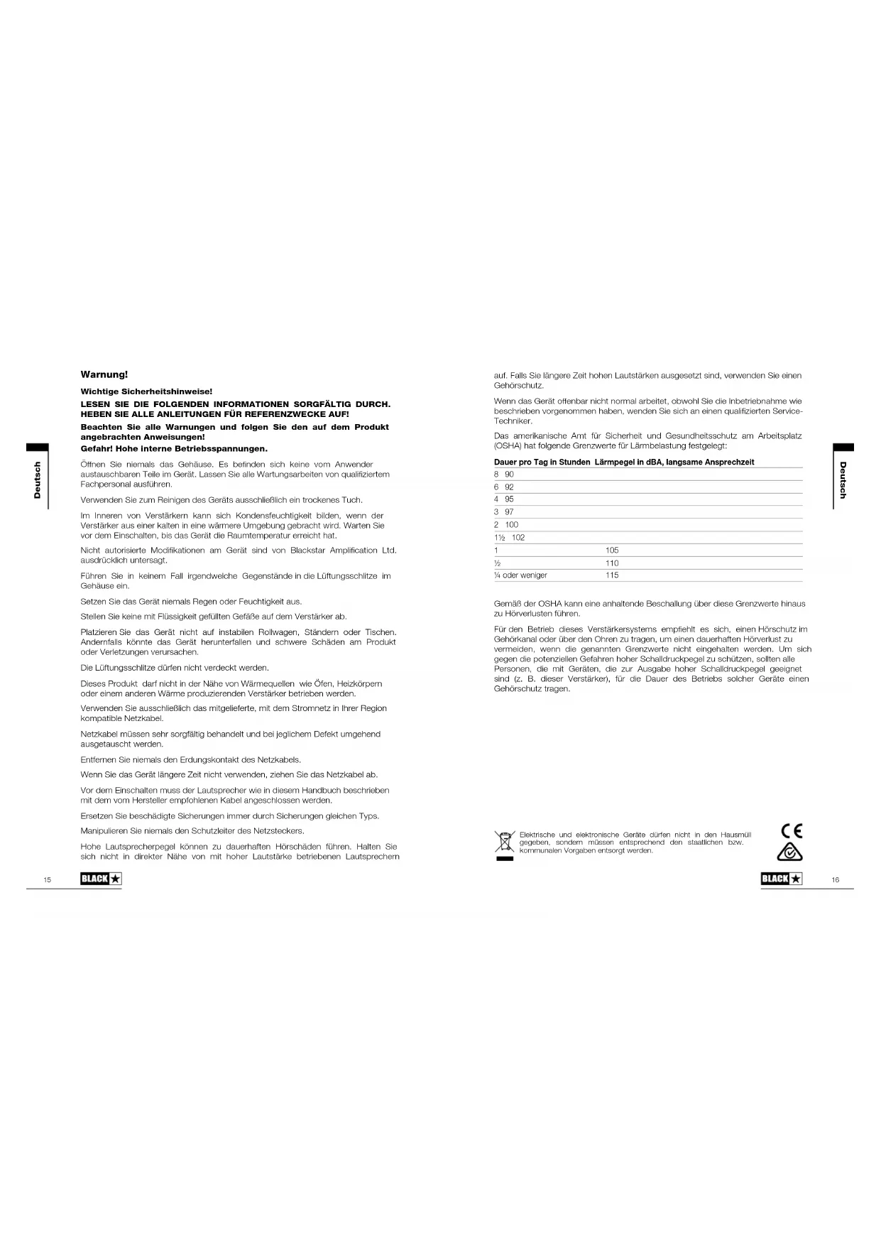 Technical Specification Unity Pro Bass U30 Power (RMS): 30 Watts Weight (kg): 10 Dimensions (mm): 395(W) x 435(H) x 285(D) Footswitch (not included): FS-8, or any equivalent latching 2-button footswitch Unity Pro Bass U60 Power (RMS): 60 Watts Weight (kg): 12 Dimensions (mm): 410(W) x 465(H) x 295(D) Footswitch (not included): FS-8, or any equivalent latching 2-button footswitch Unity Pro Bass U120 Power (RMS): 120 Watts Weight (kg): 15 Dimensions (mm): 445(W) x 515(H) x 325(D) Footswitch (not included): FS-8, or any equivalent latching 2-button footswitch1615 Deutsch Deutsch Warnung! Wichtige Sicherheitshinweise! LESEN SIE DIE FOLGENDEN INFORMATIONEN SORGFÄLTIG DURCH. HEBEN SIE ALLE ANLEITUNGEN FÜR REFERENZWECKE AUF! Beachten Sie alle Warnungen und folgen Sie den auf dem Produkt angebrachten Anweisungen! Gefahr! Hohe interne Betriebsspannungen. Önen Sie niemals das Gehäuse. Es benden sich keine vom Anwender austauschbaren Teile im Gerät. Lassen Sie alle Wartungsarbeiten von qualiziertem Fachpersonal ausführen. Verwenden Sie zum Reinigen des Geräts ausschließlich ein trockenes Tuch. Im Inneren von Verstärkern kann sich Kondensfeuchtigkeit bilden, wenn der Verstärker aus einer kalten in eine wärmere Umgebung gebracht wird. Warten Sie vor dem Einschalten, bis das Gerät die Raumtemperatur erreicht hat. Nicht autorisierte Modikationen am Gerät sind von Blackstar Amplication Ltd. ausdrücklich untersagt. Führen Sie in keinem Fall irgendwelche Gegenstände in die Lüftungsschlitze im Gehäuse ein. Setzen Sie das Gerät niemals Regen oder Feuchtigkeit aus. Stellen Sie keine mit Flüssigkeit gefüllten Gefäße auf dem Verstärker ab. Platzieren Sie das Gerät nicht auf instabilen Rollwagen, Ständern oder Tischen. Andernfalls könnte das Gerät herunterfallen und schwere Schäden am Produkt oder Verletzungen verursachen. Die Lüftungsschlitze dürfen nicht verdeckt werden. Dieses Produkt darf nicht in der Nähe von Wärmequellen wie Öfen, Heizkörpern oder einem anderen Wärme produzierenden Verstärker betrieben werden. Verwenden Sie ausschließlich das mitgelieferte, mit dem Stromnetz in Ihrer Region kompatible Netzkabel. Netzkabel müssen sehr sorgfältig behandelt und bei jeglichem Defekt umgehend ausgetauscht werden. Entfernen Sie niemals den Erdungskontakt des Netzkabels. Wenn Sie das Gerät längere Zeit nicht verwenden, ziehen Sie das Netzkabel ab. Vor dem Einschalten muss der Lautsprecher wie in diesem Handbuch beschrieben mit dem vom Hersteller empfohlenen Kabel angeschlossen werden. Ersetzen Sie beschädigte Sicherungen immer durch Sicherungen gleichen Typs. Manipulieren Sie niemals den Schutzleiter des Netzsteckers. Hohe Lautsprecherpegel können zu dauerhaften Hörschäden führen. Halten Sie sich nicht in direkter Nähe von mit hoher Lautstärke betriebenen Lautsprechern auf. Falls Sie längere Zeit hohen Lautstärken ausgesetzt sind, verwenden Sie einen Gehörschutz. Wenn das Gerät oenbar nicht normal arbeitet, obwohl Sie die Inbetriebnahme wie beschrieben vorgenommen haben, wenden Sie sich an einen qualizierten Service- Techniker. Das amerikanische Amt für Sicherheit und Gesundheitsschutz am Arbeitsplatz (OSHA) hat folgende Grenzwerte für Lärmbelastung festgelegt: Dauer pro Tag in Stunden Lärmpegel in dBA, langsame Ansprechzeit