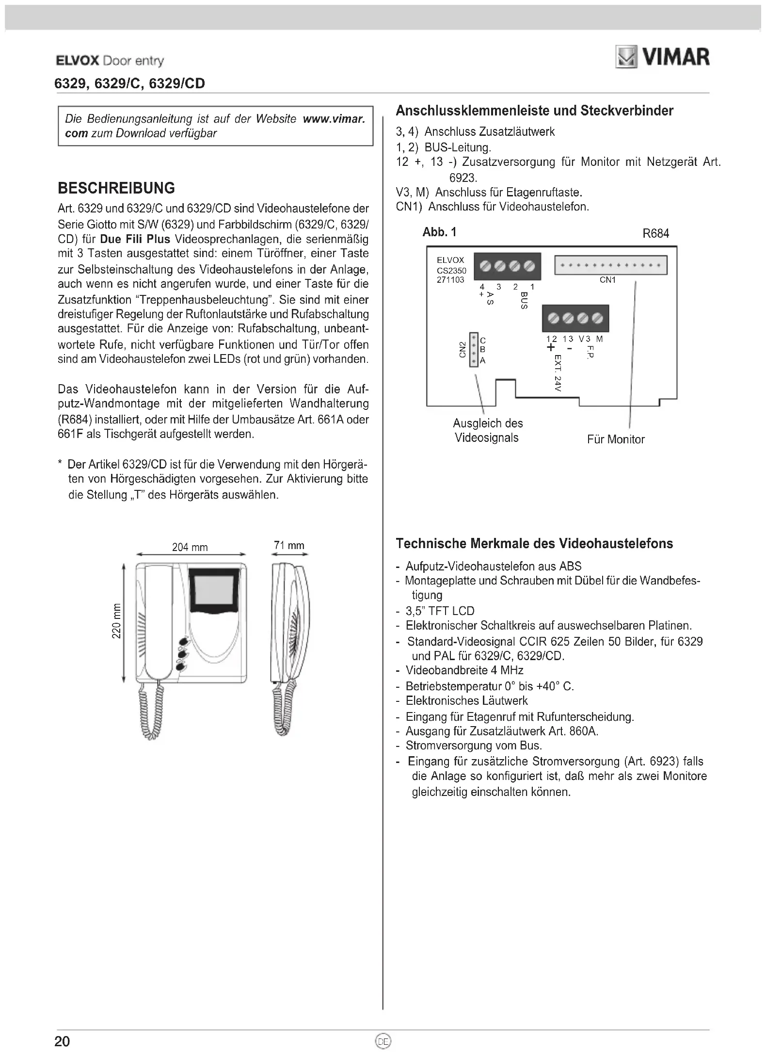6329, 6329/C, 6329/CDTechnische Merkmale des Videohaustelefons - Aufputz-Videohaustelefon aus ABS - Montageplatte und Schrauben mit Dübel für die Wandbefes- tigung - 3,5” TFT LCD - Elektronischer Schaltkreis auf auswechselbaren Platinen. - Standard-Videosignal CCIR 625 Zeilen 50 Bilder, für 6329 und PAL für 6329/C, 6329/CD. - Videobandbreite 4 MHz - Betriebstemperatur 0° bis +40° C. - Elektronisches Läutwerk - Eingang für Etagenruf mit Rufunterscheidung. - Ausgang für Zusatzläutwerk Art. 860A. - Stromversorgung vom Bus. - Eingang für zusätzliche Stromversorgung (Art. 6923) falls die Anlage so konfiguriert ist, daß mehr als zwei Monitore gleichzeitig einschalten können. Abb. 1 BESCHREIBUNG Art. 6329 und 6329/C und 6329/CD sind Videohaustelefone der Serie Giotto mit S/W (6329) und Farbbildschirm (6329/C, 6329/ CD) für Due Fili Plus Videosprechanlagen, die serienmäßig mit 3 Tasten ausgestattet sind: einem Türöffner, einer Taste zur Selbsteinschaltung des Videohaustelefons in der Anlage, auch wenn es nicht angerufen wurde, und einer Taste für die Zusatzfunktion “Treppenhausbeleuchtung”. Sie sind mit einer dreistufiger Regelung der Ruftonlautstärke und Rufabschaltung ausgestattet. Für die Anzeige von: Rufabschaltung, unbeant- wortete Rufe, nicht verfügbare Funktionen und Tür/Tor offen sind am Videohaustelefon zwei LEDs (rot und grün) vorhanden. Das Videohaustelefon kann in der Version für die Auf- putz-Wandmontage mit der mitgelieferten Wandhalterung (R684) installiert, oder mit Hilfe der Umbausätze Art. 661A oder 661F als Tischgerät aufgestellt werden.