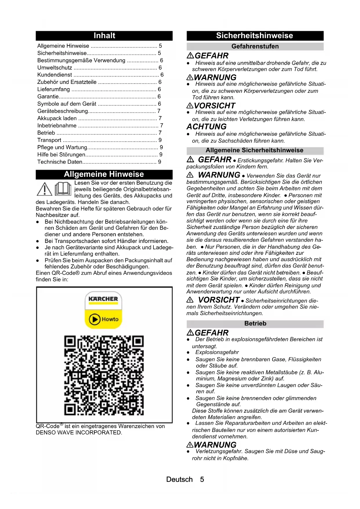 • ist ein eingetragenes Warenzeichen von DENSO WAVE INCORPORATED. Sicherheitshinweise Gefahrenstufen GEFAHR ● Hinweis auf eine unmittelbar drohende Gefahr, die zu schweren Körperverletzungen oder zum Tod führt. 몇 WARNUNG ● Hinweis auf eine möglicherweise gefährliche Situati- on, die zu schweren Körperverletzungen oder zum Tod führen kann. 몇 VORSICHT ● Hinweis auf eine möglicherweise gefährliche Situati- on, die zu leichten Verletzungen führen kann. ACHTUNG ● Hinweis auf eine möglicherweise gefährliche Situati- on, die zu Sachschäden führen kann. Allgemeine Sicherheitshinweise GEFAHR ● Erstickungsgefahr. Halten Sie Ver- packungsfolien von Kindern fern. 몇 WARNUNG ● Verwenden Sie das Gerät nur bestimmungsgemäß. Berücksichtigen Sie die örtlichen Gegebenheiten und achten Sie beim Arbeiten mit dem Gerät auf Dritte, insbesondere Kinder. ● Personen mit verringerten physischen, sensorischen oder geistigen Fähigkeiten oder Mangel an Erfahrung und Wissen dür- fen das Gerät nur benutzen, wenn sie korrekt beauf- sichtigt werden oder wenn sie durch eine für ihre Sicherheit zuständige Person bezüglich der sicheren Anwendung des Geräts unterwiesen wurden und wenn sie die daraus resultierenden Gefahren verstanden ha- ben. ● Nur Personen, die in der Handhabung des Ge- räts unterwiesen sind oder ihre Fähigkeiten zur Bedienung nachgewiesen haben und ausdrücklich mit der Benutzung beauftragt sind, dürfen das Gerät benut- zen. ● Kinder dürfen das Gerät nicht betreiben. ● Beauf- sichtigen Sie Kinder, um sicherzustellen, dass sie nicht mit dem Gerät spielen. ● Kinder dürfen Reinigung und Anwenderwartung nur unter Aufsicht durchführen. 몇 VORSICHT ● Sicherheitseinrichtungen die- nen Ihrem Schutz. Verändern oder umgehen Sie nie- mals Sicherheitseinrichtungen. Betrieb GEFAHR ● Der Betrieb in explosionsgefährdeten Bereichen ist untersagt. ● Explosionsgefahr ● Saugen Sie keine brennbaren Gase, Flüssigkeiten oder Stäube auf. ● Saugen Sie keine reaktiven Metallstäube (z. B. Alu- minium, Magnesium oder Zink) auf. ● Saugen Sie keine unverdünnten Laugen oder Säu- ren auf. ● Saugen Sie keine brennenden oder glimmenden Gegenstände auf. Diese Stoffe können zusätzlich die am Gerät verwen- deten Materialien angreifen. ● Lassen Sie Reparaturarbeiten und Arbeiten an elekt- rischen Bauteilen nur von einem autorisierten Kun- dendienst vornehmen. 몇 WARNUNG ● Verletzungsgefahr. Saugen Sie mit Düse und Saug- rohr nicht in Kopfnähe. Allgemeine Hinweise p. 5