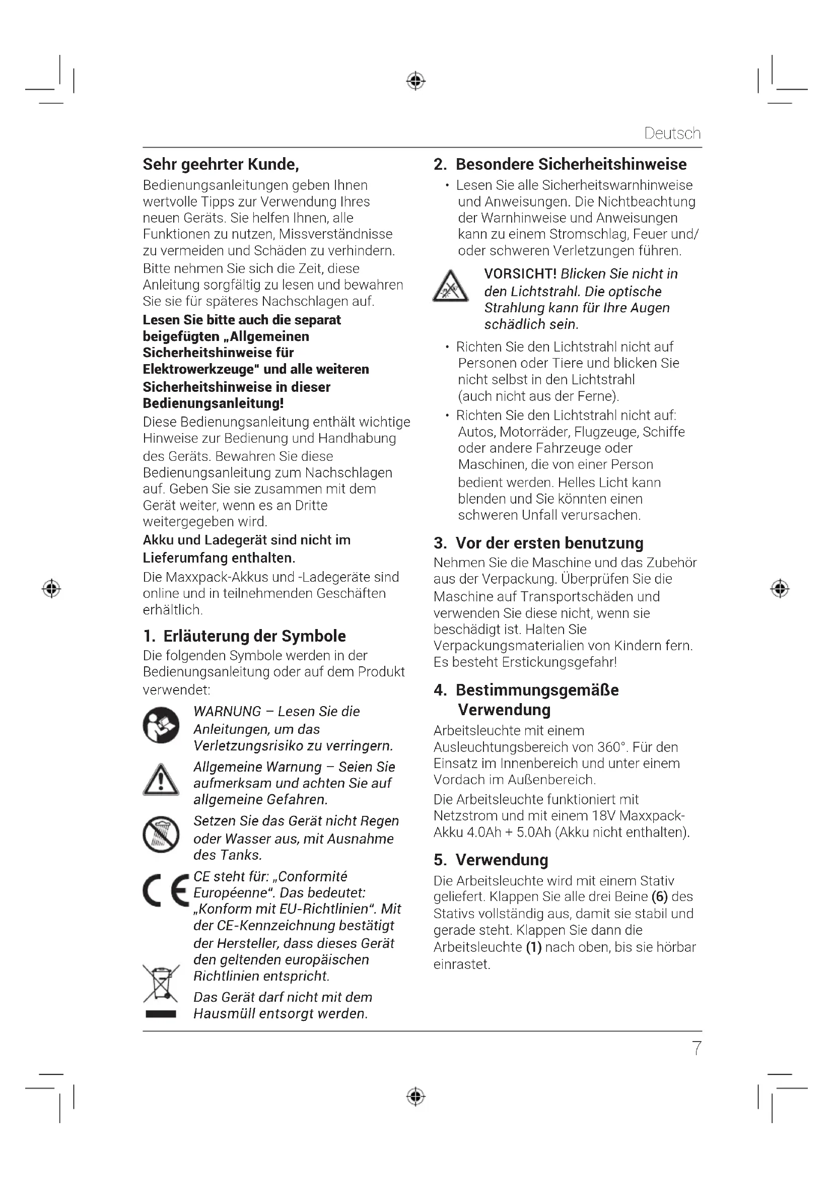 Verwendung Arbeitsleuchte mit einem Ausleuchtungsbereich von 360°. Für den Einsatz im Innenbereich und unter einem Vordach im Außenbereich. Die Arbeitsleuchte funktioniert mit Netzstrom und mit einem 18V Maxxpack- Akku 4.0Ah + 5.0Ah (Akku nicht enthalten).