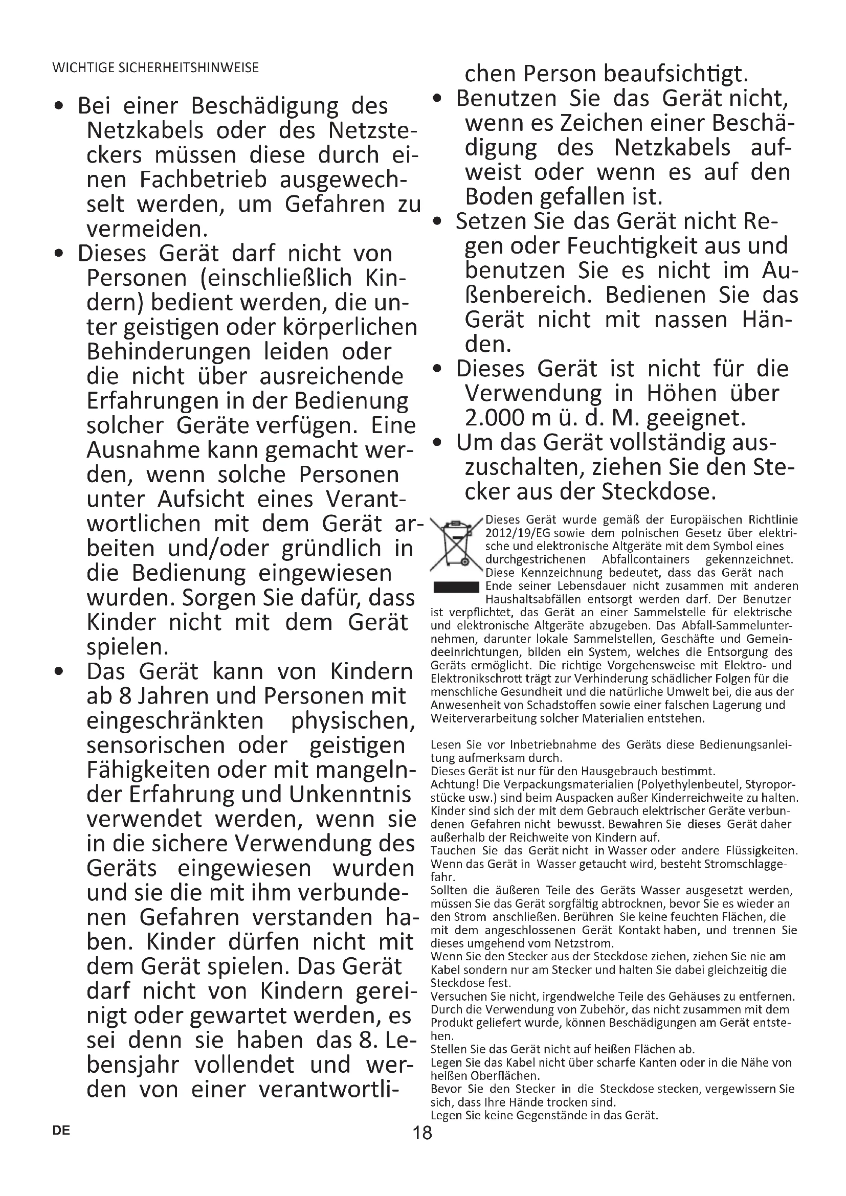- Das Gerät kann von Kindern ab 8 Jahren und Personen mit eingeschränkten physischen, sensorischen oder geisgen Fähigkeiten oder mit mangeln- der Erfahrung und Unkenntnis verwendet werden, wenn sie in die sichere Verwendung des Geräts eingewiesen wurden und sie die mit ihm verbunde- nen Gefahren verstanden ha- ben. Kinder dürfen nicht mit dem Gerät spielen. Das Gerät darf nicht von Kindern gerei- nigt oder gewartet werden, es sei denn sie haben das 8. Le- bensjahr vollendet und wer- den von einer verantwortli- chen Person beaufsichgt.