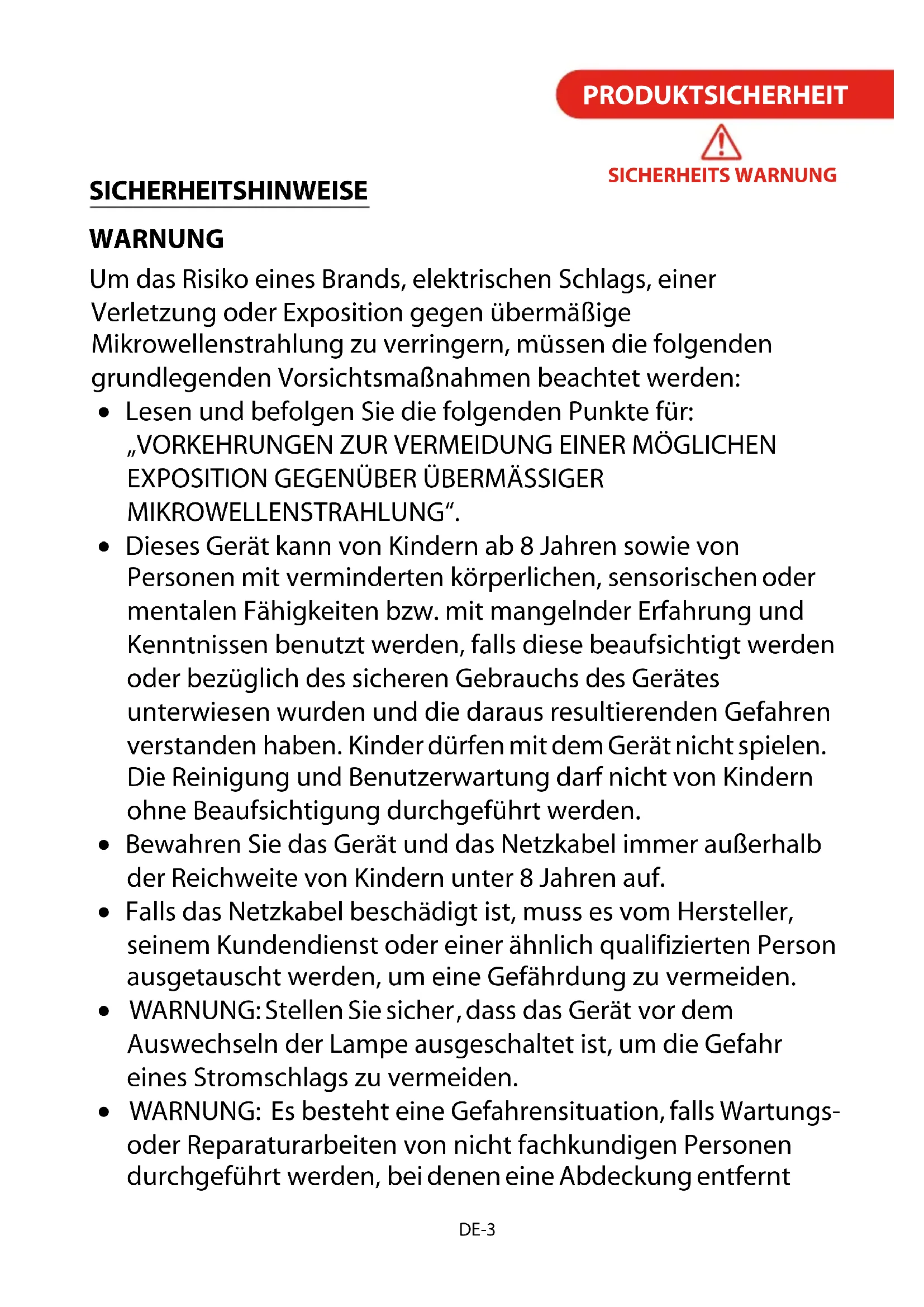 SICHERHEITSHINWEISE WARNUNG SICHERHEITS WARNUNG PRODUKTSICHERHEIT Um das Risiko eines Brands, elektrischen Schlags, einer Verletzung oder Exposition gegen übermäßige Mikrowellenstrahlung zu verringern, müssen die folgenden grundlegenden Vorsichtsmaßnahmen beachtet werden: