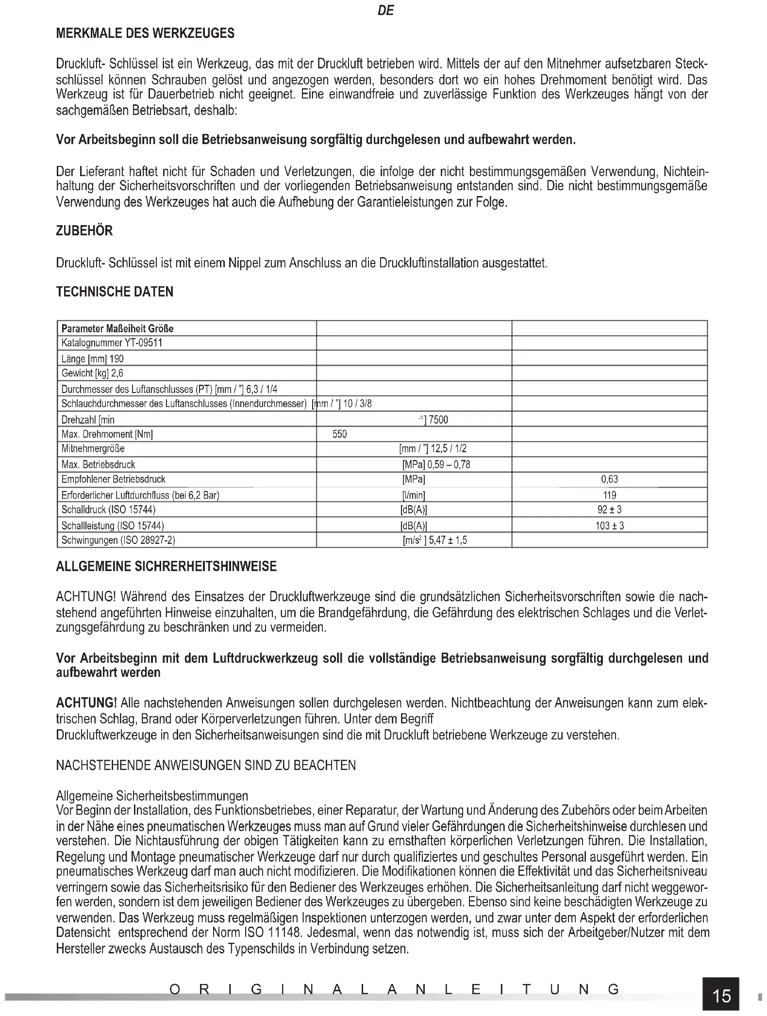 Druckluft- Schlüssel ist ein Werkzeug, das mit der Druckluft betrieben wird. Mittels der auf den Mitnehmer aufsetzbaren Steck- schlüssel können Schrauben gelöst und angezogen werden, besonders dort wo ein hohes Drehmoment benötigt wird. Das Werkzeug ist für Dauerbetrieb nicht geeignet. Eine einwandfreie und zuverlässige Funktion des Werkzeuges hängt von der sachgemäßen Betriebsart, deshalb: Vor Arbeitsbeginn soll die Betriebsanweisung sorgfältig durchgelesen und aufbewahrt werden. Der Lieferant haftet nicht für Schaden und Verletzungen, die infolge der nicht bestimmungsgemäßen Verwendung, Nichtein- haltung der Sicherheitsvorschriften und der vorliegenden Betriebsanweisung entstanden sind. Die nicht bestimmungsgemäße Verwendung des Werkzeuges hat auch die Aufhebung der Garantieleistungen zur Folge. ZUBEHÖR Druckluft- Schlüssel ist mit einem Nippel zum Anschluss an die Druckluftinstallation ausgestattet. TECHNISCHE DATEN Parameter Maßeiheit Größe Katalognummer YT-09511 Länge [mm] 190 Gewicht [kg] 2,6 Durchmesser des Luftanschlusses (PT) [mm / ”] 6,3 / 1/4 Schlauchdurchmesser des Luftanschlusses (Innendurchmesser) [mm / ”] 10 / 3/8 Drehzahl [min