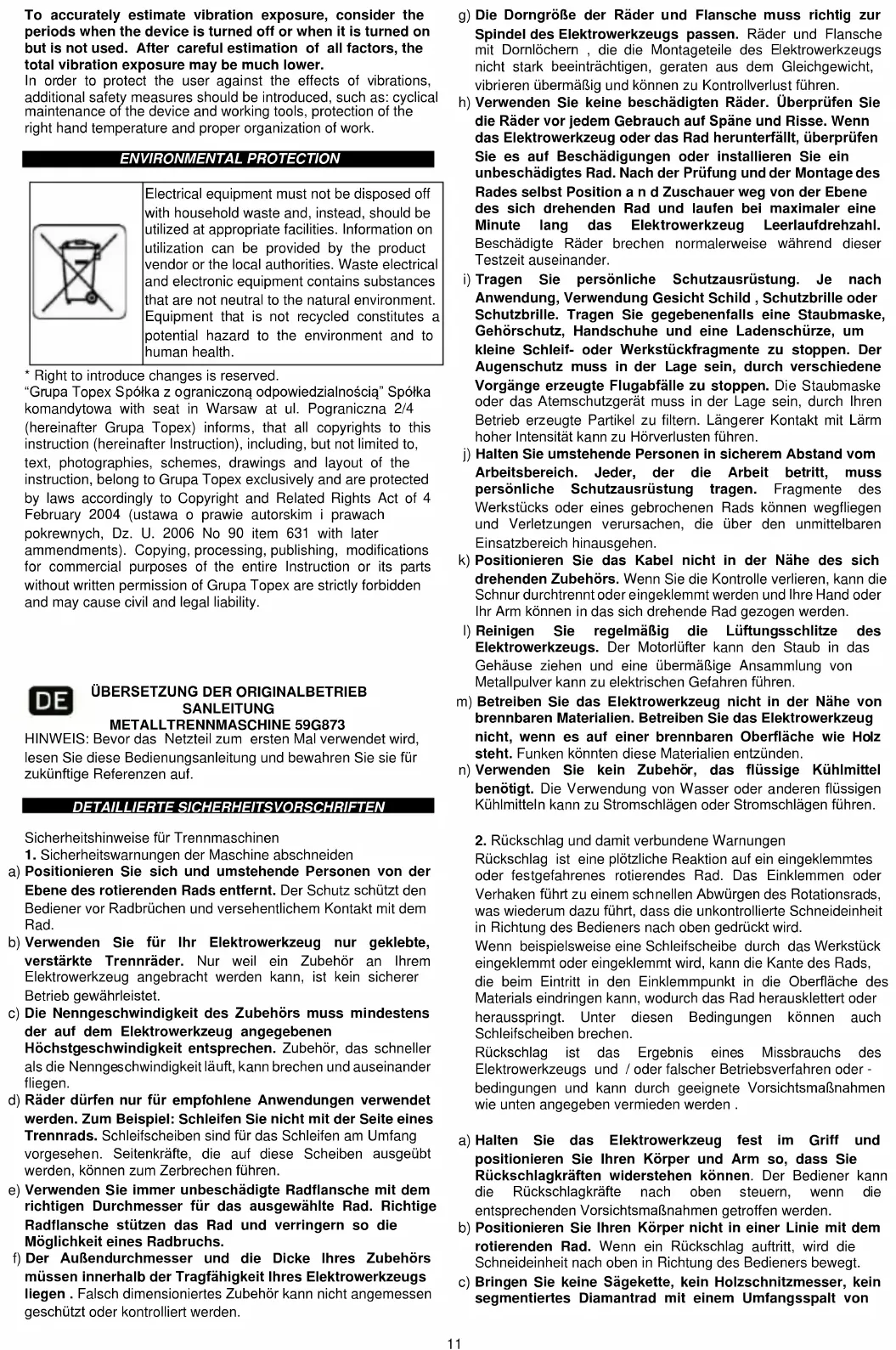 EG-Konformitätserklärung Hersteller: Grupa Topex Sp. z o.o. Sp.k., Pograniczna 2/4 02-285 Warszawa Produkt: Metallschneidemaschine Modell: 59G873 Handelsname: GRAPHITE Seriennummer: 00001 ÷ 99999 Diese Konformitätserklärung wird unter der alleinigen Verantwortung des Herstellers ausgestellt.
