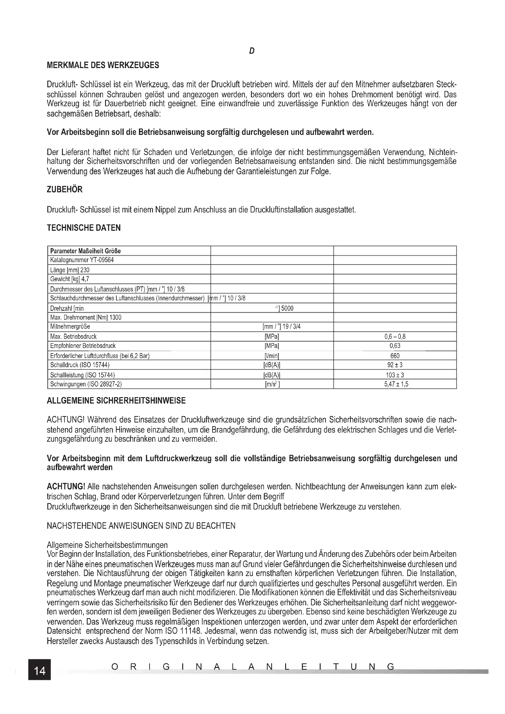 Druckluft- Schlüssel ist ein Werkzeug, das mit der Druckluft betrieben wird. Mittels der auf den Mitnehmer aufsetzbaren Steck- schlüssel können Schrauben gelöst und angezogen werden, besonders dort wo ein hohes Drehmoment benötigt wird. Das Werkzeug ist für Dauerbetrieb nicht geeignet. Eine einwandfreie und zuverlässige Funktion des Werkzeuges hängt von der sachgemäßen Betriebsart, deshalb: Vor Arbeitsbeginn soll die Betriebsanweisung sorgfältig durchgelesen und aufbewahrt werden. Der Lieferant haftet nicht für Schaden und Verletzungen, die infolge der nicht bestimmungsgemäßen Verwendung, Nichtein- haltung der Sicherheitsvorschriften und der vorliegenden Betriebsanweisung entstanden sind. Die nicht bestimmungsgemäße Verwendung des Werkzeuges hat auch die Aufhebung der Garantieleistungen zur Folge. ZUBEHÖR Druckluft- Schlüssel ist mit einem Nippel zum Anschluss an die Druckluftinstallation ausgestattet. TECHNISCHE DATEN Parameter Maßeiheit Größe Katalognummer YT-09564 Länge [mm] 230 Gewicht [kg] 4,7 Durchmesser des Luftanschlusses (PT) [mm / ”] 10 / 3/8 Schlauchdurchmesser des Luftanschlusses (Innendurchmesser) [mm / ”] 10 / 3/8 Drehzahl [min