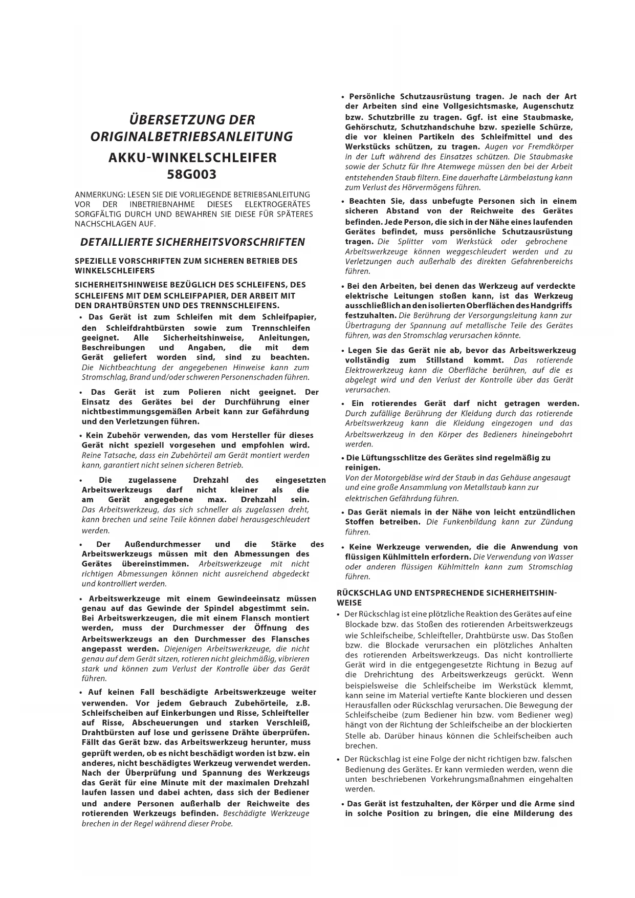- Das Gerät ist festzuhalten, der Körper und die Arme sind in solche Position zu bringen, die eine Milderung des21 Rückschlags ermöglicht. Falls ein zusätzlicher Handgriff mitgeliefert wird, ist er stets zu verwenden, um möglichst große Kontrolle über die Rückschlagkräfte bzw. dem Rückstellmoment beim Starten zu haben. Der Bediener kann die ruckartige Bewegung und den Rückschlag durch entsprechende Vorsichtsmaßnahmen unter Kontrolle bringen.