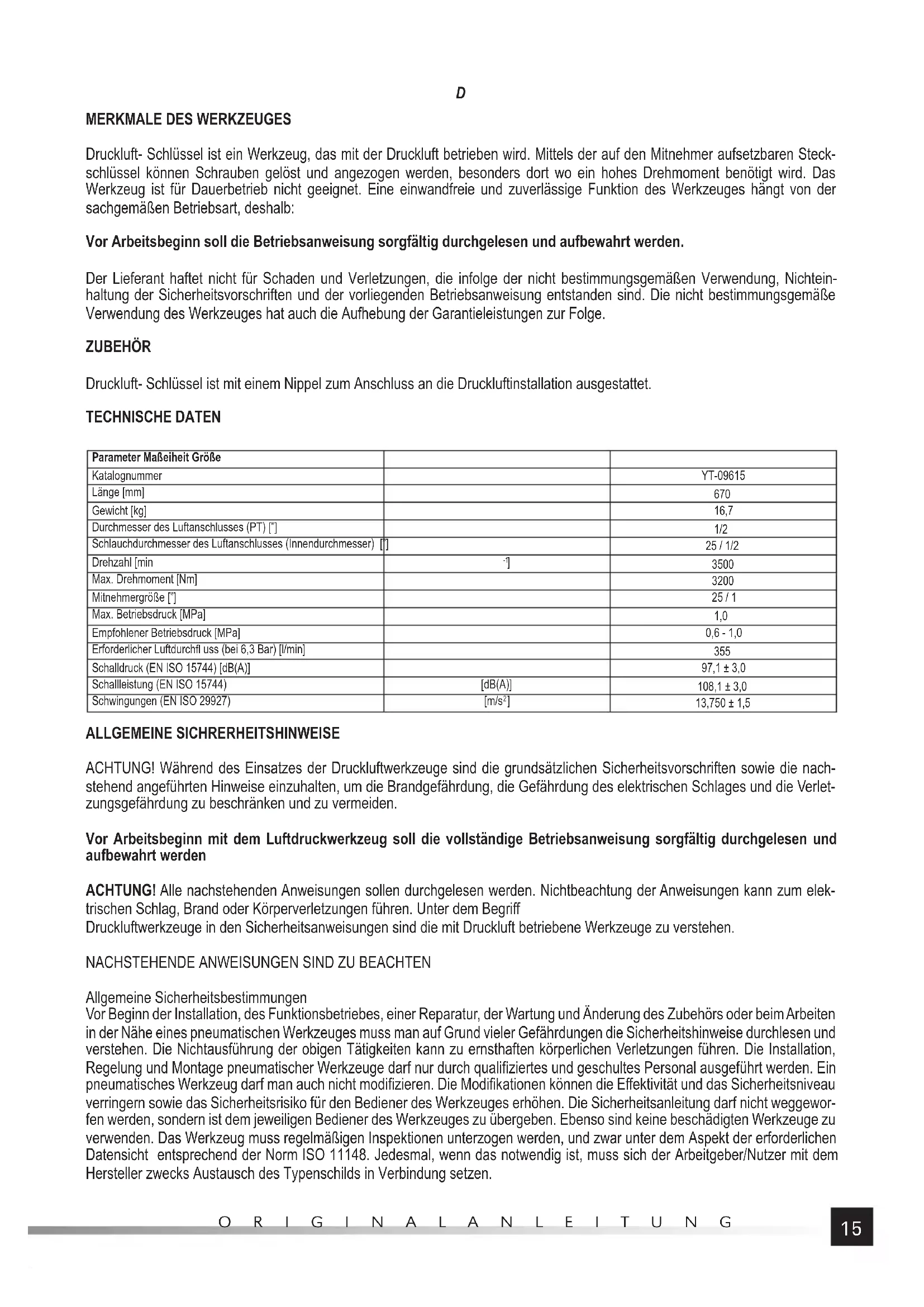 Druckluft- Schlüssel ist ein Werkzeug, das mit der Druckluft betrieben wird. Mittels der auf den Mitnehmer aufsetzbaren Steck- schlüssel können Schrauben gelöst und angezogen werden, besonders dort wo ein hohes Drehmoment benötigt wird. Das Werkzeug ist für Dauerbetrieb nicht geeignet. Eine einwandfreie und zuverlässige Funktion des Werkzeuges hängt von der sachgemäßen Betriebsart, deshalb: Vor Arbeitsbeginn soll die Betriebsanweisung sorgfältig durchgelesen und aufbewahrt werden. Der Lieferant haftet nicht für Schaden und Verletzungen, die infolge der nicht bestimmungsgemäßen Verwendung, Nichtein- haltung der Sicherheitsvorschriften und der vorliegenden Betriebsanweisung entstanden sind. Die nicht bestimmungsgemäße Verwendung des Werkzeuges hat auch die Aufhebung der Garantieleistungen zur Folge. ZUBEHÖR Druckluft- Schlüssel ist mit einem Nippel zum Anschluss an die Druckluftinstallation ausgestattet. TECHNISCHE DATEN Parameter Maßeiheit Größe Katalognummer YT-09615 Länge [mm]