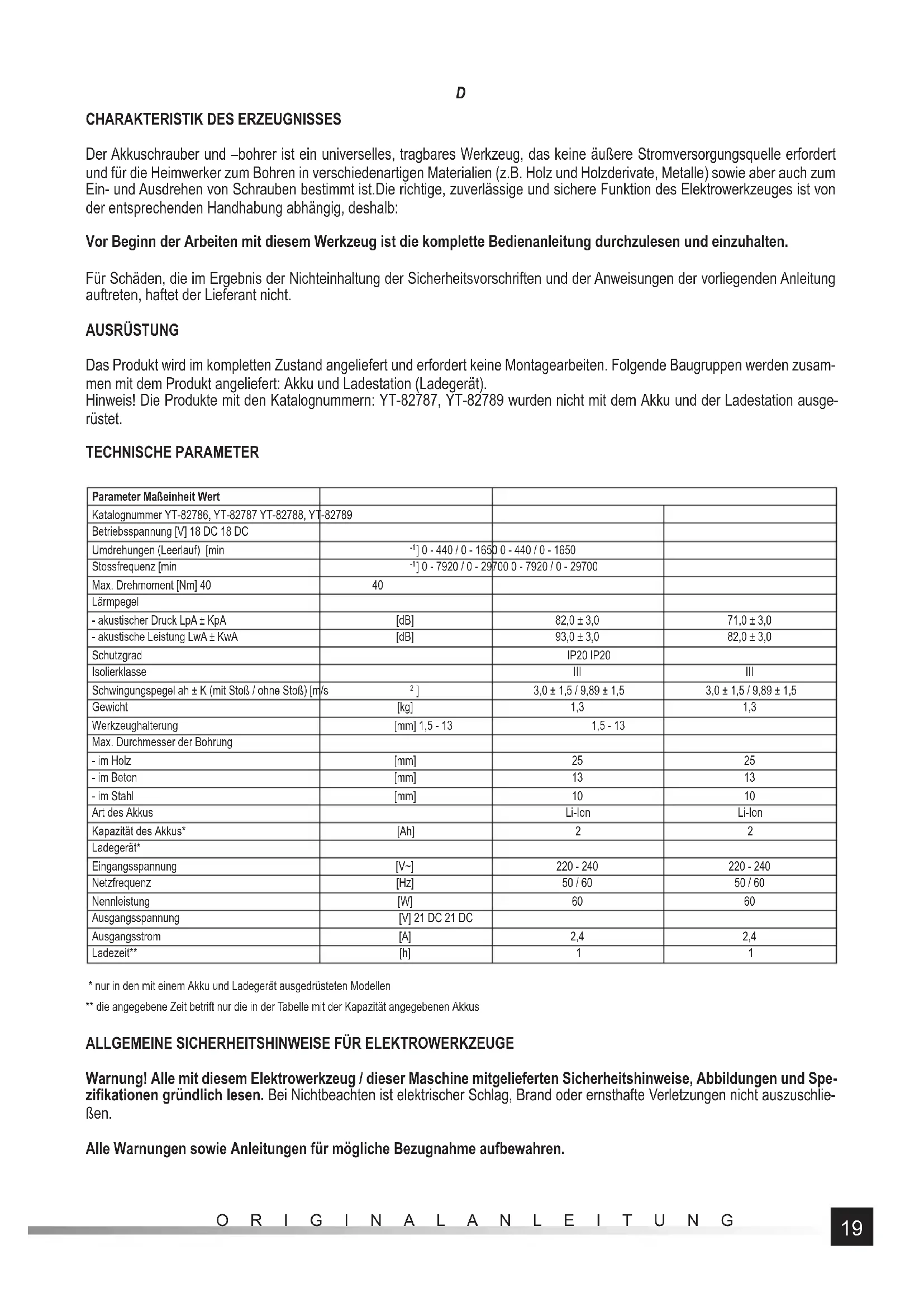 Der Akkuschrauber und –bohrer ist ein universelles, tragbares Werkzeug, das keine äußere Stromversorgungsquelle erfordert und für die Heimwerker zum Bohren in verschiedenartigen Materialien (z.B. Holz und Holzderivate, Metalle) sowie aber auch zum Ein- und Ausdrehen von Schrauben bestimmt ist.Die richtige, zuverlässige und sichere Funktion des Elektrowerkzeuges ist von der entsprechenden Handhabung abhängig, deshalb: Vor Beginn der Arbeiten mit diesem Werkzeug ist die komplette Bedienanleitung durchzulesen und einzuhalten. Für Schäden, die im Ergebnis der Nichteinhaltung der Sicherheitsvorschriften und der Anweisungen der vorliegenden Anleitung auftreten, haftet der Lieferant nicht. AUSRÜSTUNG Das Produkt wird im kompletten Zustand angeliefert und erfordert keine Montagearbeiten. Folgende Baugruppen werden zusam- men mit dem Produkt angeliefert: Akku und Ladestation (Ladegerät). Hinweis! Die Produkte mit den Katalognummern: YT-82787, YT-82789 wurden nicht mit dem Akku und der Ladestation ausge- rüstet. TECHNISCHE PARAMETER Parameter Maßeinheit Wert Katalognummer YT-82786, YT-82787 YT-82788, YT-82789 Betriebsspannung [V] 18 DC 18 DC Umdrehungen (Leerlauf) [min