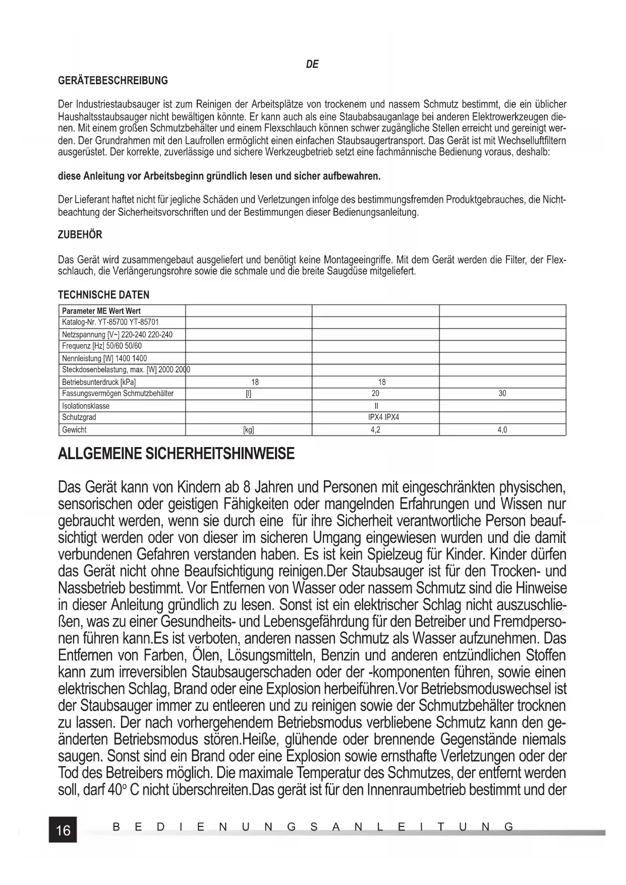 GERÄTEBESCHREIBUNG Der Industriestaubsauger ist zum Reinigen der Arbeitsplätze von trockenem und nassem Schmutz bestimmt, die ein üblicher Haushaltsstaubsauger nicht bewältigen könnte. Er kann auch als eine Staubabsauganlage bei anderen Elektrowerkzeugen die- nen. Mit einem großen Schmutzbehälter und einem Flexschlauch können schwer zugängliche Stellen erreicht und gereinigt wer- den. Der Grundrahmen mit den Laufrollen ermöglicht einen einfachen Staubsaugertransport. Das Gerät ist mit Wechselluftfi ltern ausgerüstet. Der korrekte, zuverlässige und sichere Werkzeugbetrieb setzt eine fachmännische Bedienung voraus, deshalb: diese Anleitung vor Arbeitsbeginn gründlich lesen und sicher aufbewahren. Der Lieferant haftet nicht für jegliche Schäden und Verletzungen infolge des bestimmungsfremden Produktgebrauches, die Nicht- beachtung der Sicherheitsvorschriften und der Bestimmungen dieser Bedienungsanleitung. ZUBEHÖR Das Gerät wird zusammengebaut ausgeliefert und benötigt keine Montageeingriff e. Mit dem Gerät werden die Filter, der Flex- schlauch, die Verlängerungsrohre sowie die schmale und die breite Saugdüse mitgeliefert. TECHNISCHE DATEN Parameter ME Wert Wert Katalog-Nr. YT-85700 YT-85701 Netzspannung [V~] 220-240 220-240 Frequenz [Hz] 50/60 50/60 Nennleistung [W] 1400 1400 Steckdosenbelastung, max. [W] 2000 2000 Betriebsunterdruck [kPa] 18 18 Fassungsvermögen Schmutzbehälter [l] 20 30 Isolationsklasse II Schutzgrad IPX4 IPX4 Gewicht [kg] 4,2 4,0 ALLGEMEINE SICHERHEITSHINWEISE Das Gerät kann von Kindern ab 8 Jahren und Personen mit eingeschränkten physischen, sensorischen oder geistigen Fähigkeiten oder mangelnden Erfahrungen und Wissen nur gebraucht werden, wenn sie durch eine für ihre Sicherheit verantwortliche Person beauf- sichtigt werden oder von dieser im sicheren Umgang eingewiesen wurden und die damit verbundenen Gefahren verstanden haben. Es ist kein Spielzeug für Kinder. Kinder dürfen das Gerät nicht ohne Beaufsichtigung reinigen.Der Staubsauger ist für den Trocken- und Nassbetrieb bestimmt. Vor Entfernen von Wasser oder nassem Schmutz sind die Hinweise in dieser Anleitung gründlich zu lesen. Sonst ist ein elektrischer Schlag nicht auszuschlie- ßen, was zu einer Gesundheits- und Lebensgefährdung für den Betreiber und Fremdperso- nen führen kann.Es ist verboten, anderen nassen Schmutz als Wasser aufzunehmen. Das Entfernen von Farben, Ölen, Lösungsmitteln, Benzin und anderen entzündlichen Stoff en kann zum irreversiblen Staubsaugerschaden oder der -komponenten führen, sowie einen elektrischen Schlag, Brand oder eine Explosion herbeiführen.Vor Betriebsmoduswechsel ist der Staubsauger immer zu entleeren und zu reinigen sowie der Schmutzbehälter trocknen zu lassen. Der nach vorhergehendem Betriebsmodus verbliebene Schmutz kann den ge- änderten Betriebsmodus stören.Heiße, glühende oder brennende Gegenstände niemals saugen. Sonst sind ein Brand oder eine Explosion sowie ernsthafte Verletzungen oder der Tod des Betreibers möglich. Die maximale Temperatur des Schmutzes, der entfernt werden soll, darf 40