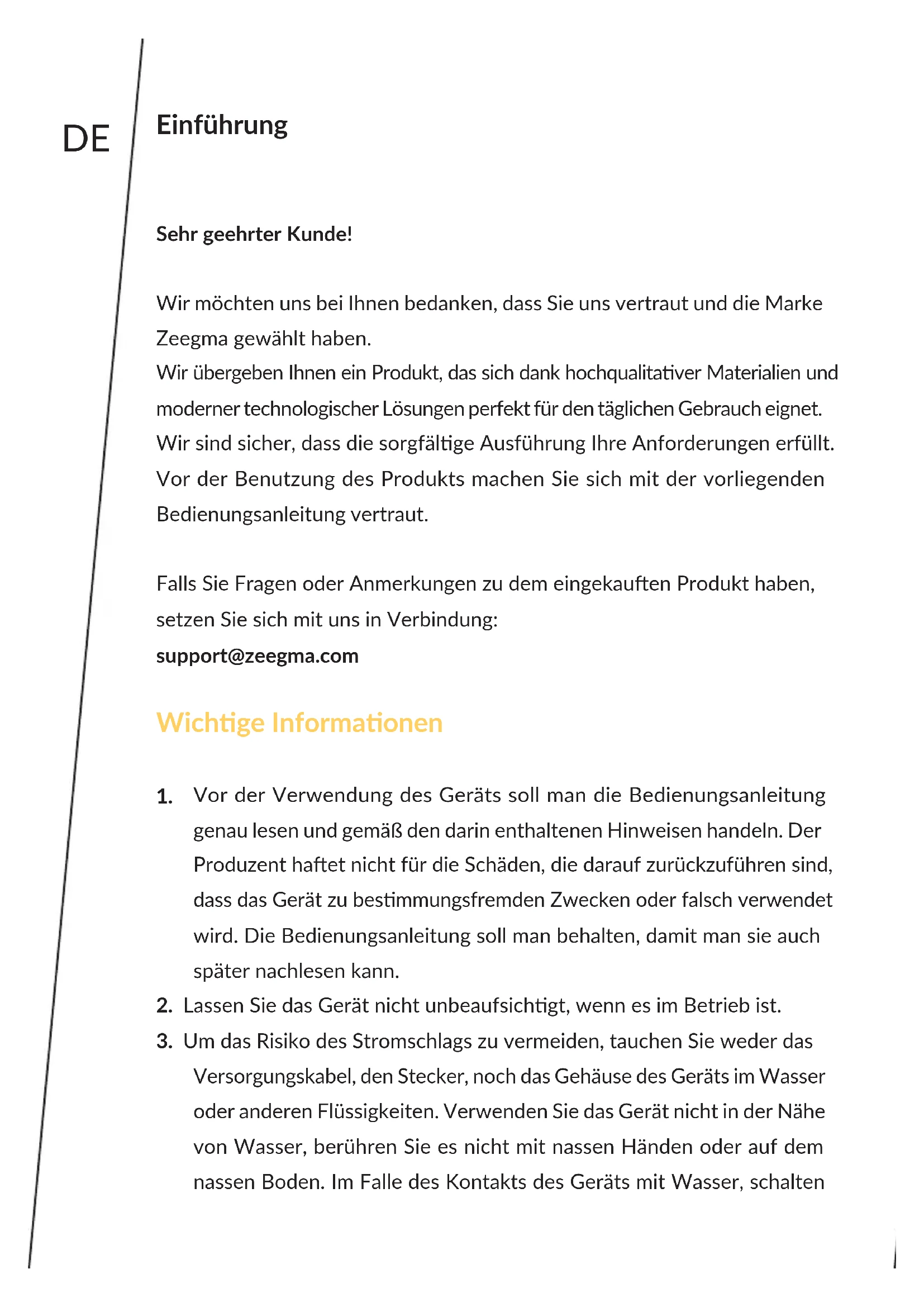 The pictures are for reference only. The real design of the products may dier from the pictures presented.DE Einführung Sehr geehrter Kunde! Wir möchten uns bei Ihnen bedanken, dass Sie uns vertraut und die Marke Zeegma gewählt haben. Wir übergeben Ihnen ein Produkt, das sich dank hochqualitaver Materialien und moderner technologischer Lösungen perfekt für den täglichen Gebrauch eignet. Wir sind sicher, dass die sorgfälge Ausführung Ihre Anforderungen erfüllt. Vor der Benutzung des Produkts machen Sie sich mit der vorliegenden Bedienungsanleitung vertraut. Falls Sie Fragen oder Anmerkungen zu dem eingekauen Produkt haben, setzen Sie sich mit uns in Verbindung: support@zeegma.com Wichge Informaonen