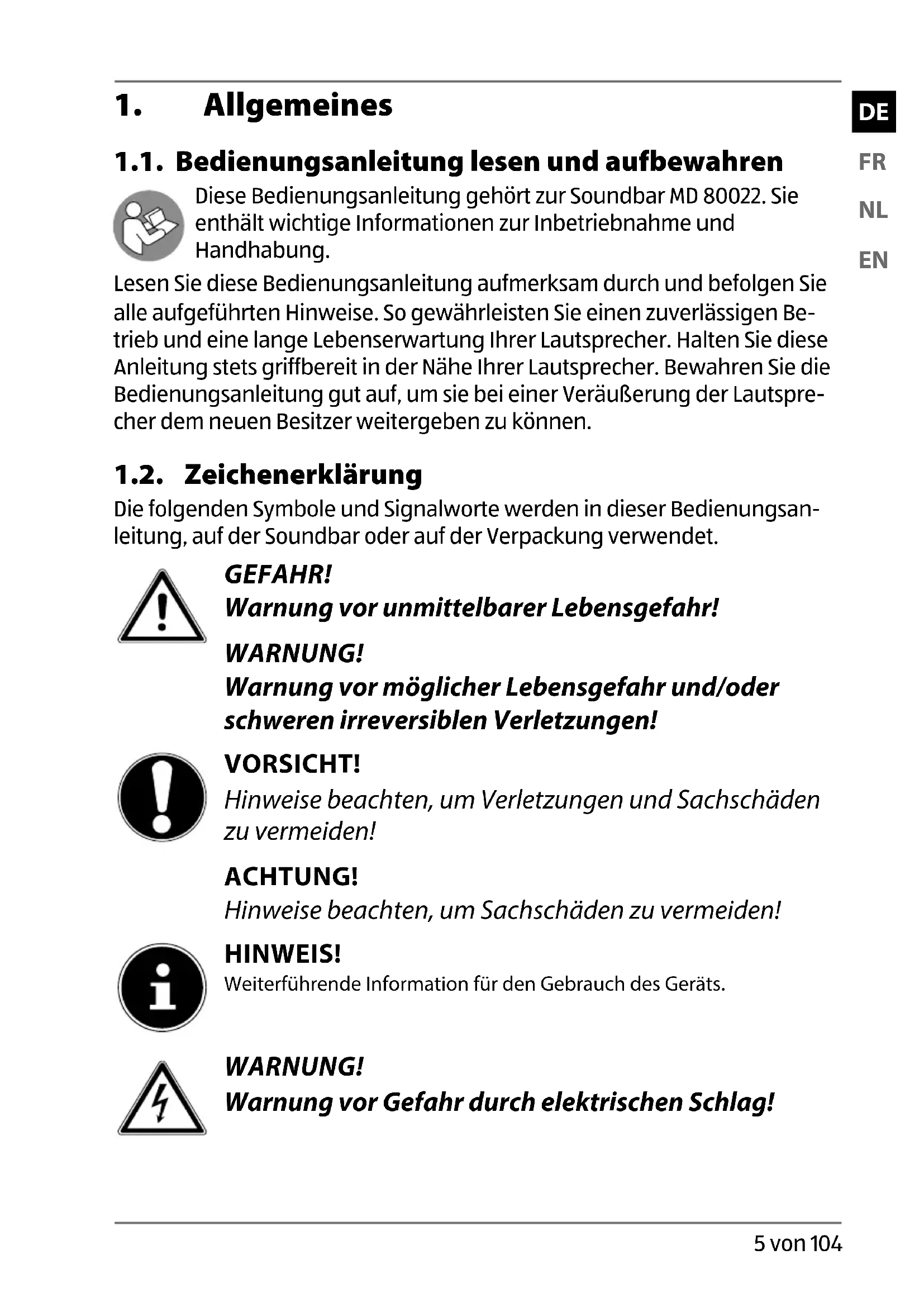 4 von 104 80022 DE-FR-NL-EN eCommerce Content RC1.indb 480022 DE-FR-NL-EN eCommerce Content RC1.indb 4 31.07.2015 08:49:0631.07.2015 08:49:061. Allgemeines 1.1. Bedienungsanleitung lesen und aufbewahren Diese Bedienungsanleitung gehört zur Soundbar MD 80022. Sie enthält wichtige Informationen zur Inbetriebnahme und Handhabung. Lesen Sie diese Bedienungsanleitung aufmerksam durch und befolgen Sie alle aufgeführten Hinweise. So gewährleisten Sie einen zuverlässigen Be- trieb und eine lange Lebenserwartung Ihrer Lautsprecher. Halten Sie diese Anleitung stets griffbereit in der Nähe Ihrer Lautsprecher. Bewahren Sie die Bedienungsanleitung gut auf, um sie bei einer Veräußerung der Lautspre- cher dem neuen Besitzer weitergeben zu können. 1.2. Zeichenerklärung Die folgenden Symbole und Signalworte werden in dieser Bedienungsan- leitung, auf der Soundbar oder auf der Verpackung verwendet. GEFAHR! Warnung vor unmittelbarer Lebensgefahr! WARNUNG! Warnung vor möglicher Lebensgefahr und/oder schweren irreversiblen Verletzungen! VORSICHT! Hinweise beachten, um Verletzungen und Sachschäden zu vermeiden! ACHTUNG! Hinweise beachten, um Sachschäden zu vermeiden! HINWEIS! Weiterführende Information für den Gebrauch des Geräts. WARNUNG! Warnung vor Gefahr durch elektrischen Schlag!