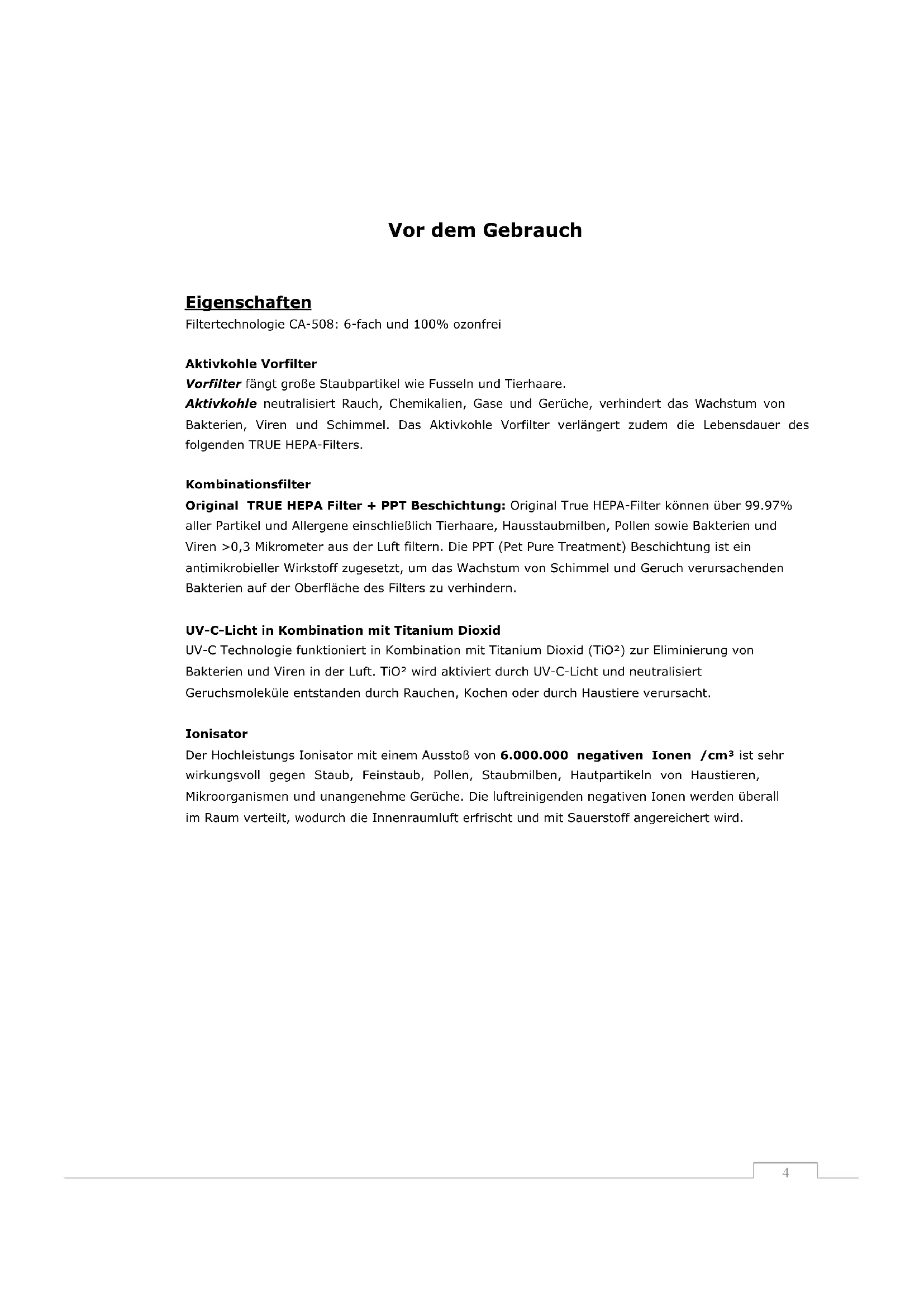 Eigenschaften Filtertechnologie CA-508: 6-fach und 100% ozonfrei Aktivkohle Vorfilter Vorfilter fängt große Staubpartikel wie Fusseln und Tierhaare. Aktivkohle neutralisiert Rauch, Chemikalien, Gase und Gerüche, verhindert das Wachstum von Bakterien, Viren und Schimmel. Das Aktivkohle Vorfilter verlängert zudem die Lebensdauer des folgenden TRUE HEPA-Filters. Kombinationsfilter Original TRUE HEPA Filter + PPT Beschichtung: Original True HEPA-Filter können über 99.97% aller Partikel und Allergene einschließlich Tierhaare, Hausstaubmilben, Pollen sowie Bakterien und Viren >0,3 Mikrometer aus der Luft filtern. Die PPT (Pet Pure Treatment) Beschichtung ist ein antimikrobieller Wirkstoff zugesetzt, um das Wachstum von Schimmel und Geruch verursachenden Bakterien auf der Oberfläche des Filters zu verhindern. UV-C-Licht in Kombination mit Titanium Dioxid UV-C Technologie funktioniert in Kombination mit Titanium Dioxid (TiO²) zur Eliminierung von Bakterien und Viren in der Luft. TiO² wird aktiviert durch UV-C-Licht und neutralisiert Geruchsmoleküle entstanden durch Rauchen, Kochen oder durch Haustiere verursacht. Ionisator Der Hochleistungs Ionisator mit einem Ausstoß von 6.000.000 negativen Ionen /cm³ ist sehr wirkungsvoll gegen Staub, Feinstaub, Pollen, Staubmilben, Hautpartikeln von Haustieren, Mikroorganismen und unangenehme Gerüche. Die luftreinigenden negativen Ionen werden überall im Raum verteilt, wodurch die Innenraumluft erfrischt und mit Sauerstoff angereichert wird.5 Sicherheitshinweise Treffen Sie immer folgende Vorkehrungen, damit Sie das Verletzungsrisiko, zum Beispiel durch elektrische Schläge oder Brand, so gering wie möglich halten.