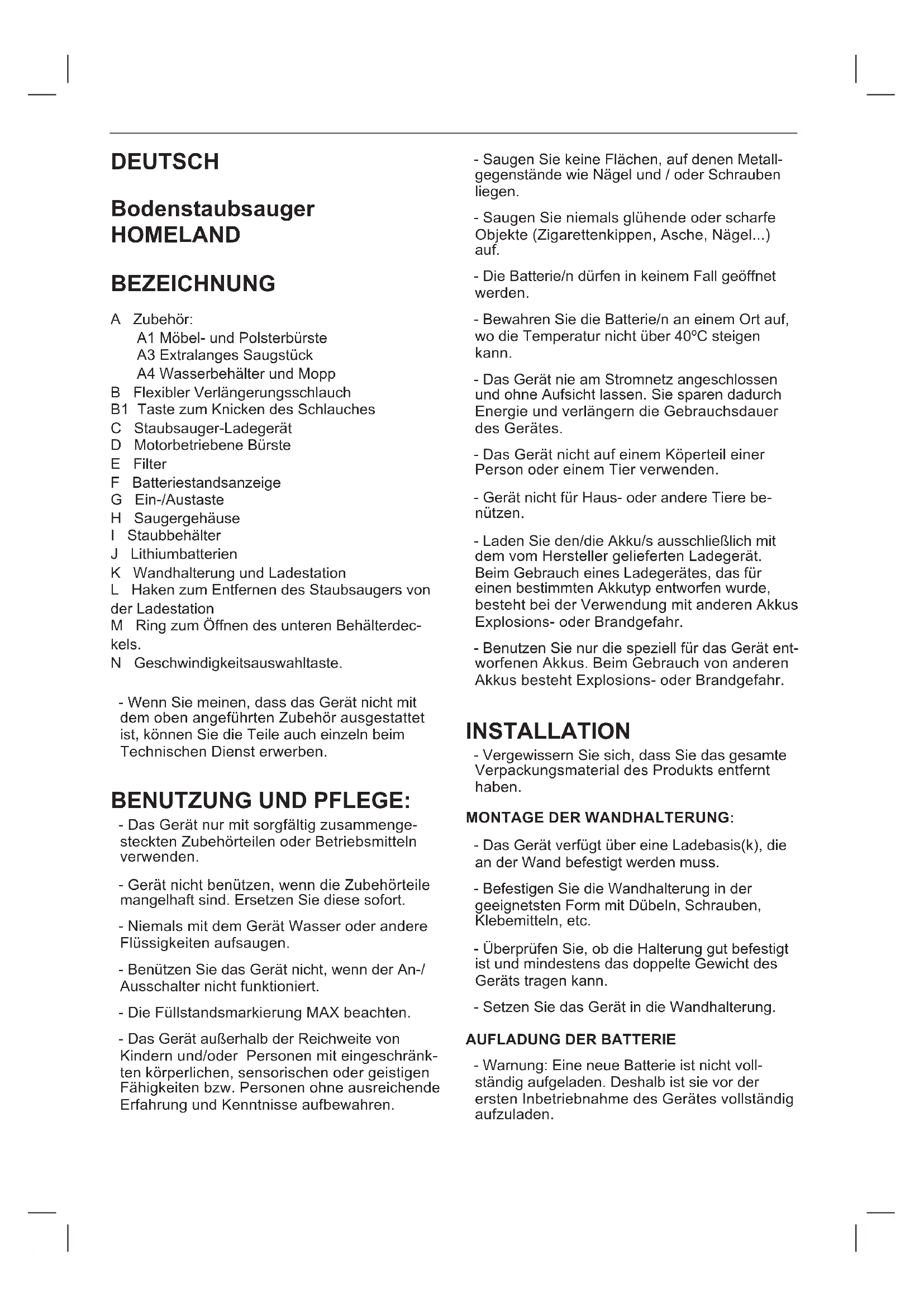 FOIS LA VIE DE L’APPAREIL TERMINÉE, RÉALISER LES ACTIONS SUIVANTES : - Retirer le boîtier supérieur de l’appareil, la par- tie située au-dessus de la poignée, pour retirer le boîtier. Il est nécessaire de faire levier sur la partie inférieure pour libérer les languettes de xation. (Fig.7). - Identier la batterie et couper les 4 câbles con- nectés à la batterie . An d’éviter tout risque de court-circuit, protéger la partie conductrice avec du ruban isolant. (Fig.8) - Retirer la batterie de son logement, en toute sécurité.DEUTSCH Bodenstaubsauger HOMELAND BEZEICHNUNG A Zubehör: A1 Möbel- und Polsterbürste A3 Extralanges Saugstück A4 Wasserbehälter und Mopp B Flexibler Verlängerungsschlauch B1 Taste zum Knicken des Schlauches C Staubsauger-Ladegerät D Motorbetriebene Bürste E Filter F Batteriestandsanzeige G Ein-/Austaste H Saugergehäuse I Staubbehälter J Lithiumbatterien K Wandhalterung und Ladestation L Haken zum Entfernen des Staubsaugers von der Ladestation M Ring zum Öffnen des unteren Behälterdec- kels. N Geschwindigkeitsauswahltaste. - Wenn Sie meinen, dass das Gerät nicht mit dem oben angeführten Zubehör ausgestattet ist, können Sie die Teile auch einzeln beim Technischen Dienst erwerben. BENUTZUNG UND PFLEGE: - Das Gerät nur mit sorgfältig zusammenge- steckten Zubehörteilen oder Betriebsmitteln verwenden. - Gerät nicht benützen, wenn die Zubehörteile mangelhaft sind. Ersetzen Sie diese sofort. - Niemals mit dem Gerät Wasser oder andere Flüssigkeiten aufsaugen. - Benützen Sie das Gerät nicht, wenn der An-/ Ausschalter nicht funktioniert. - Die Füllstandsmarkierung MAX beachten. - Das Gerät außerhalb der Reichweite von Kindern und/oder Personen mit eingeschränk- ten körperlichen, sensorischen oder geistigen Fähigkeiten bzw. Personen ohne ausreichende Erfahrung und Kenntnisse aufbewahren. - Saugen Sie keine Flächen, auf denen Metall- gegenstände wie Nägel und / oder Schrauben liegen. - Saugen Sie niemals glühende oder scharfe Objekte (Zigarettenkippen, Asche, Nägel...) auf. - Die Batterie/n dürfen in keinem Fall geöffnet werden. - Bewahren Sie die Batterie/n an einem Ort auf, wo die Temperatur nicht über 40ºC steigen kann. - Das Gerät nie am Stromnetz angeschlossen und ohne Aufsicht lassen. Sie sparen dadurch Energie und verlängern die Gebrauchsdauer des Gerätes. - Das Gerät nicht auf einem Köperteil einer Person oder einem Tier verwenden. - Gerät nicht für Haus- oder andere Tiere be- nützen. - Laden Sie den/die Akku/s ausschließlich mit dem vom Hersteller gelieferten Ladegerät. Beim Gebrauch eines Ladegerätes, das für einen bestimmten Akkutyp entworfen wurde, besteht bei der Verwendung mit anderen Akkus Explosions- oder Brandgefahr. - Benutzen Sie nur die speziell für das Gerät ent- worfenen Akkus. Beim Gebrauch von anderen Akkus besteht Explosions- oder Brandgefahr. INSTALLATION - Vergewissern Sie sich, dass Sie das gesamte Verpackungsmaterial des Produkts entfernt haben. MONTAGE DER WANDHALTERUNG: - Das Gerät verfügt über eine Ladebasis(k), die an der Wand befestigt werden muss. - Befestigen Sie die Wandhalterung in der geeignetsten Form mit Dübeln, Schrauben, Klebemitteln, etc. - Überprüfen Sie, ob die Halterung gut befestigt ist und mindestens das doppelte Gewicht des Geräts tragen kann. - Setzen Sie das Gerät in die Wandhalterung.