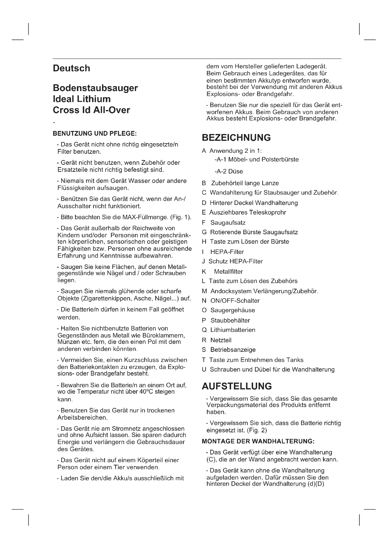 BENUTZUNG UND PFLEGE: - Das Gerät nicht ohne richtig eingesetzte/n Filter benutzen. - Gerät nicht benutzen, wenn Zubehör oder Ersatzteile nicht richtig befestigt sind. - Niemals mit dem Gerät Wasser oder andere Flüssigkeiten aufsaugen. - Benützen Sie das Gerät nicht, wenn der An-/ Ausschalter nicht funktioniert. - Bitte beachten Sie die MAX-Füllmenge. (Fig. 1). - Das Gerät außerhalb der Reichweite von Kindern und/oder Personen mit eingeschränk- ten körperlichen, sensorischen oder geistigen Fähigkeiten bzw. Personen ohne ausreichende Erfahrung und Kenntnisse aufbewahren. - Saugen Sie keine Flächen, auf denen Metall- gegenstände wie Nägel und / oder Schrauben liegen. - Saugen Sie niemals glühende oder scharfe Objekte (Zigarettenkippen, Asche, Nägel...) auf. - Die Batterie/n dürfen in keinem Fall geöffnet werden. - Halten Sie nichtbenutzte Batterien von Gegenständen aus Metall wie Büroklammern, Münzen etc. fern, die den einen Pol mit dem anderen verbinden könnten. - Vermeiden Sie, einen Kurzschluss zwischen den Batteriekontakten zu erzeugen, da Explo- sions- oder Brandgefahr besteht. - Bewahren Sie die Batterie/n an einem Ort auf, wo die Temperatur nicht über 40ºC steigen kann. - Benutzen Sie das Gerät nur in trockenen Arbeitsbereichen. - Das Gerät nie am Stromnetz angeschlossen und ohne Aufsicht lassen. Sie sparen dadurch Energie und verlängern die Gebrauchsdauer des Gerätes. - Das Gerät nicht auf einem Köperteil einer Person oder einem Tier verwenden. - Laden Sie den/die Akku/s ausschließlich mit dem vom Hersteller gelieferten Ladegerät. Beim Gebrauch eines Ladegerätes, das für einen bestimmten Akkutyp entworfen wurde, besteht bei der Verwendung mit anderen Akkus Explosions- oder Brandgefahr. - Benutzen Sie nur die speziell für das Gerät ent- worfenen Akkus. Beim Gebrauch von anderen Akkus besteht Explosions- oder Brandgefahr. BEZEICHNUNG A Anwendung 2 in 1: -A-1 Möbel- und Polsterbürste -A-2 Düse B Zubehörteil lange Lanze C Wandahlterung für Staubsauger und Zubehör. D Hinterer Deckel Wandhalterung E Ausziehbares Teleskoprohr F Saugaufsatz G Rotierende Bürste Saugaufsatz H Taste zum Lösen der Bürste I HEPA-Filter J Schutz HEPA-Filter K Metalllter L Taste zum Lösen des Zubehörs M Andocksystem Verlängerung/Zubehör. N ON/OFF-Schalter O Saugergehäuse P Staubbehälter Q Lithiumbatterien R Netzteil S Betriebsanzeige T Taste zum Entnehmen des Tanks U Schrauben und Dübel für die Wandhalterung AUFSTELLUNG - Vergewissern Sie sich, dass Sie das gesamte Verpackungsmaterial des Produkts entfernt haben. - Vergewissern Sie sich, dass die Batterie richtig eingesetzt ist. (Fig. 2) MONTAGE DER WANDHALTERUNG: - Das Gerät verfügt über eine Wandhalterung (C), die an der Wand angebracht werden kann. - Das Gerät kann ohne die Wandhalterung aufgeladen werden. Dafür müssen Sie den hinteren Deckel der Wandhalterung (d)(D)abschrauben und das Kabel des Ladegeräts herausziehen, es kann direkt an den Staubsau- ger angeschlossen werden. - Befestigen Sie die Wandhalterung in der geeignetsten Form mit Dübeln, Schrauben, Klebemitteln, etc. - Überprüfen Sie, ob die Halterung gut befestigt ist und mindestens das doppelte Gewicht des Geräts tragen kann. - Setzen Sie das Gerät in die Wandhalterung.