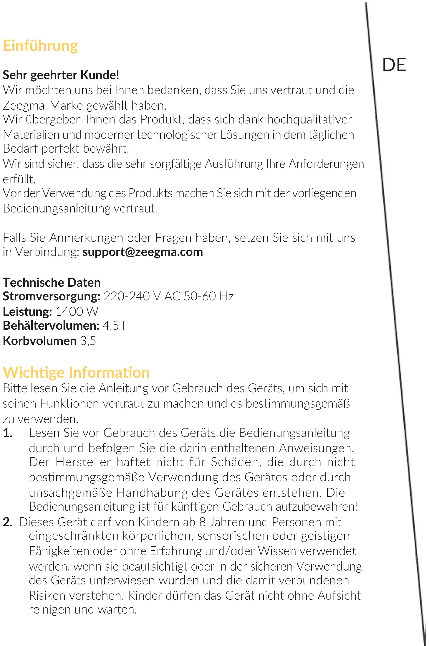 - Parts of the device in contact with food can be washed in the dishwasher. The photos are for reference only, the actual look of the products may dier from the ones shown in the pictures.DE Einführung Sehr geehrter Kunde! Wir möchten uns bei Ihnen bedanken, dass Sie uns vertraut und die Zeegma-Marke gewählt haben. Wir übergeben Ihnen das Produkt, dass sich dank hochqualitaver Materialien und moderner technologischer Lösungen in dem täglichen Bedarf perfekt bewährt. Wir sind sicher, dass die sehr sorgfälge Ausführung Ihre Anforderungen erfüllt. Vor der Verwendung des Produkts machen Sie sich mit der vorliegenden Bedienungsanleitung vertraut. Falls Sie Anmerkungen oder Fragen haben, setzen Sie sich mit uns in Verbindung: support@zeegma.com Technische Daten Stromversorgung: 220-240 V AC 50-60 Hz Leistung: 1400 W Behältervolumen: 4,5 l Korbvolumen 3,5 l Wichge Informaon Bie lesen Sie die Anleitung vor Gebrauch des Geräts, um sich mit seinen Funkonen vertraut zu machen und es besmmungsgemäß zu verwenden.
