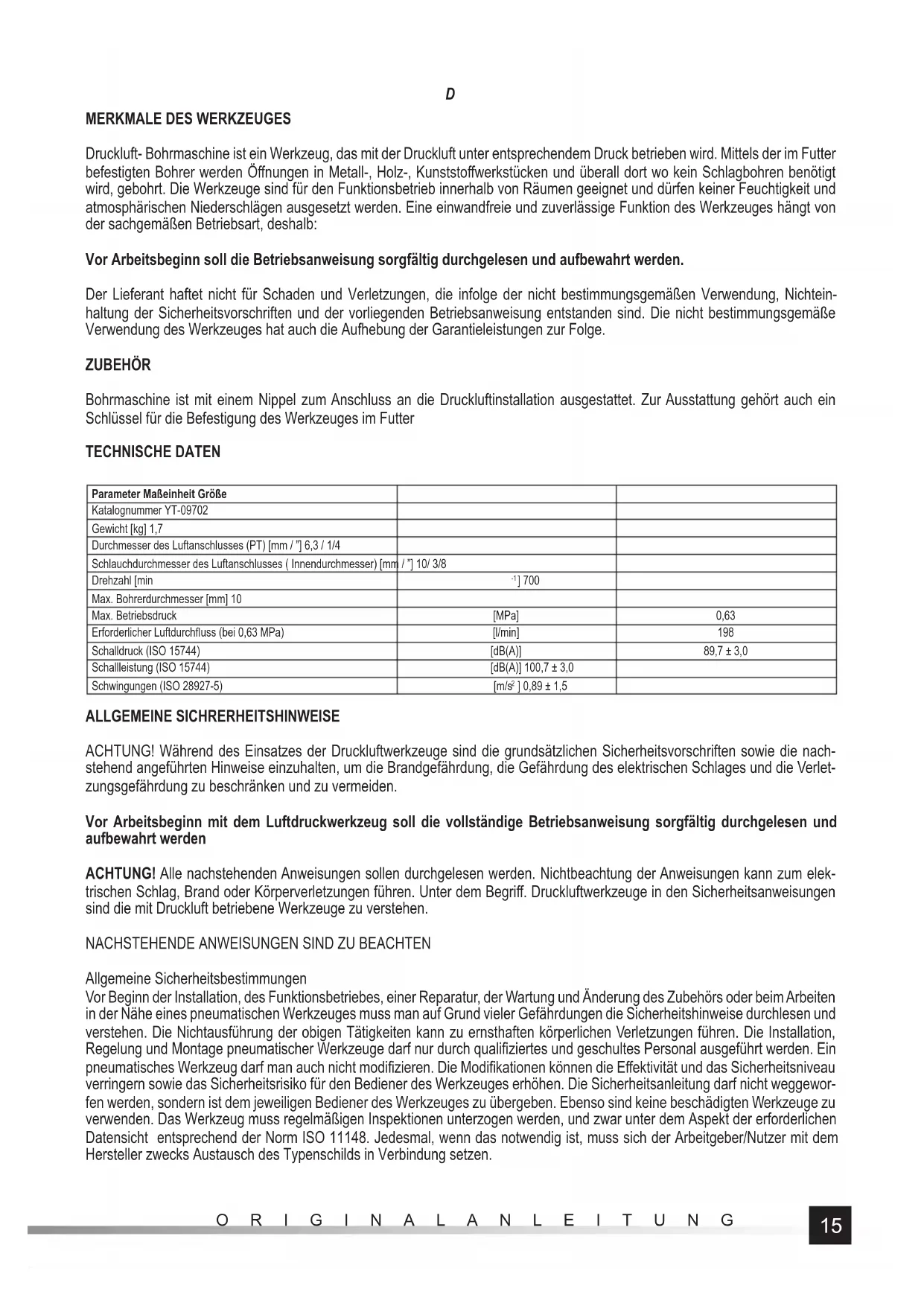 Druckluft- Bohrmaschine ist ein Werkzeug, das mit der Druckluft unter entsprechendem Druck betrieben wird. Mittels der im Futter befestigten Bohrer werden Öff nungen in Metall-, Holz-, Kunststoff werkstücken und überall dort wo kein Schlagbohren benötigt wird, gebohrt. Die Werkzeuge sind für den Funktionsbetrieb innerhalb von Räumen geeignet und dürfen keiner Feuchtigkeit und atmosphärischen Niederschlägen ausgesetzt werden. Eine einwandfreie und zuverlässige Funktion des Werkzeuges hängt von der sachgemäßen Betriebsart, deshalb: Vor Arbeitsbeginn soll die Betriebsanweisung sorgfältig durchgelesen und aufbewahrt werden. Der Lieferant haftet nicht für Schaden und Verletzungen, die infolge der nicht bestimmungsgemäßen Verwendung, Nichtein- haltung der Sicherheitsvorschriften und der vorliegenden Betriebsanweisung entstanden sind. Die nicht bestimmungsgemäße Verwendung des Werkzeuges hat auch die Aufhebung der Garantieleistungen zur Folge. ZUBEHÖR Bohrmaschine ist mit einem Nippel zum Anschluss an die Druckluftinstallation ausgestattet. Zur Ausstattung gehört auch ein Schlüssel für die Befestigung des Werkzeuges im Futter TECHNISCHE DATEN Parameter Maßeinheit Größe Katalognummer YT-09702 Gewicht [kg] 1,7 Durchmesser des Luftanschlusses (PT) [mm / ”] 6,3 / 1/4 Schlauchdurchmesser des Luftanschlusses ( Innendurchmesser) [mm / ”] 10/ 3/8 Drehzahl [min