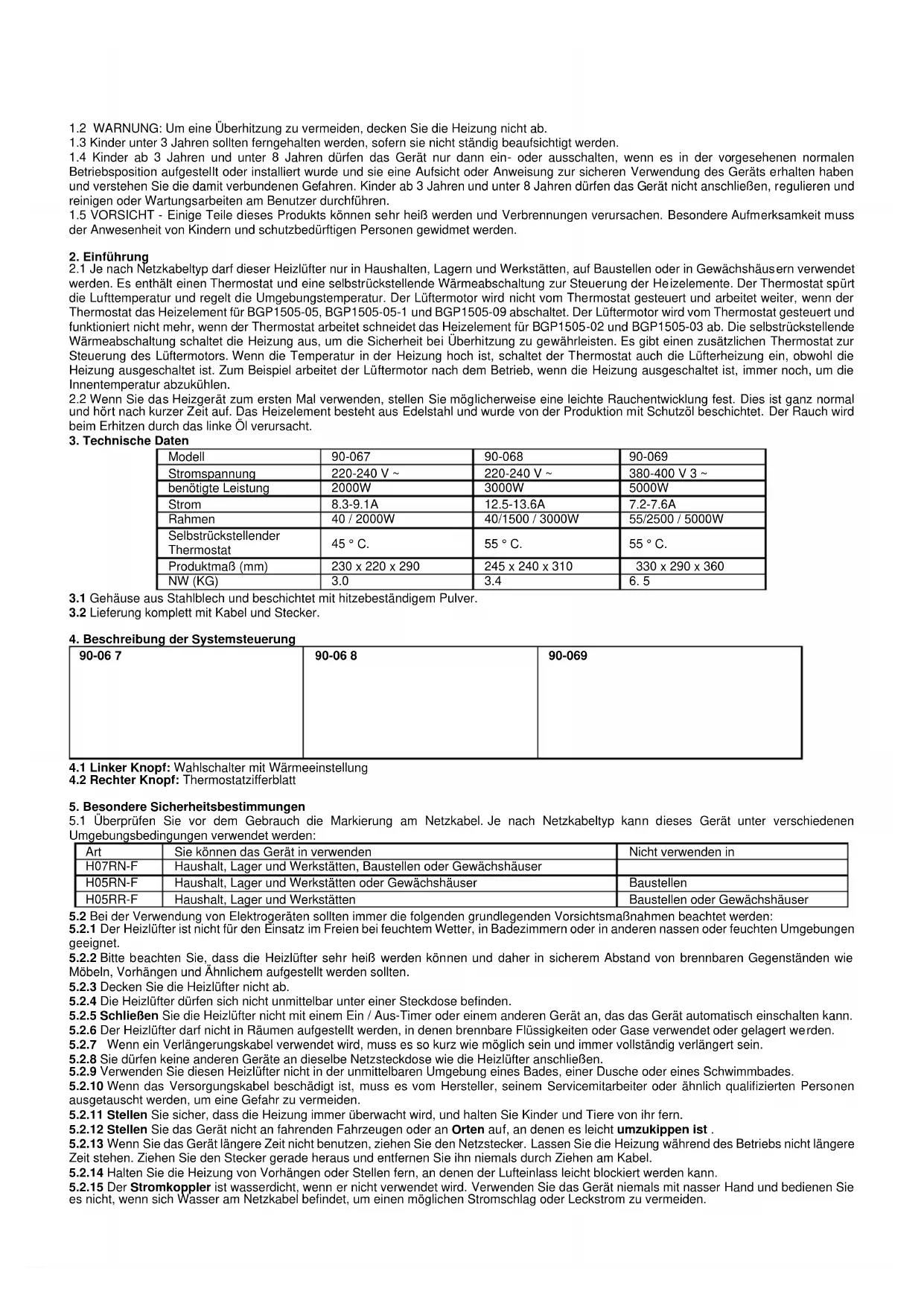 LÜFTERHEIZUNGEN 90-067 / 90-068 / 90-069 HINWEIS: BEVOR SIE DAS GERÄT ZUM ERSTEN MAL VERWENDEN, LESEN SIE DIESE BEDIENUNGSANLEITUNG UND BEWAHREN SIE SIE FÜR ZUKÜNFTIGE VERWEISE AUF. MENSCHEN, DIE DIESE ANWEISUNG NICHT GELESEN HABEN, DÜRFEN DAS GERÄT