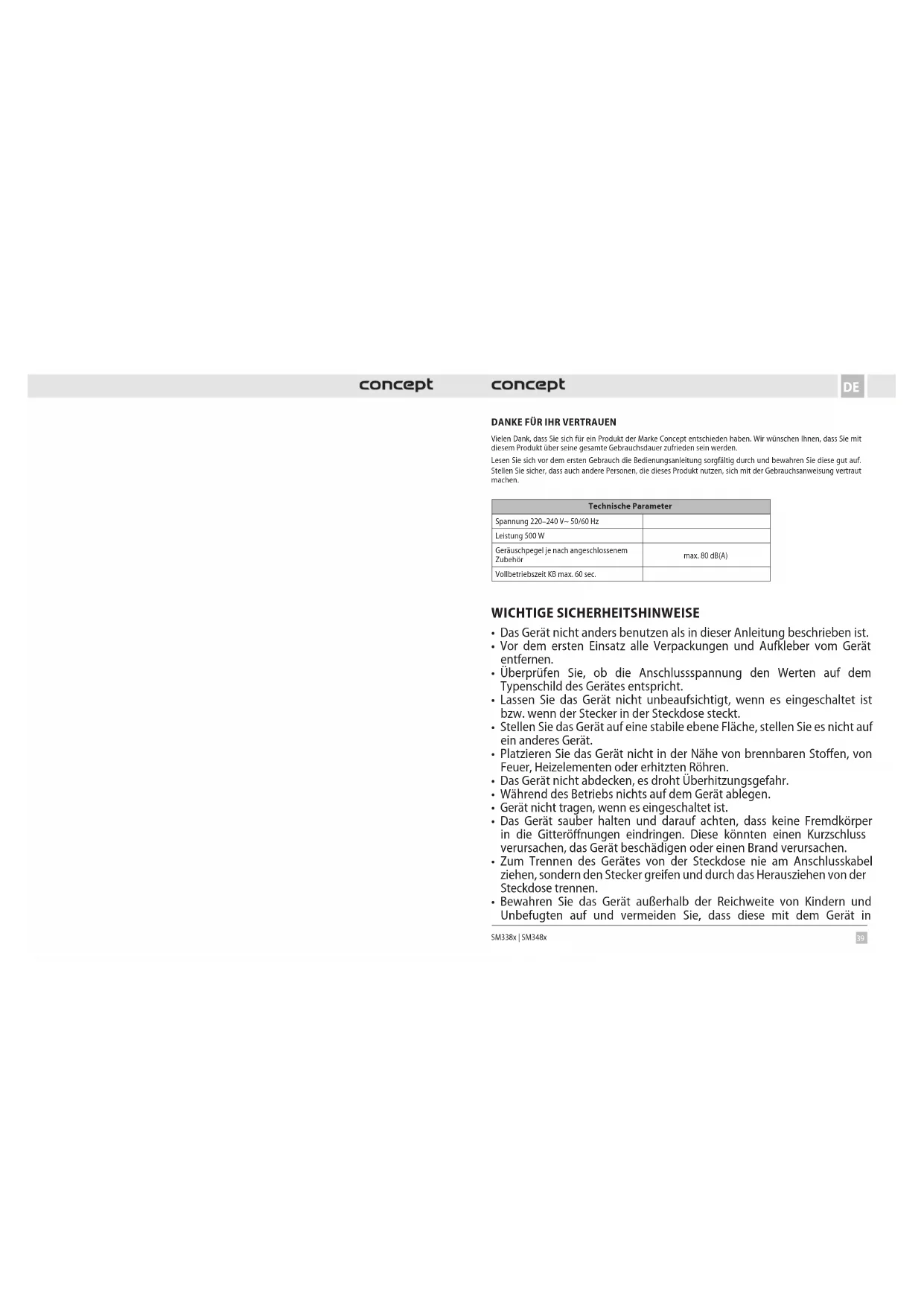 Vielen Dank, dass Sie sich für ein Produkt der Marke Concept entschieden haben. Wir wünschen Ihnen, dass Sie mit diesem Produkt über seine gesamte Gebrauchsdauer zufrieden sein werden. Lesen Sie sich vor dem ersten Gebrauch die Bedienungsanleitung sorgfältig durch und bewahren Sie diese gut auf. Stellen Sie sicher, dass auch andere Personen, die dieses Produkt nutzen, sich mit der Gebrauchsanweisung vertraut machen. Technische Parameter Spannung 220–240 V~ 50/60 Hz Leistung 500 W Geräuschpegel je nach angeschlossenem Zubehör max. 80 dB(A) Vollbetriebszeit KB max. 60 sec. WICHTIGE SICHERHEITSHINWEISE