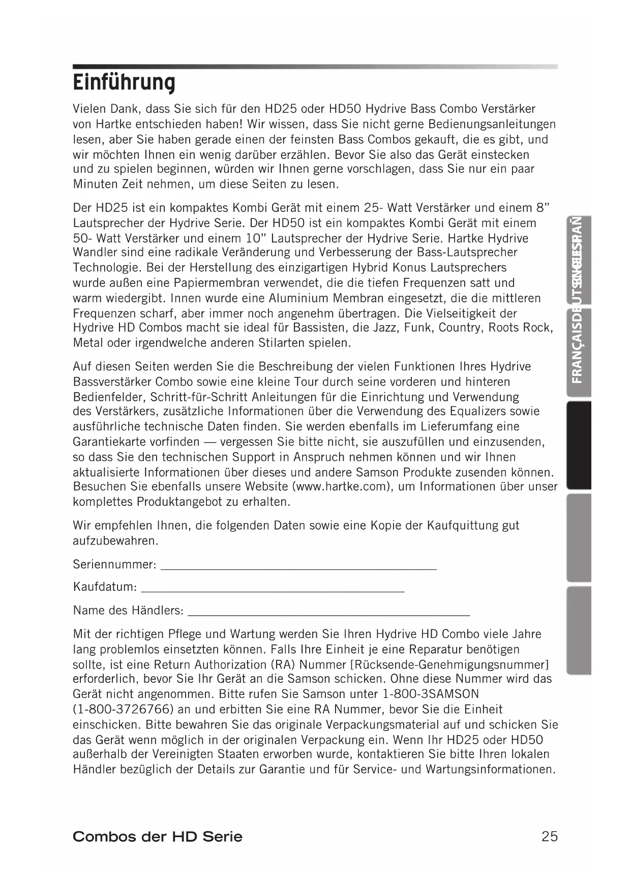 Wandler sind eine radikale Veränderung und Verbesserung der Bass-Lautsprecher Technologie. Bei der Herstellung des einzigartigen Hybrid Konus Lautsprechers wurde außen eine Papiermembran verwendet, die die tiefen Frequenzen satt und warm wiedergibt. Innen wurde eine Aluminium Membran eingesetzt, die die mittleren Frequenzen scharf, aber immer noch angenehm übertragen. Die Vielseitigkeit der Hydrive HD Combos macht sie ideal für Bassisten, die Jazz, Funk, Country, Roots Rock, Metal oder irgendwelche anderen Stilarten spielen. Auf diesen Seiten werden Sie die Beschreibung der vielen Funktionen Ihres Hydrive Bassverstärker Combo sowie eine kleine Tour durch seine vorderen und hinteren Bedienfelder, Schritt-für-Schritt Anleitungen für die Einrichtung und Verwendung des Verstärkers, zusätzliche Informationen über die Verwendung des Equalizers sowie ausführliche technische Daten finden. Sie werden ebenfalls im Lieferumfang eine Garantiekarte vorfinden — vergessen Sie bitte nicht, sie auszufüllen und einzusenden, so dass Sie den technischen Support in Anspruch nehmen können und wir Ihnen aktualisierte Informationen über dieses und andere Samson Produkte zusenden können. Besuchen Sie ebenfalls unsere Website (www.hartke.com), um Informationen über unser komplettes Produktangebot zu erhalten. Wir empfehlen Ihnen, die folgenden Daten sowie eine Kopie der Kaufquittung gut aufzubewahren. Seriennummer: ____________________________________________ Kaufdatum: __________________________________________ Name des Händlers: _____________________________________________ Mit der richtigen Pflege und Wartung werden Sie Ihren Hydrive HD Combo viele Jahre lang problemlos einsetzten können. Falls Ihre Einheit je eine Reparatur benötigen sollte, ist eine Return Authorization (RA) Nummer [Rücksende-Genehmigungsnummer] erforderlich, bevor Sie Ihr Gerät an die Samson schicken. Ohne diese Nummer wird das Gerät nicht angenommen. Bitte rufen Sie Samson unter 1-800-3SAMSON (1-800-3726766) an und erbitten Sie eine RA Nummer, bevor Sie die Einheit einschicken. Bitte bewahren Sie das originale Verpackungsmaterial auf und schicken Sie das Gerät wenn möglich in der originalen Verpackung ein. Wenn Ihr HD25 oder HD50 außerhalb der Vereinigten Staaten erworben wurde, kontaktieren Sie bitte Ihren lokalen Händler bezüglich der Details zur Garantie und für Service- und Wartungsinformationen. Einführung26 Die Hartke HD Serie bietet die neueste Lautsprecher Technologie sowie einen robusten Verstärker in einer extrem kompakten Größe und zu erschwinglichen Preisen. Hier sind einige der wichtigsten Funktionen / Eigenschaften: