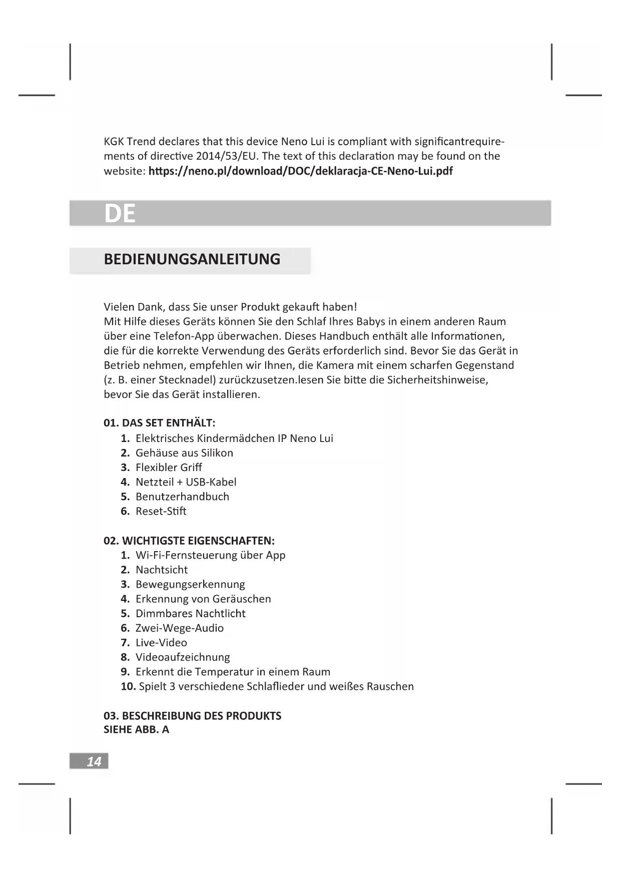 BEDIENUNGSANLEITUNG KGK Trend declares that this device Neno Lui is compliant with signicantrequire- ments of direcve 2014/53/EU. The text of this declaraon may be found on the website: hps://neno.pl/download/DOC/deklaracja-CE-Neno-Lui.pdf Vielen Dank, dass Sie unser Produkt gekau haben! Mit Hilfe dieses Geräts können Sie den Schlaf Ihres Babys in einem anderen Raum über eine Telefon-App überwachen. Dieses Handbuch enthält alle Informaonen, die für die korrekte Verwendung des Geräts erforderlich sind. Bevor Sie das Gerät in Betrieb nehmen, empfehlen wir Ihnen, die Kamera mit einem scharfen Gegenstand (z. B. einer Stecknadel) zurückzusetzen.lesen Sie bie die Sicherheitshinweise, bevor Sie das Gerät installieren.