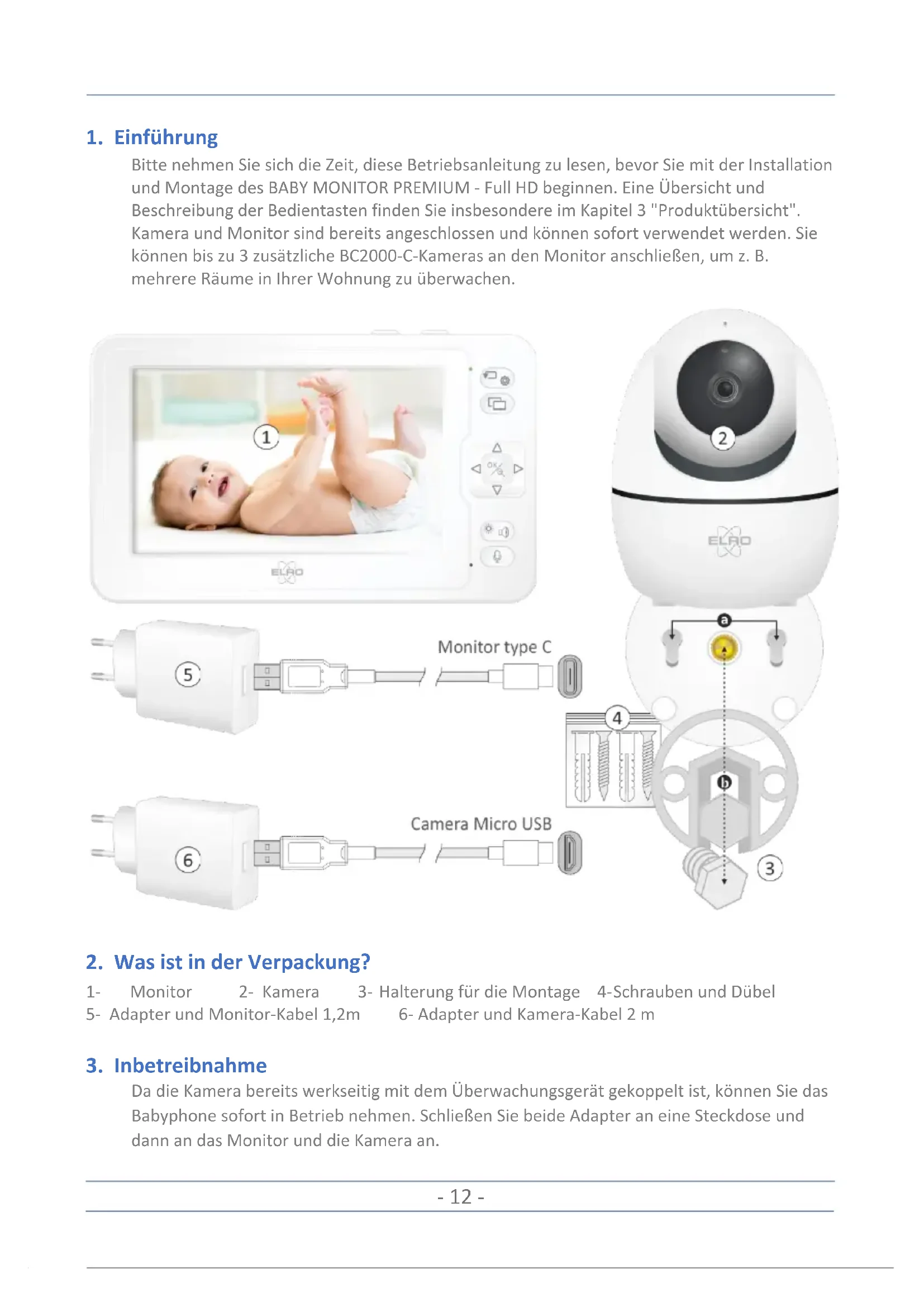 Bitte nehmen Sie sich die Zeit, diese Betriebsanleitung zu lesen, bevor Sie mit der Installation und Montage des BABY MONITOR PREMIUM - Full HD beginnen. Eine Übersicht und Beschreibung der Bedientasten finden Sie insbesondere im Kapitel 3 "Produktübersicht". Kamera und Monitor sind bereits angeschlossen und können sofort verwendet werden. Sie können bis zu 3 zusätzliche BC2000-C-Kameras an den Monitor anschließen, um z. B. mehrere Räume in Ihrer Wohnung zu überwachen.