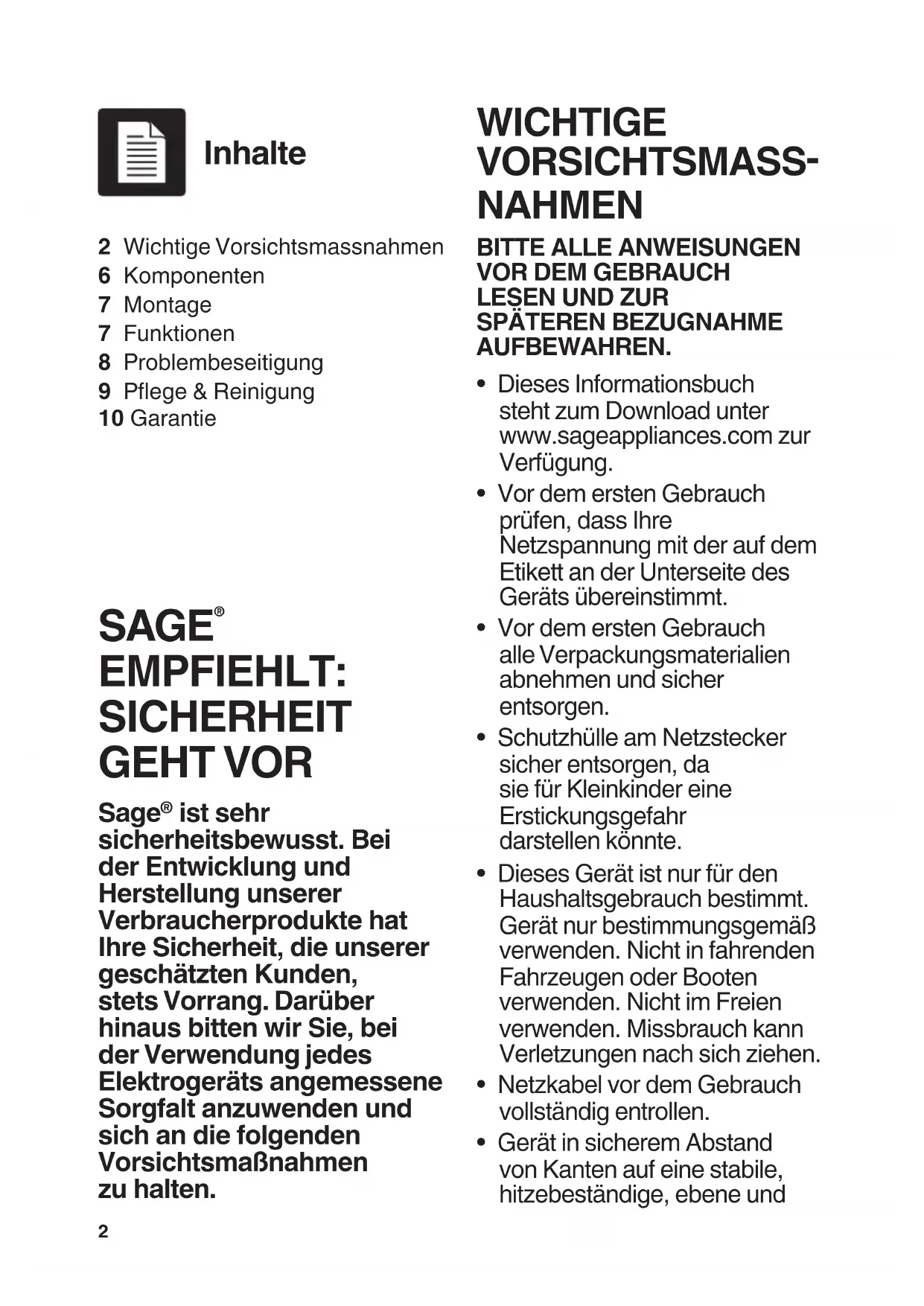 - Dieses Informationsbuch steht zum Download unter www.sageappliances.com zur Verfügung.