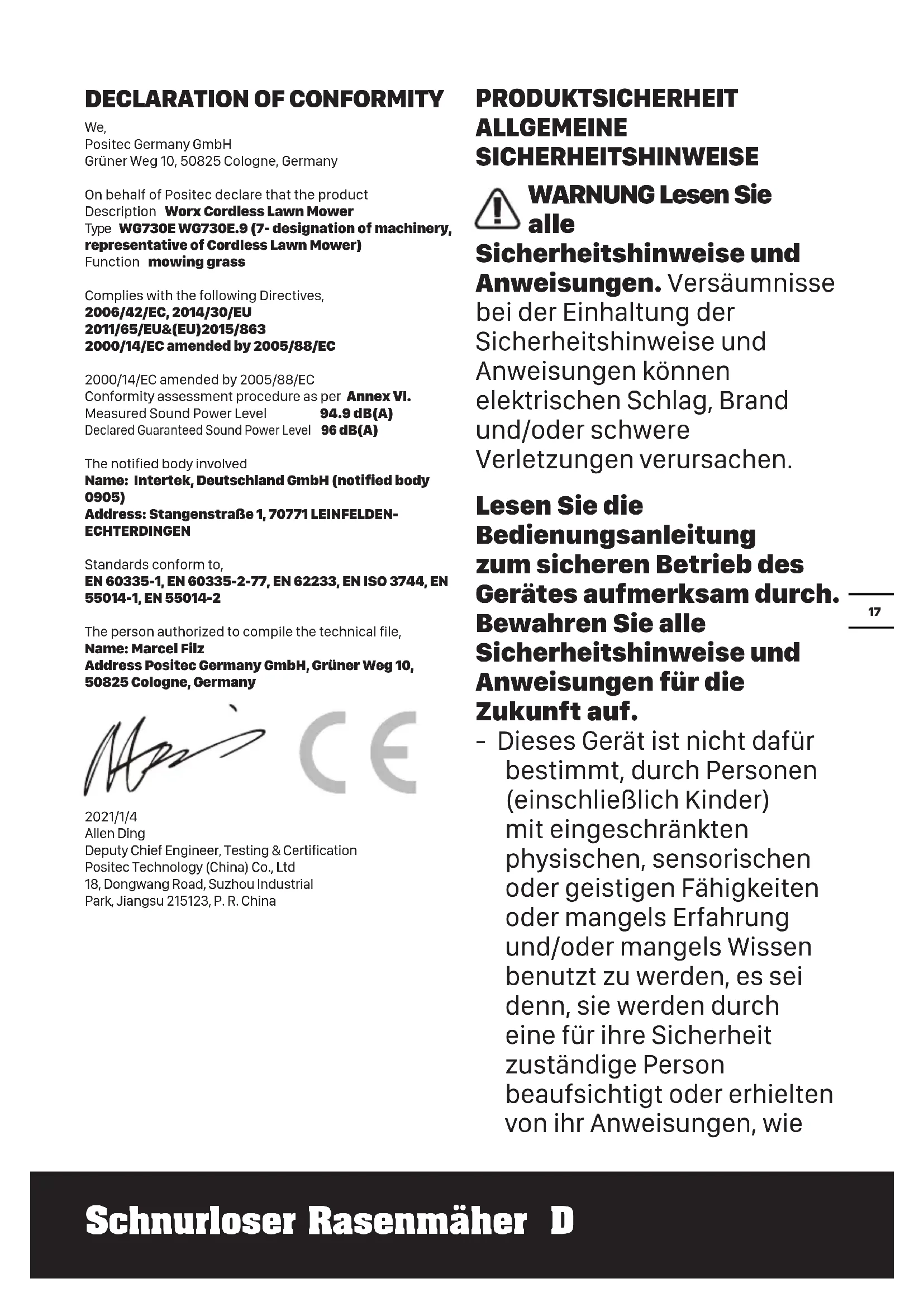 We, Positec Germany GmbH Grüner Weg 10, 50825 Cologne, Germany On behalf of Positec declare that the product Description Worx Cordless Lawn Mower Type WG730E WG730E.9 (7- designation of machinery, representative of Cordless Lawn Mower) Function mowing grass Complies with the following Directives, 2006/42/EC, 2014/30/EU 2011/65/EU&(EU)2015/863 2000/14/EC amended by 2005/88/EC 2000/14/EC amended by 2005/88/EC Conformity assessment procedure as per Annex VI. Measured Sound Power Level 94.9 dB(A) Declared Guaranteed Sound Power Level 96 dB(A) The notified body involved Name: Intertek, Deutschland GmbH (notified body 0905) Address: Stangenstraße 1, 70771 LEINFELDEN- ECHTERDINGEN Standards conform to, EN 60335-1, EN 60335-2-77, EN 62233, EN ISO 3744, EN 55014-1, EN 55014-2 The person authorized to compile the technical file, Name: Marcel Filz Address Positec Germany GmbH, Grüner Weg 10, 50825 Cologne, Germany 2021/1/4 Allen Ding Deputy Chief Engineer, Testing & Certification Positec Technology (China) Co., Ltd 18, Dongwang Road, Suzhou Industrial Park, Jiangsu 215123, P. R. China PRODUKTSICHERHEIT ALLGEMEINE SICHERHEITSHINWEISE WARNUNG Lesen Sie alle Sicherheitshinweise und Anweisungen. Versäumnisse bei der Einhaltung der Sicherheitshinweise und Anweisungen können elektrischen Schlag, Brand und/oder schwere Verletzungen verursachen. Lesen Sie die Bedienungsanleitung zum sicheren Betrieb des Gerätes aufmerksam durch. Bewahren Sie alle Sicherheitshinweise und Anweisungen für die Zukunft auf. - Dieses Gerät ist nicht dafür bestimmt, durch Personen (einschließlich Kinder) mit eingeschränkten physischen, sensorischen oder geistigen Fähigkeiten oder mangels Erfahrung und/oder mangels Wissen benutzt zu werden, es sei denn, sie werden durch eine für ihre Sicherheit zuständige Person beaufsichtigt oder erhielten von ihr Anweisungen, wie18 Schnurloser Rasenmäher D das Gerät zu benutzen ist. - Kinder sollten beaufsichtigt werden um Sicherzustellen, dass sie nicht mit dem Ladegerät spielen. - Das Gerät darf nur mit dem mitgelieferten Netzteil verwendet werden. WICHTIG