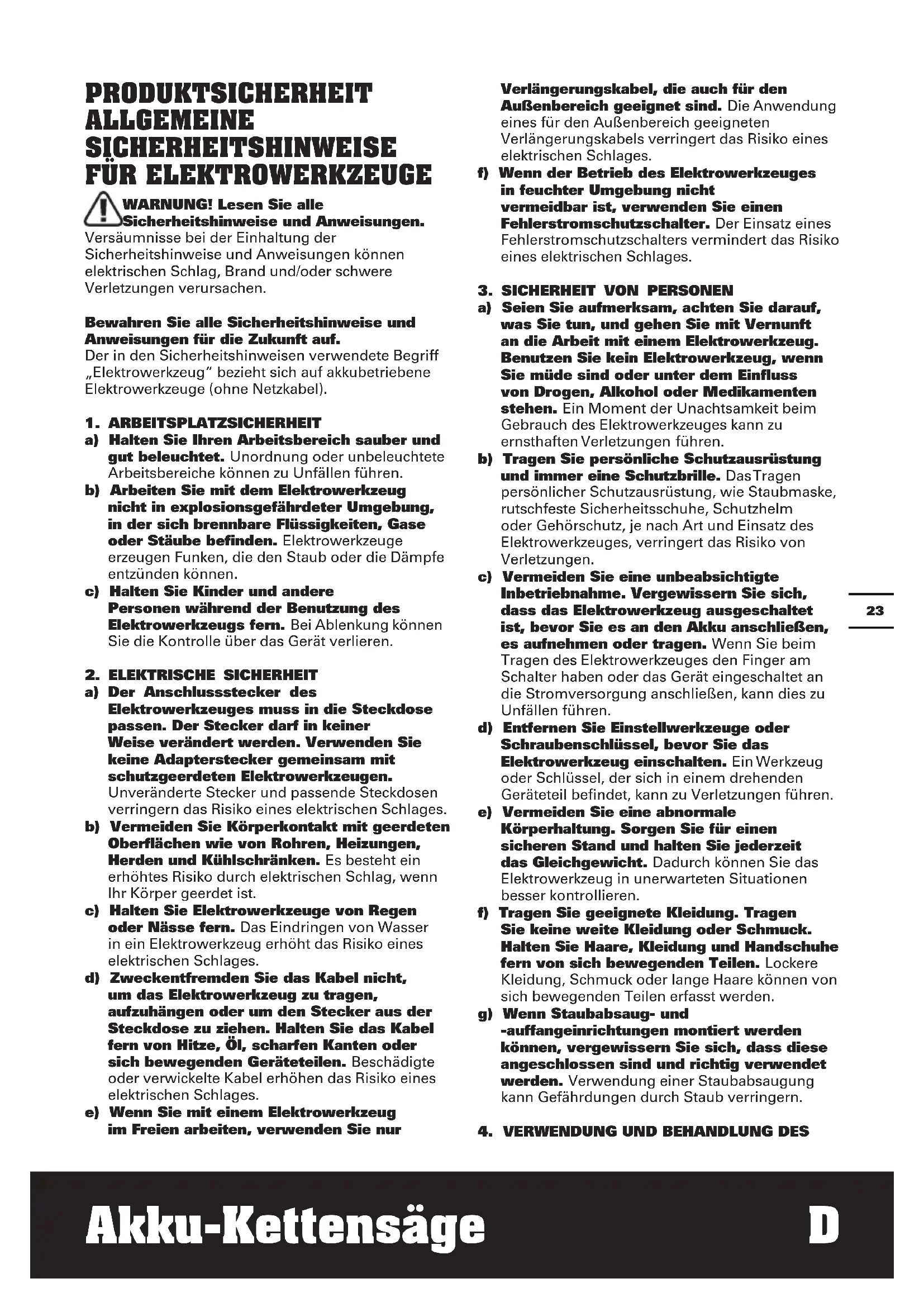 Akku-Kettensäge D ELEKTROWERKZEUGES a) Überlasten Sie das Gerät nicht. Verwenden Sie für Ihre Arbeit das dafür bestimmte Elektrowerkzeug. Mit dem passenden Elektrowerkzeug arbeiten Sie besser und sicherer im angegebenen Leistungsbereich. b) Benutzen Sie kein Elektrowerkzeug, dessen Schalter defekt ist. Ein Elektrowerkzeug, das sich nicht mehr ein- oder ausschalten lässt, ist gefährlich und muss repariert werden. c) Entfernen Sie den Akku, bevor Sie Geräteeinstellungen vornehmen, Zubehörteile wechseln oder das Gerät weglegen. Diese Vorsichtsmaßnahme verhindert den unbeabsichtigten Start des Elektrowerkzeuges. d) Bewahren Sie unbenutzte Elektrowerkzeuge außerhalb der Reichweite von Kindern auf. Lassen Sie Personen das Gerät nicht benutzen, die mit diesem nicht vertraut sind oder diese Anweisungen nicht gelesen haben. Elektrowerkzeuge sind gefährlich, wenn Sie von unerfahrenen Personen benutzt werden. e) Pflegen Sie Elektrowerkzeuge mit Sorgfalt. Kontrollieren Sie, ob bewegliche Teile einwandfrei funktionieren und nicht klemmen, ob Teile gebrochen oder so beschädigt sind, dass die Funktion des Elektrowerkzeuges beeinträchtigt ist. Lassen Sie beschädigte Teile vor dem Einsatz des Gerätes reparieren. Viele Unfälle haben ihre Ursache in schlecht gewarteten Elektrowerkzeugen. f) Halten Sie Schneidwerkzeuge scharf und sauber. Sorgfältig gepflegte Schneidwerkzeuge mit scharfen Schneidkanten verklemmen sich weniger und sind leichter zu führen. g) Verwenden Sie Elektrowerkzeug, Zubehör, Einsatzwerkzeuge usw. entsprechend diesen Anweisungen. Berücksichtigen Sie dabei die Arbeitsbedingungen und die auszuführende Tätigkeit. Der Gebrauch von Elektrowerkzeugen für andere als die vorgesehenen Anwendungen kann zu gefährlichen Situationen führen.