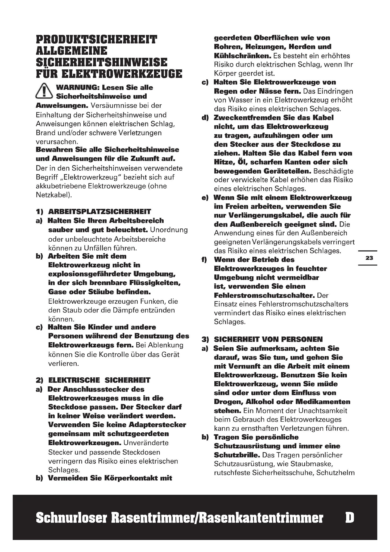 a) Seien Sie aufmerksam, achten Sie darauf, was Sie tun, und gehen Sie mit Vernunft an die Arbeit mit einem Elektrowerkzeug. Benutzen Sie kein Elektrowerkzeug, wenn Sie müde sind oder unter dem Einfluss von Drogen, Alkohol oder Medikamenten stehen. Ein Moment der Unachtsamkeit beim Gebrauch des Elektrowerkzeuges kann zu ernsthaften Verletzungen führen. b) Tragen Sie persönliche Schutzausrüstung und immer eine Schutzbrille. Das Tragen persönlicher Schutzausrüstung, wie Staubmaske, rutschfeste Sicherheitsschuhe, Schutzhelm24 Schnurloser Rasentrimmer/Rasenkantentrimmer