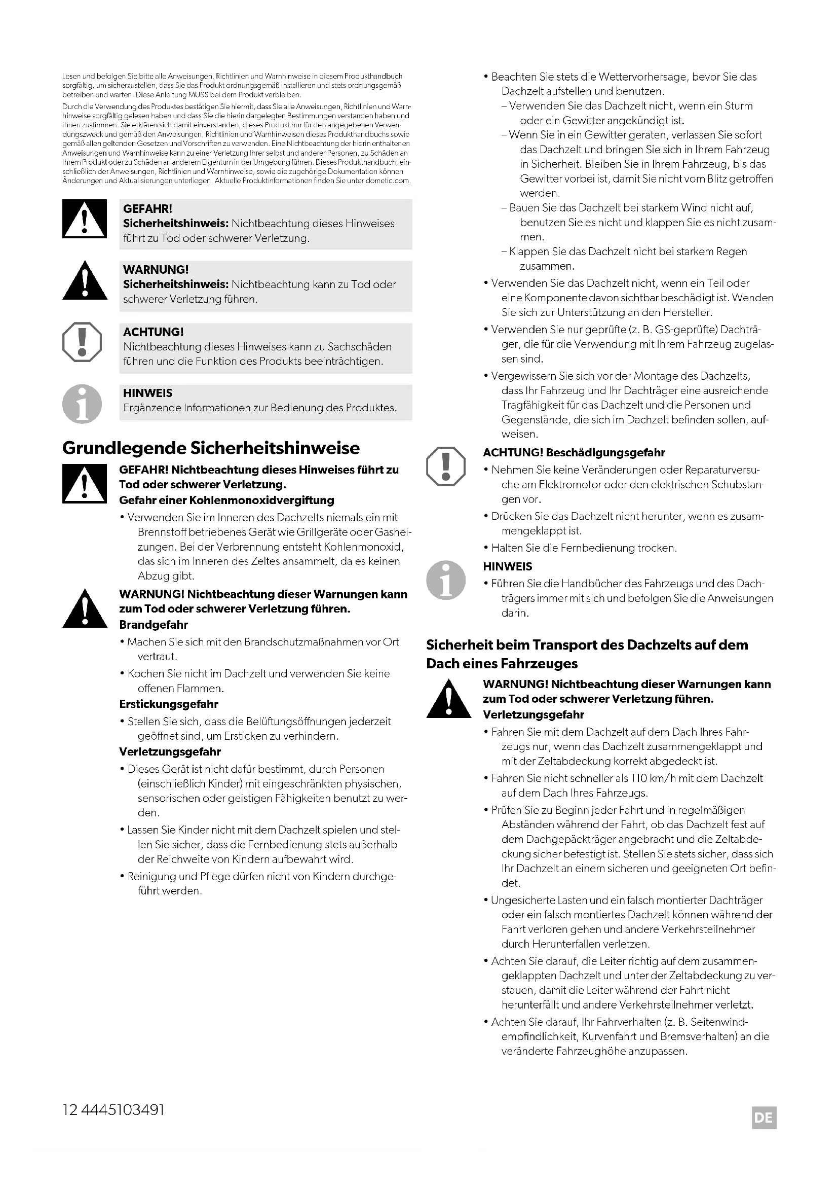 - Beachten Sie stets die Wettervorhersage, bevor Sie das Dachzelt aufstellen und benutzen. – Verwenden Sie das Dachzelt nicht, wenn ein Sturm oder ein Gewitter angekündigt ist. – Wenn Sie in ein Gewitter geraten, verlassen Sie sofort das Dachzelt und bringen Sie sich in Ihrem Fahrzeug in Sicherheit. Bleiben Sie in Ihrem Fahrzeug, bis das Gewitter vorbei ist, damit Sie nicht vom Blitz getroffen werden. – Bauen Sie das Dachzelt bei starkem Wind nicht auf, benutzen Sie es nicht und klappen Sie es nicht zusam- men. – Klappen Sie das Dachzelt nicht bei starkem Regen zusammen.