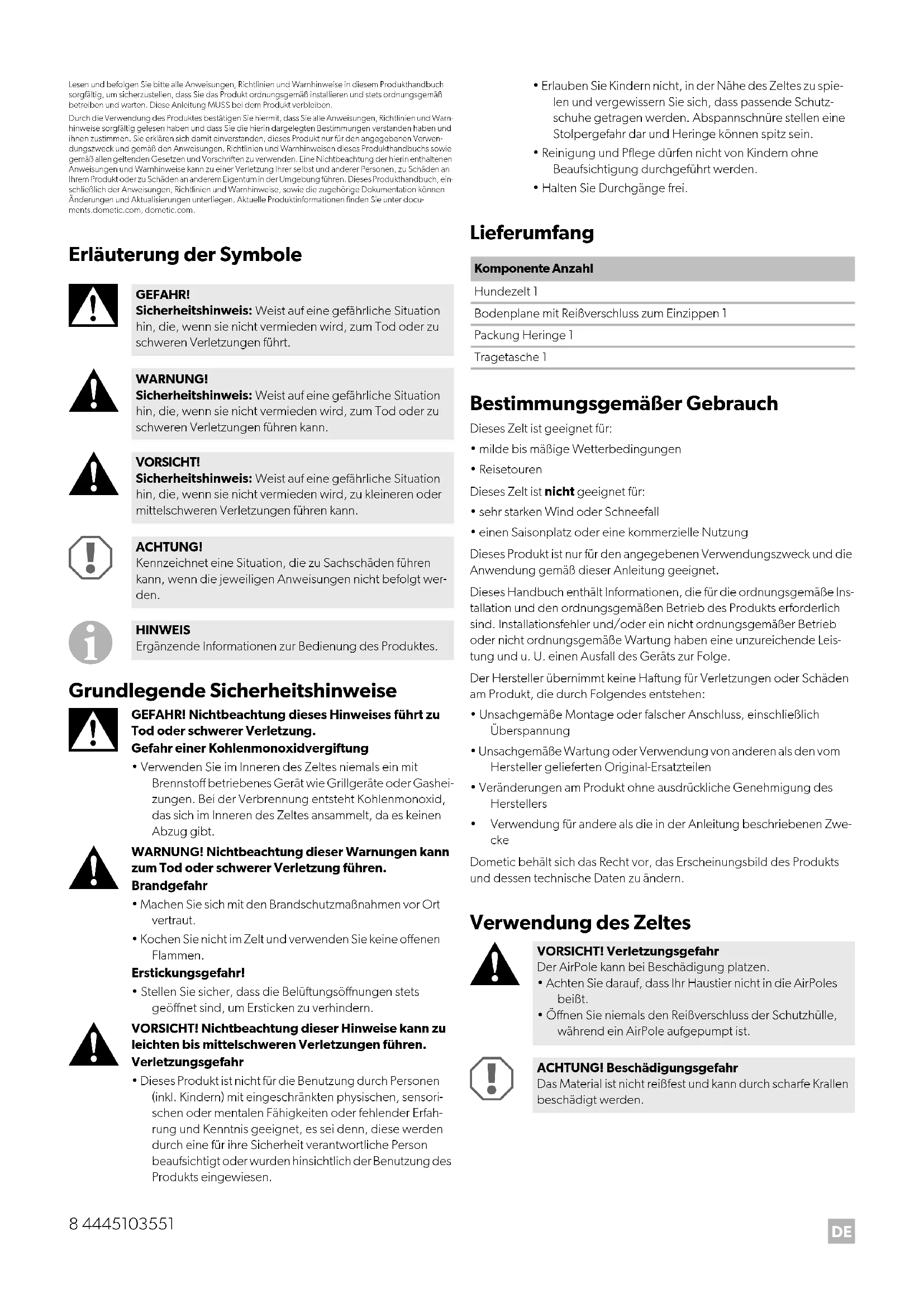 GEFAHR! Sicherheitshinweis: Weist auf eine gefährliche Situation hin, die, wenn sie nicht vermieden wird, zum Tod oder zu schweren Verletzungen führt. WARNUNG! Sicherheitshinweis: Weist auf eine gefährliche Situation hin, die, wenn sie nicht vermieden wird, zum Tod oder zu schweren Verletzungen führen kann. VORSICHT! Sicherheitshinweis: Weist auf eine gefährliche Situation hin, die, wenn sie nicht vermieden wird, zu kleineren oder mittelschweren Verletzungen führen kann. ACHTUNG! Kennzeichnet eine Situation, die zu Sachschäden führen kann, wenn die jeweiligen Anweisungen nicht befolgt wer- den. HINWEIS Ergänzende Informationen zur Bedienung des Produktes. Komponente Anzahl Hundezelt 1 Bodenplane mit Reißverschluss zum Einzippen 1 Packung Heringe 1 Tragetasche 1 VORSICHT! Verletzungsgefahr Der AirPole kann bei Beschädigung platzen.