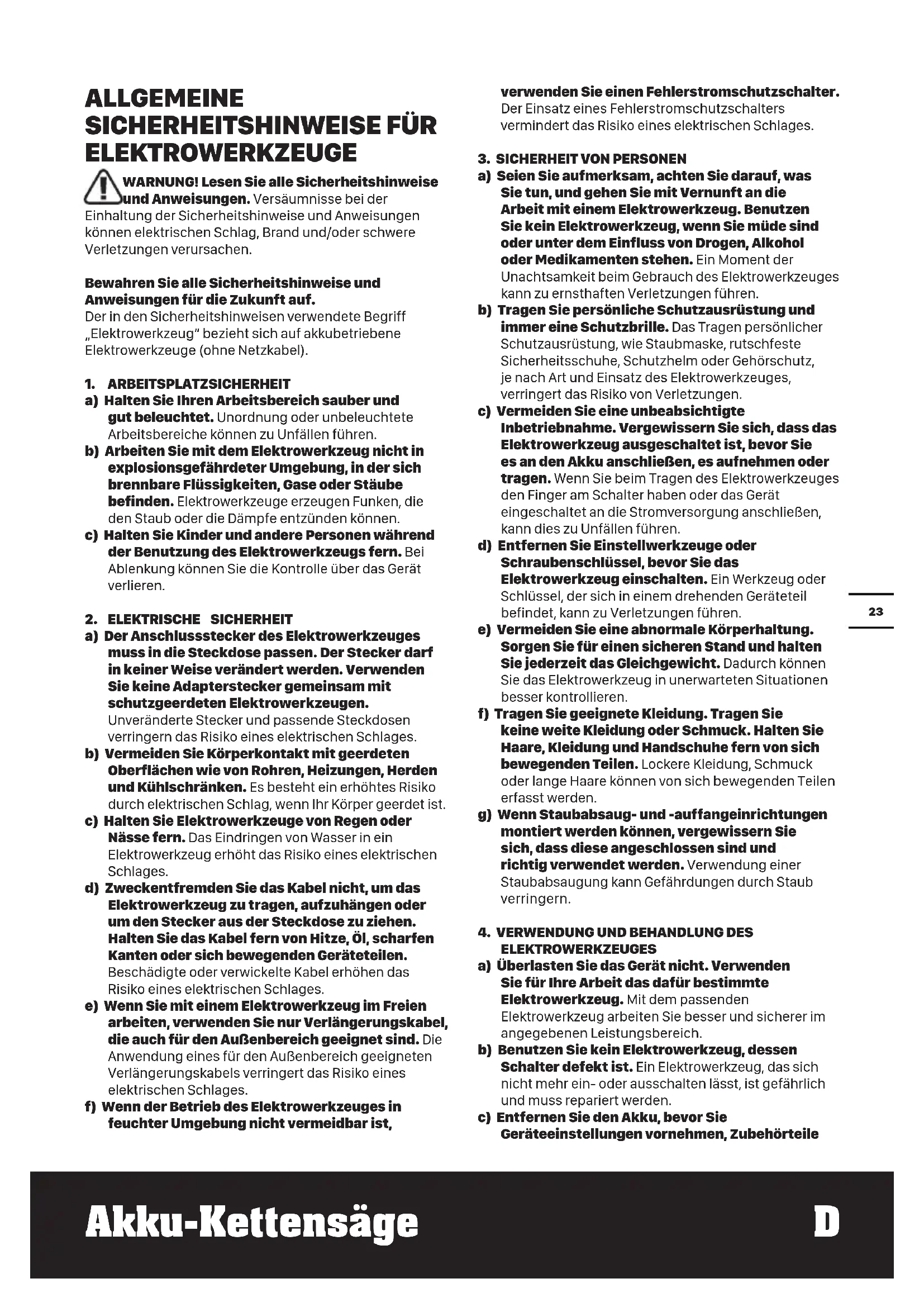 ELEKTROWERKZEUGES a) Überlasten Sie das Gerät nicht. Verwenden Sie für Ihre Arbeit das dafür bestimmte Elektrowerkzeug. Mit dem passenden Elektrowerkzeug arbeiten Sie besser und sicherer im angegebenen Leistungsbereich. b) Benutzen Sie kein Elektrowerkzeug, dessen Schalter defekt ist. Ein Elektrowerkzeug, das sich nicht mehr ein- oder ausschalten lässt, ist gefährlich und muss repariert werden. c) Entfernen Sie den Akku, bevor Sie Geräteeinstellungen vornehmen, Zubehörteile24 Akku-Kettensäge D wechseln oder das Gerät weglegen. Diese Vorsichtsmaßnahme verhindert den unbeabsichtigten Start des Elektrowerkzeuges. d) Bewahren Sie unbenutzte Elektrowerkzeuge außerhalb der Reichweite von Kindern auf. Lassen Sie Personen das Gerät nicht benutzen, die mit diesem nicht vertraut sind oder diese Anweisungen nicht gelesen haben. Elektrowerkzeuge sind gefährlich, wenn Sie von unerfahrenen Personen benutzt werden. e) Pflegen Sie Elektrowerkzeuge mit Sorgfalt. Kontrollieren Sie, ob bewegliche Teile einwandfrei funktionieren und nicht klemmen, ob Teile gebrochen oder so beschädigt sind, dass die Funktion des Elektrowerkzeuges beeinträchtigt ist. Lassen Sie beschädigte Teile vor dem Einsatz des Gerätes reparieren. Viele Unfälle haben ihre Ursache in schlecht gewarteten Elektrowerkzeugen. f) Halten Sie Schneidwerkzeuge scharf und sauber. Sorgfältig gepflegte Schneidwerkzeuge mit scharfen Schneidkanten verklemmen sich weniger und sind leichter zu führen. g) Verwenden Sie Elektrowerkzeug, Zubehör, Einsatzwerkzeuge usw. entsprechend diesen Anweisungen. Berücksichtigen Sie dabei die Arbeitsbedingungen und die auszuführende Tätigkeit. Der Gebrauch von Elektrowerkzeugen für andere als die vorgesehenen Anwendungen kann zu gefährlichen Situationen führen.
