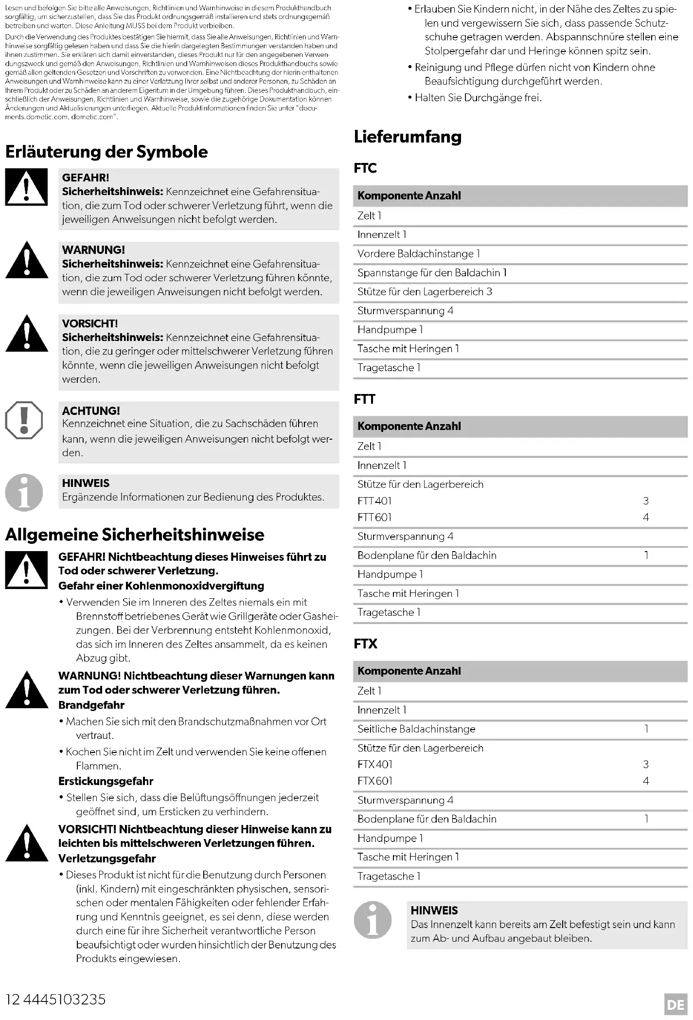 GEFAHR! Sicherheitshinweis: Kennzeichnet eine Gefahrensitua- tion, die zum Tod oder schwerer Verletzung führt, wenn die jeweiligen Anweisungen nicht befolgt werden. WARNUNG! Sicherheitshinweis: Kennzeichnet eine Gefahrensitua- tion, die zum Tod oder schwerer Verletzung führen könnte, wenn die jeweiligen Anweisungen nicht befolgt werden. VORSICHT! Sicherheitshinweis: Kennzeichnet eine Gefahrensitua- tion, die zu geringer oder mittelschwerer Verletzung führen könnte, wenn die jeweiligen Anweisungen nicht befolgt werden. ACHTUNG! Kennzeichnet eine Situation, die zu Sachschäden führen kann, wenn die jeweiligen Anweisungen nicht befolgt wer- den. HINWEIS Ergänzende Informationen zur Bedienung des Produktes. Komponente Anzahl Zelt 1 Innenzelt 1 Vordere Baldachinstange 1 Spannstange für den Baldachin 1 Stütze für den Lagerbereich 3 Sturmverspannung 4 Handpumpe 1 Tasche mit Heringen 1 Tragetasche 1 Komponente Anzahl Zelt 1 Innenzelt 1 Stütze für den Lagerbereich FTT401 FTT601
