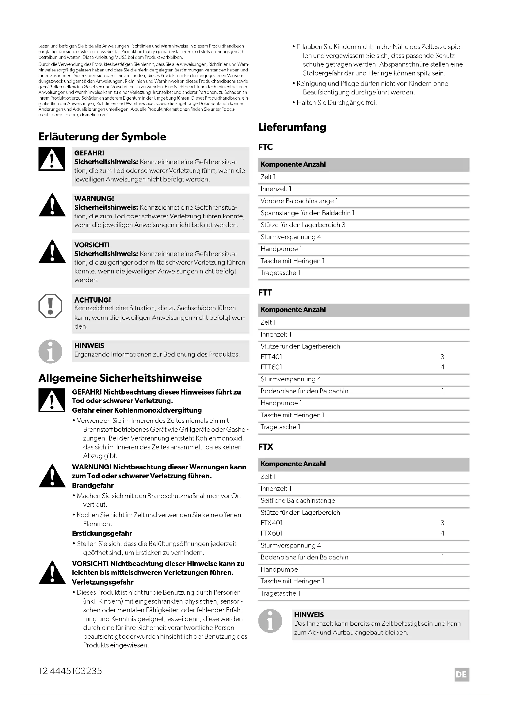GEFAHR! Sicherheitshinweis: Kennzeichnet eine Gefahrensitua- tion, die zum Tod oder schwerer Verletzung führt, wenn die jeweiligen Anweisungen nicht befolgt werden. WARNUNG! Sicherheitshinweis: Kennzeichnet eine Gefahrensitua- tion, die zum Tod oder schwerer Verletzung führen könnte, wenn die jeweiligen Anweisungen nicht befolgt werden. VORSICHT! Sicherheitshinweis: Kennzeichnet eine Gefahrensitua- tion, die zu geringer oder mittelschwerer Verletzung führen könnte, wenn die jeweiligen Anweisungen nicht befolgt werden. ACHTUNG! Kennzeichnet eine Situation, die zu Sachschäden führen kann, wenn die jeweiligen Anweisungen nicht befolgt wer- den. HINWEIS Ergänzende Informationen zur Bedienung des Produktes. Komponente Anzahl Zelt 1 Innenzelt 1 Vordere Baldachinstange 1 Spannstange für den Baldachin 1 Stütze für den Lagerbereich 3 Sturmverspannung 4 Handpumpe 1 Tasche mit Heringen 1 Tragetasche 1 Komponente Anzahl Zelt 1 Innenzelt 1 Stütze für den Lagerbereich FTT401 FTT601