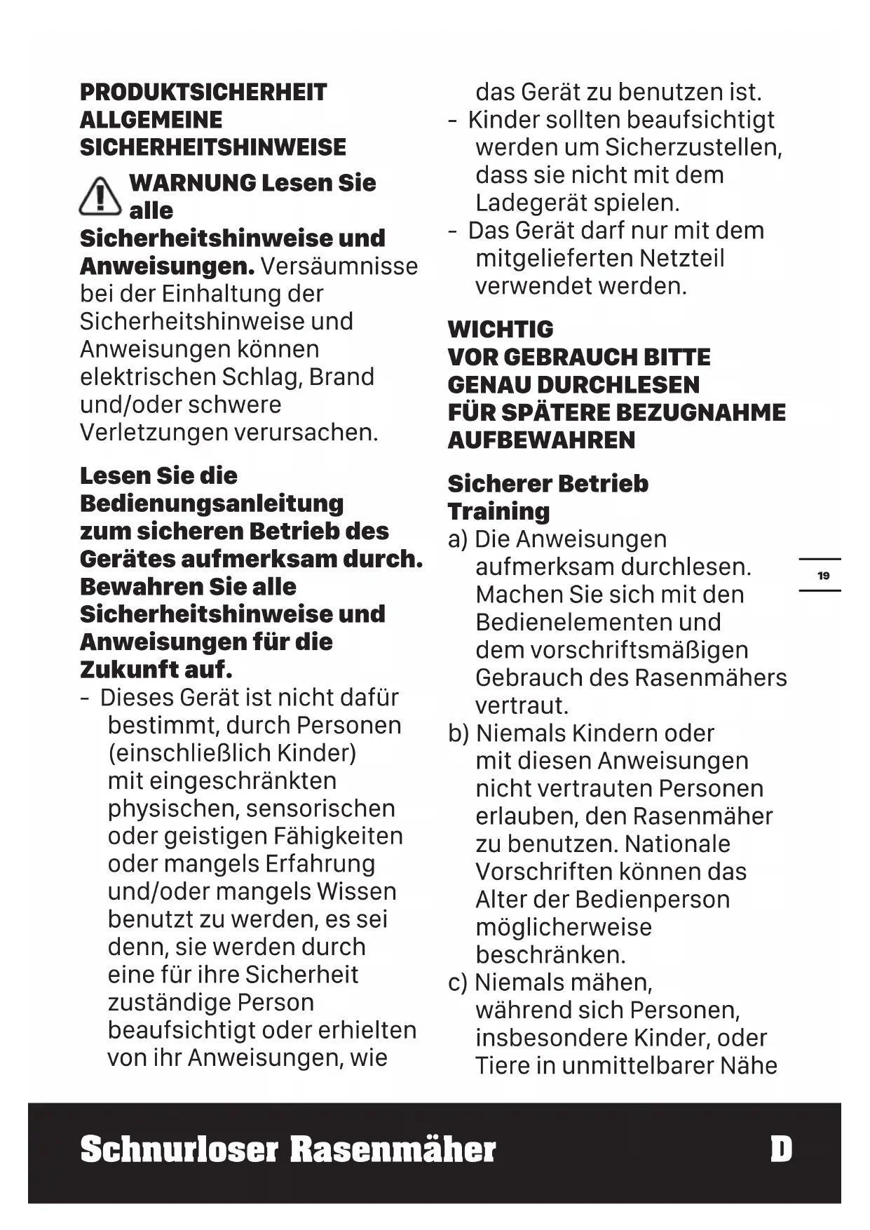 AUFBEWAHREN Sicherer Betrieb Training a) Die Anweisungen aufmerksam durchlesen. Machen Sie sich mit den Bedienelementen und dem vorschriftsmäßigen Gebrauch des Rasenmähers vertraut. b) Niemals Kindern oder mit diesen Anweisungen nicht vertrauten Personen erlauben, den Rasenmäher zu benutzen. Nationale Vorschriften können das Alter der Bedienperson möglicherweise beschränken. c) Niemals mähen, während sich Personen, insbesondere Kinder, oder Tiere in unmittelbarer Nähe20 Schnurloser Rasenmäher D aufhalten. d) Bedenken Sie, dass der Bediener oder Benutzer bei Unfällen oder Gefährdungen anderer Personen oder deren Eigentum die Verantwortung trägt! Vorbereitung a) Tragen Sie beim Mähen stets festes Schuhwerk und eine lange Hose. Den Rasenmäher nicht barfuß oder mit offenen Sandalen benutzen. b) Inspizieren Sie die Gegend, in der die Ausrüstung eingesetzt werden soll, gründlich und entfernen Sie alle Objekte, die durch die Maschine aufgeschleudert werden könnten. c) Vor der Benutzung immer durch Augenschein prüfen, ob Messer, Messerschrauben und Schneidbalken abgenutzt oder beschädigt sind. Abgenutzte Messer und Schrauben nur im ganzen Satz auswechseln, um Unwuchten zu vermeiden. Tauschen Sie beschädigte und unleserliche Etiketten aus. Betrieb a) Nur bei Tageslicht oder gutem künstlichen Licht mähen. b) Nach Möglichkeit nicht in nassem Gras arbeiten. c) Auf schrägen Flächen stets auf sicheren Tritt achten. d) Gehen Sie; rennen Sie niemals mit dem Gerät; e) Mähen Sie bei Rotormaschinen mit Rädern Abhänge niemals auf hinaus oder hinab, sondern immer seitlich am Hang entlang; f) Beim Richtungswechsel an Abhängen äußerst vorsichtig sein. g) Keine besonders steilen Abhänge mähen. h) Beim Rückwärtsgehen oder Ziehen des Rasenmähers äußerst vorsichtig sein.